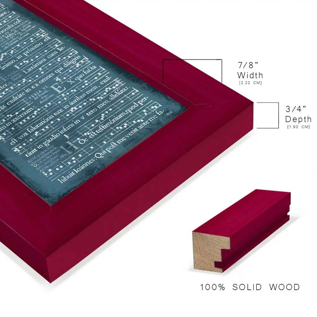 Graphic Songbook I -EZ SWITCH Framed Print w/glass-Cherry Red A delightful, framed print. Featuring a solid wood frame with real wood glass. This premium print is giclee quality. In addition, every frame features a removable back and table top stand. This allows you to change your art in the future or to just stand the art on a table for a new look. We are sure you'll enjoy our new series of EZ SWITCH Framed Art. Solid Wood Frame Real Glass Removable / Replaceable Art Built in Tabletop Stand Sizes range from 4x6 up to 12x15 - buy just one or pair them up as sets as you see fit.
