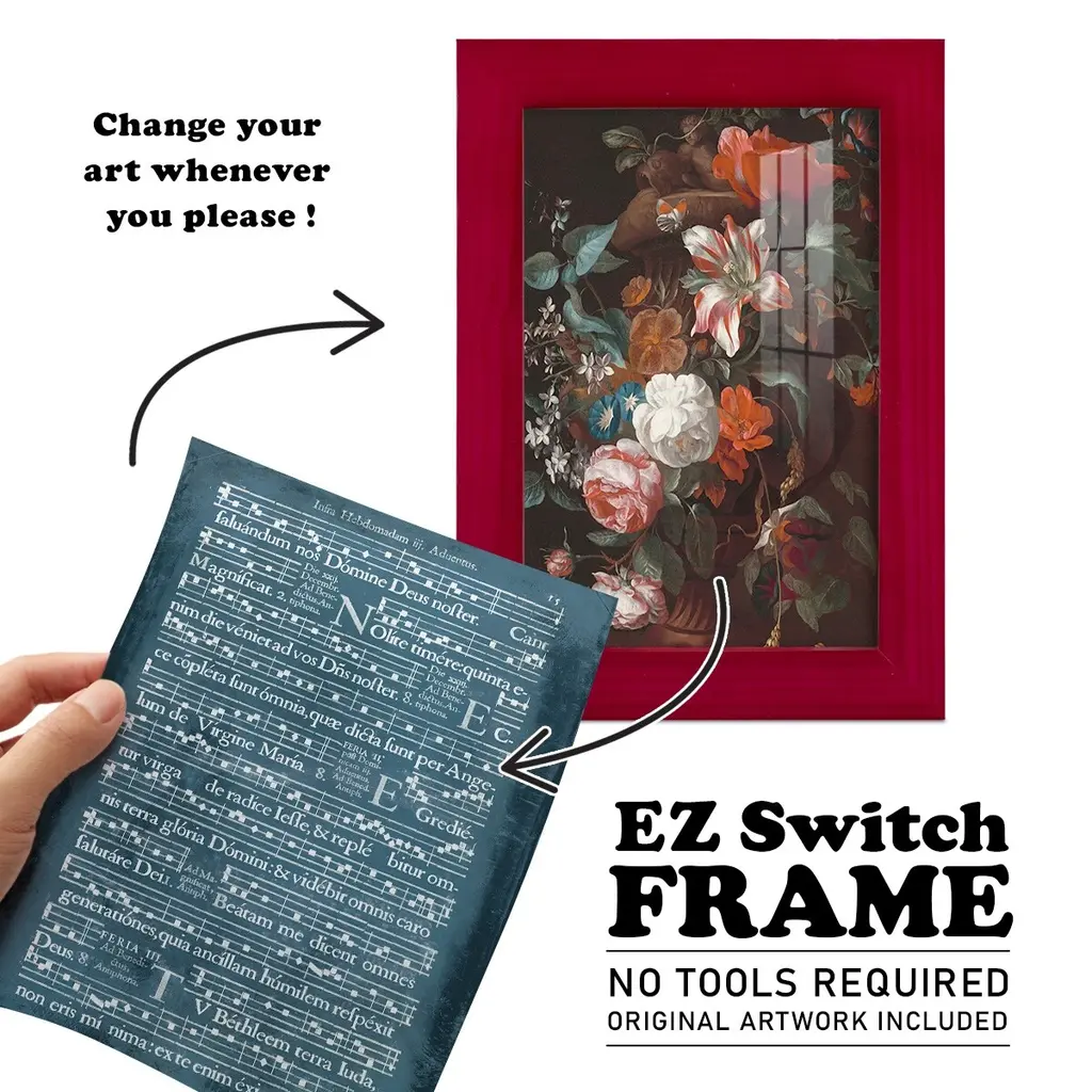 Graphic Songbook II -EZ SWITCH Framed Print w/glass-Cherry Red A delightful, framed print. Featuring a solid wood frame with real wood glass. This premium print is giclee quality. In addition, every frame features a removable back and table top stand. This allows you to change your art in the future or to just stand the art on a table for a new look. We are sure you'll enjoy our new series of EZ SWITCH Framed Art. Solid Wood Frame Real Glass Removable / Replaceable Art Built in Tabletop Stand Sizes range from 4x6 up to 12x15 - buy just one or pair them up as sets as you see fit.