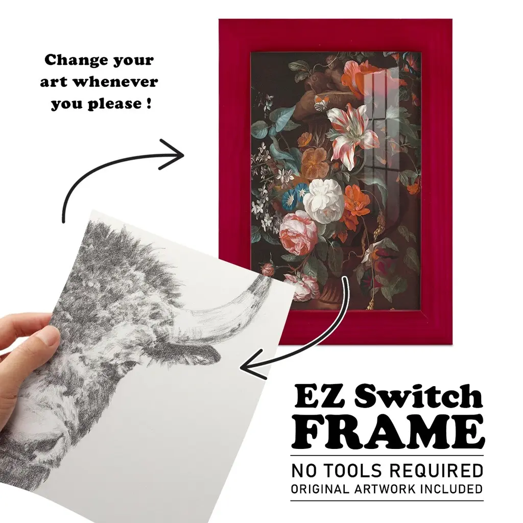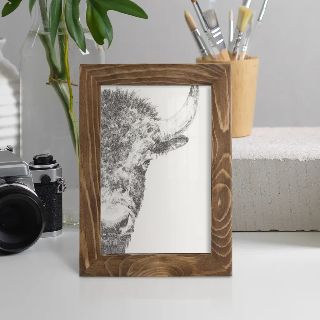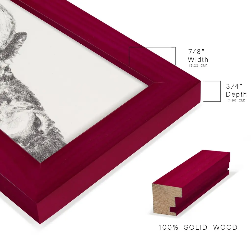 Graphite Bison Portrait II -EZ SWITCH Framed Print w/glass-Cherry Red A delightful, framed print. Featuring a solid wood frame with real wood glass. This premium print is giclee quality. In addition, every frame features a removable back and table top stand. This allows you to change your art in the future or to just stand the art on a table for a new look. We are sure you'll enjoy our new series of EZ SWITCH Framed Art. Solid Wood Frame Real Glass Removable / Replaceable Art Built in Tabletop Stand Sizes range from 4x6 up to 12x15 - buy just one or pair them up as sets as you see fit.