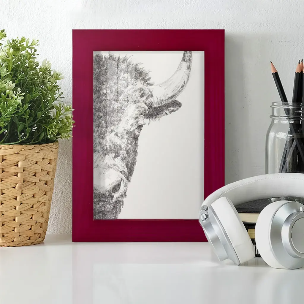 Graphite Bison Portrait II -EZ SWITCH Framed Print w/glass-Cherry Red A delightful, framed print. Featuring a solid wood frame with real wood glass. This premium print is giclee quality. In addition, every frame features a removable back and table top stand. This allows you to change your art in the future or to just stand the art on a table for a new look. We are sure you'll enjoy our new series of EZ SWITCH Framed Art. Solid Wood Frame Real Glass Removable / Replaceable Art Built in Tabletop Stand Sizes range from 4x6 up to 12x15 - buy just one or pair them up as sets as you see fit.