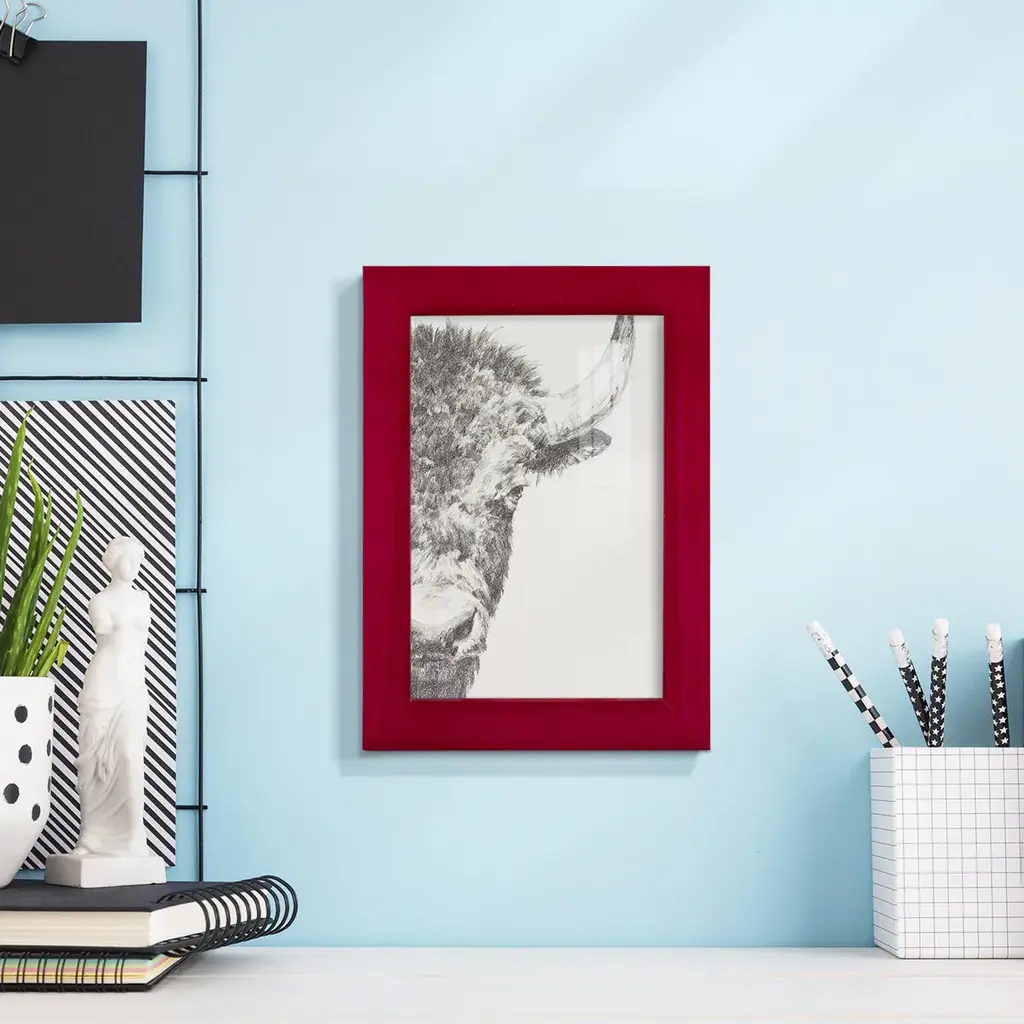 Graphite Bison Portrait II -EZ SWITCH Framed Print w/glass-Cherry Red A delightful, framed print. Featuring a solid wood frame with real wood glass. This premium print is giclee quality. In addition, every frame features a removable back and table top stand. This allows you to change your art in the future or to just stand the art on a table for a new look. We are sure you'll enjoy our new series of EZ SWITCH Framed Art. Solid Wood Frame Real Glass Removable / Replaceable Art Built in Tabletop Stand Sizes range from 4x6 up to 12x15 - buy just one or pair them up as sets as you see fit.