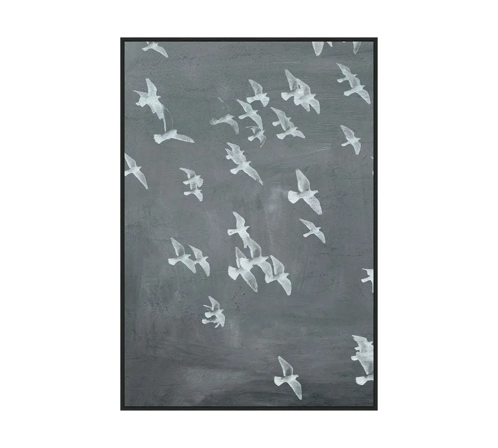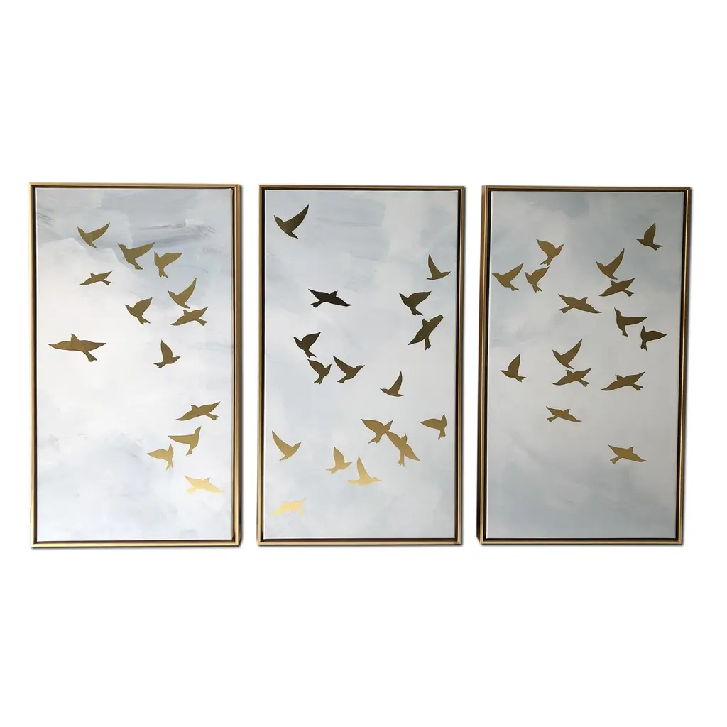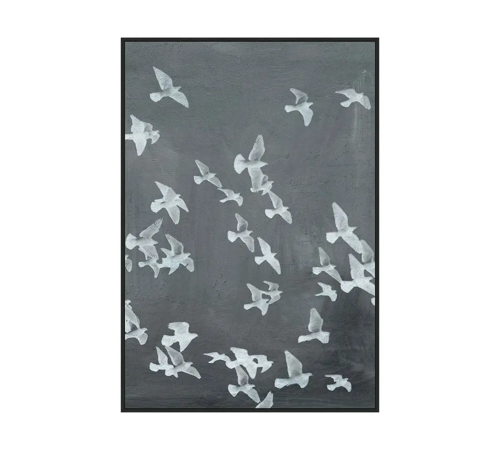 Captured midflight, across the frames, a flock of bright birds strikes a dynamic contrast with the graphite background of this set of two canvasses. A contemporary palette, hand finished by artisans, gives the artwork a sophisticated aura, while allowing it to fit into any style of décor.