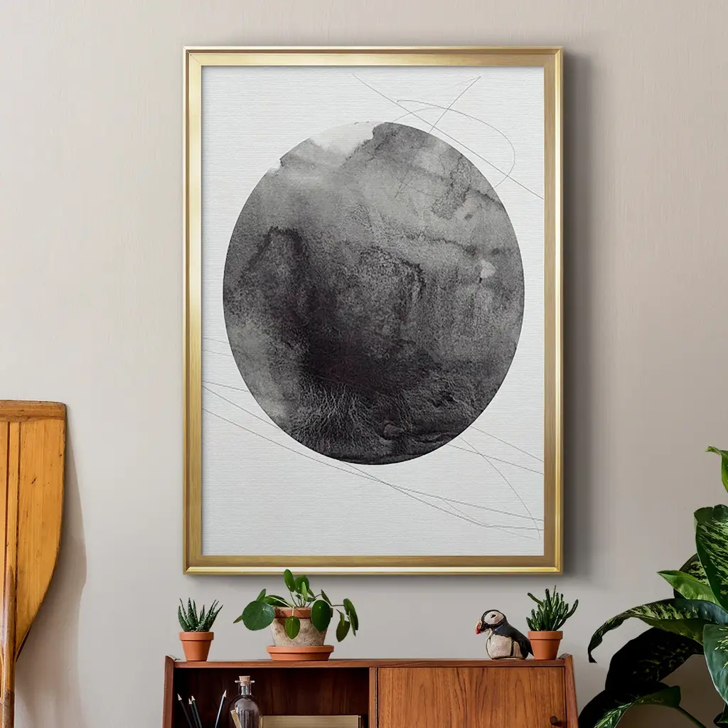 Graphite Moon I Premium Framed Print - Ready to Hang A Premium Framed Print created to last. Framed in distressed wood and available in an array of sizes and colors Featuring a beveled a solid wood stretcher bar, each piece comes ready to hand 4 SIZES AVAILABLE 30.5''X42.5'' - Overall Size 26.5'X36.5'' - Overall Size 22.5''x30.5'' - Overall Size 18.5''x24.5'' - Overall Size Each piece is made to order. Each piece comes with hanging hardware. Made in the USA Ready to Hang