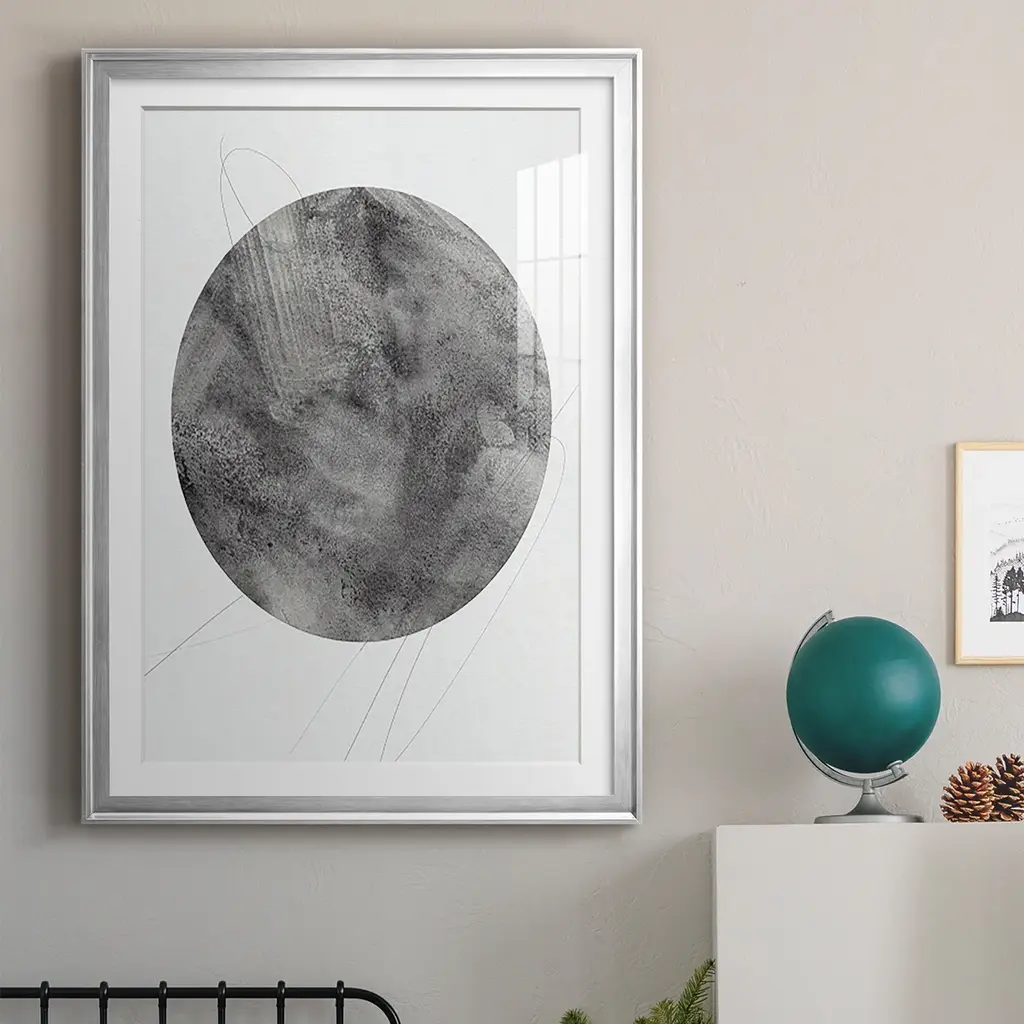 Graphite Moon II Premium Framed Print - Ready to Hang A Premium Framed Print created to last. Framed in distressed wood and available in an array of sizes and colors Featuring a beveled a solid wood stretcher bar, each piece comes ready to hand 4 SIZES AVAILABLE 30.5''X42.5'' - Overall Size 26.5'X36.5'' - Overall Size 22.5''x30.5'' - Overall Size 18.5''x24.5'' - Overall Size Each piece is made to order. Each piece comes with hanging hardware. Made in the USA Ready to Hang Giclee Paper Print Acrylic Glass Beveled Matt Board