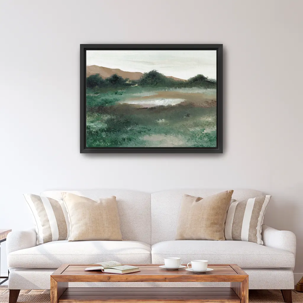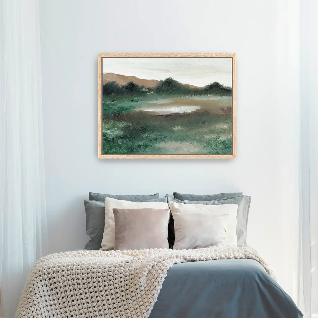 This modern landscape canvas blends soft greens and neutral tones to evoke the peaceful rhythm of nature. Its clean lines and muted palette make it a versatile piece for any room seeking calm and clarity. Our Gallery Wrap Canvas Prints are proudly assembled with high quality materials in California, USA. Each piece is printed on a thick, archival grade canvas using Giclee technology. It is then hand-stretched by our experienced artisans over solid wood bars, which will not warp over time. The final product is a piece personally crafted for you to confidently display on your wall. Care and Assembly: Ensure that the location of your piece has little to no exposure to heat, sunlight, and moisture. Wipe clean, only if needed. Each piece includes hanging hardware to hang on your wall horizontally.