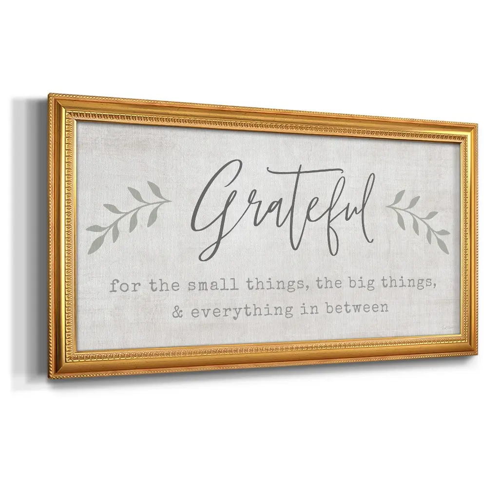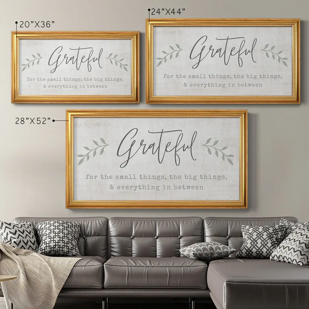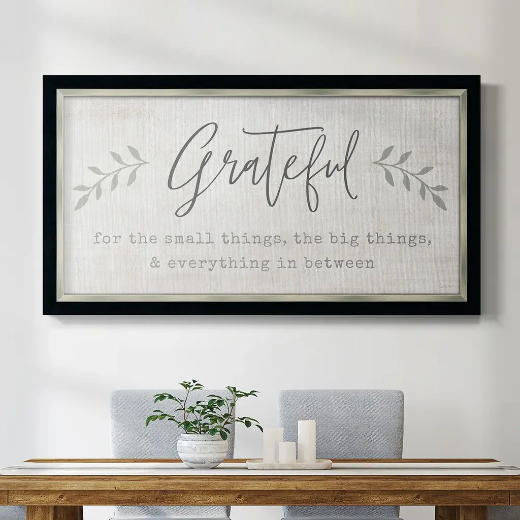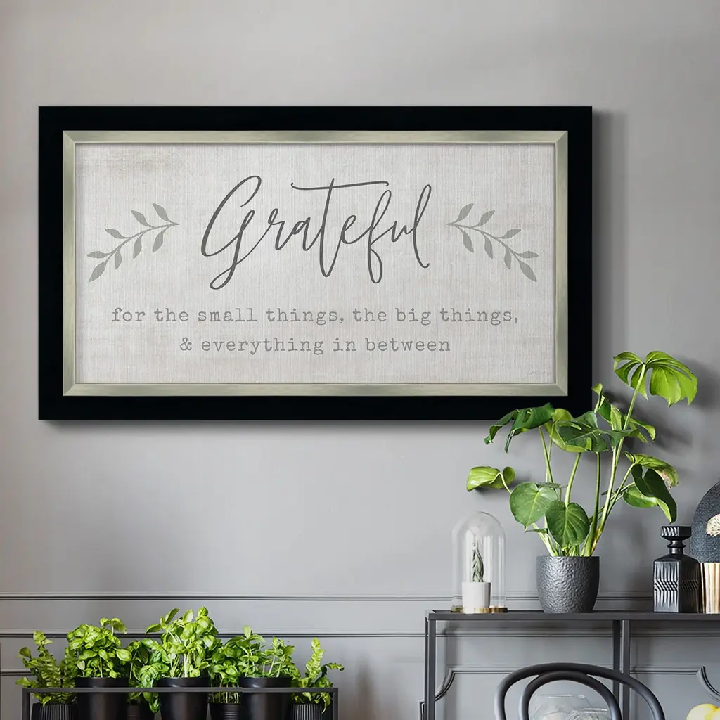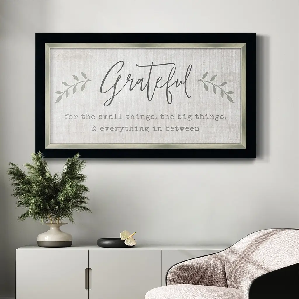Grateful for Everything Premium Framed Canvas- Ready to Hang A Premium Framed Canvas created to last. Framed in distressed wood and available in an array of sizes and colors Featuring a beveled a solid wood stretcher bar, each piece comes ready to hand 3 SIZES AVAILABLE 21''X37'' - Overall Size 25''X45'' - Overall Size 29''x53'' - Overall Size Each piece is made to order. Each piece comes with hanging hardware. Made in the USA Ready to Hang Giclee Paper Print Acrylic Glass Beveled Matt Board