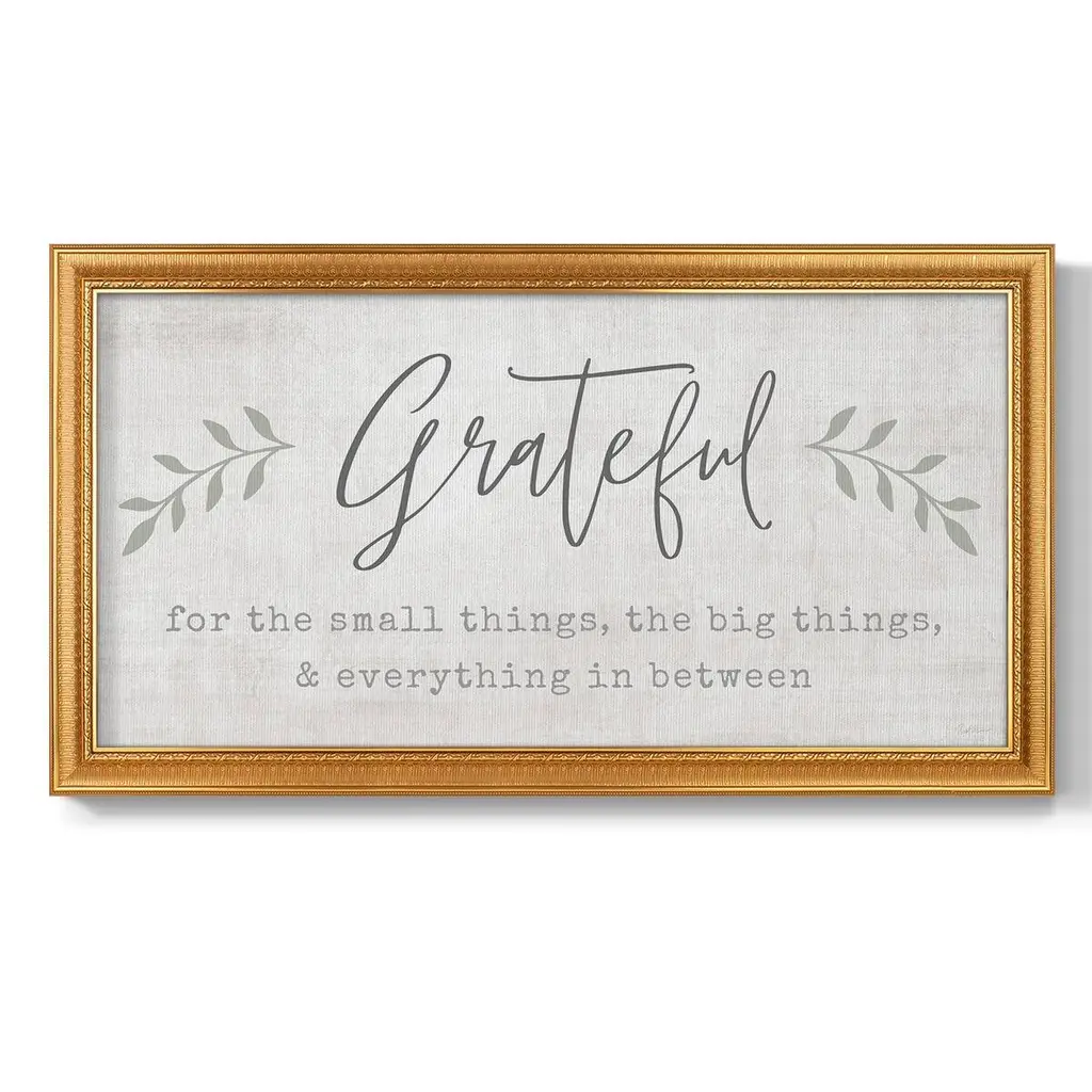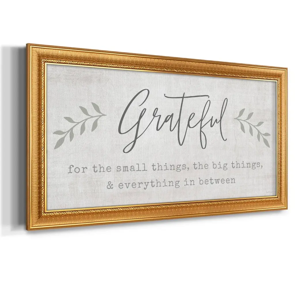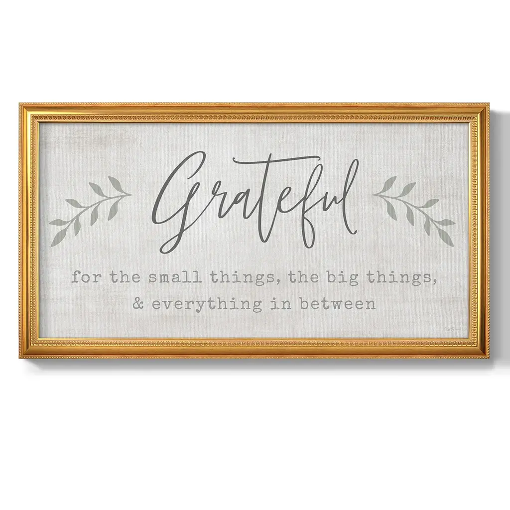 Grateful for Everything Premium Framed Canvas- Ready to Hang A Premium Framed Canvas created to last. Framed in distressed wood and available in an array of sizes and colors Featuring a beveled a solid wood stretcher bar, each piece comes ready to hand 3 SIZES AVAILABLE 21''X37'' - Overall Size 25''X45'' - Overall Size 29''x53'' - Overall Size Each piece is made to order. Each piece comes with hanging hardware. Made in the USA Ready to Hang Giclee Paper Print Acrylic Glass Beveled Matt Board