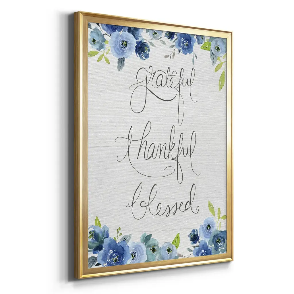 Grateful, Thankful, Blessed Premium Framed Print - Ready to Hang A Premium Framed Print created to last. Framed in distressed wood and available in an array of sizes and colors Featuring a beveled a solid wood stretcher bar, each piece comes ready to hand 4 SIZES AVAILABLE 30.5''X42.5'' - Overall Size 26.5'X36.5'' - Overall Size 22.5''x30.5'' - Overall Size 18.5''x24.5'' - Overall Size Each piece is made to order. Each piece comes with hanging hardware. Made in the USA Ready to Hang