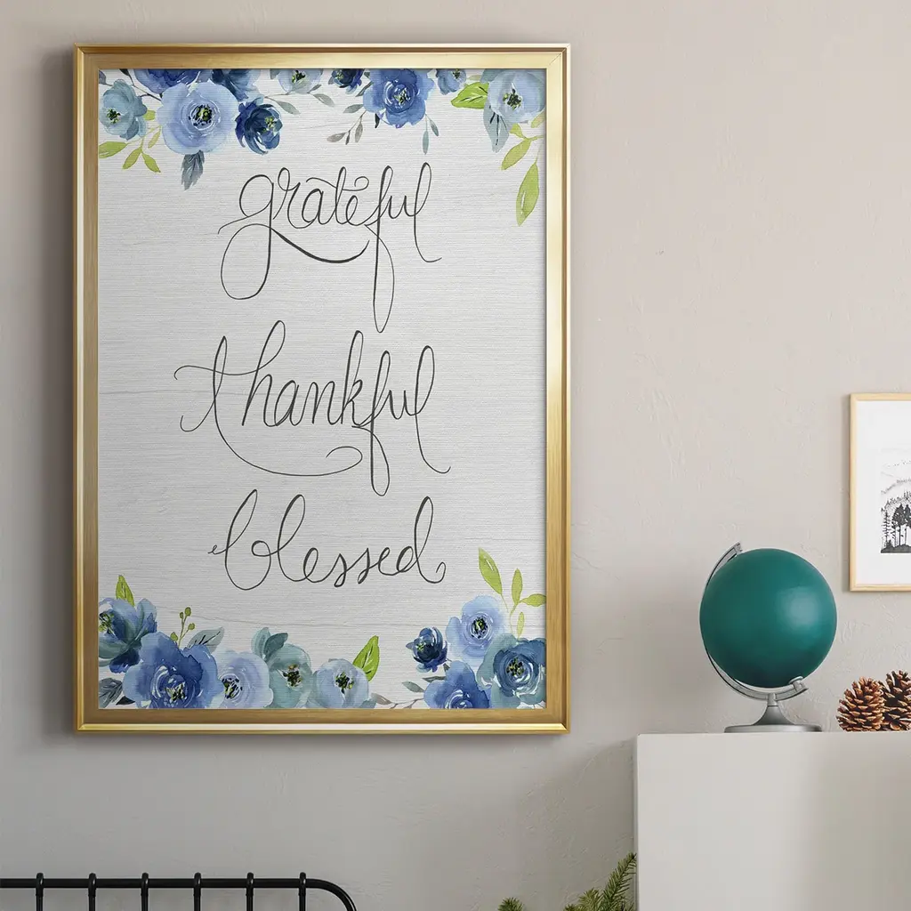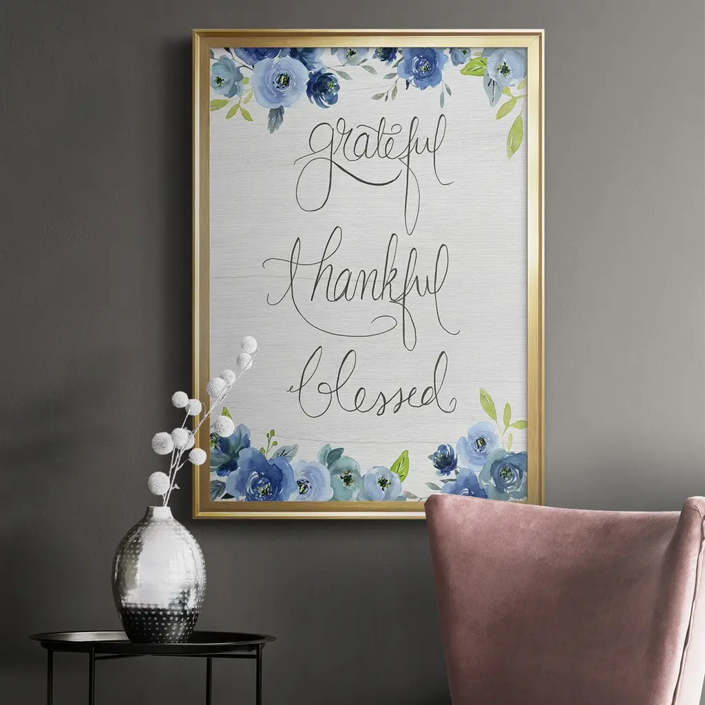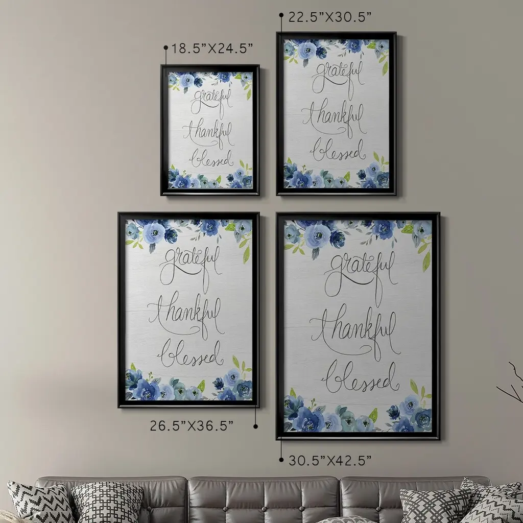 Grateful, Thankful, Blessed Premium Framed Print - Ready to Hang A Premium Framed Print created to last. Framed in distressed wood and available in an array of sizes and colors Featuring a beveled a solid wood stretcher bar, each piece comes ready to hand 4 SIZES AVAILABLE 30.5''X42.5'' - Overall Size 26.5'X36.5'' - Overall Size 22.5''x30.5'' - Overall Size 18.5''x24.5'' - Overall Size Each piece is made to order. Each piece comes with hanging hardware. Made in the USA Ready to Hang