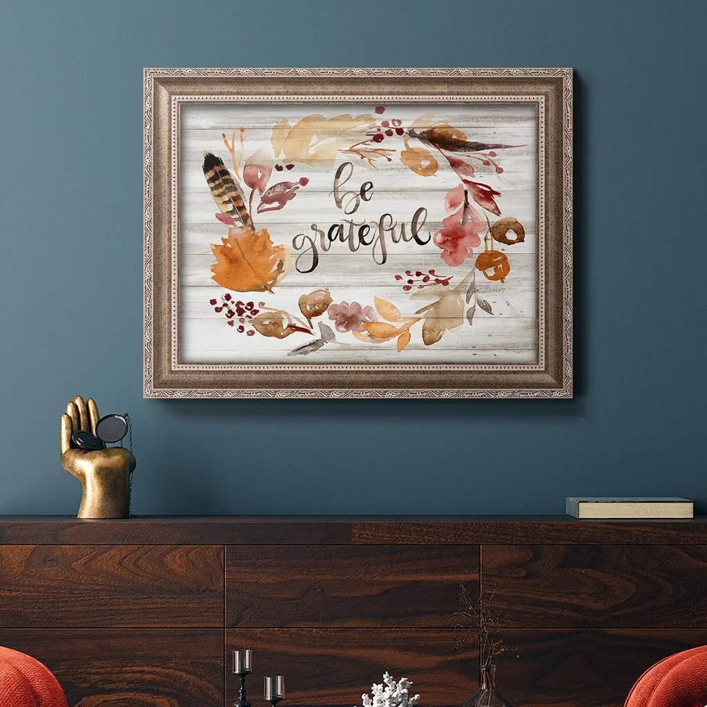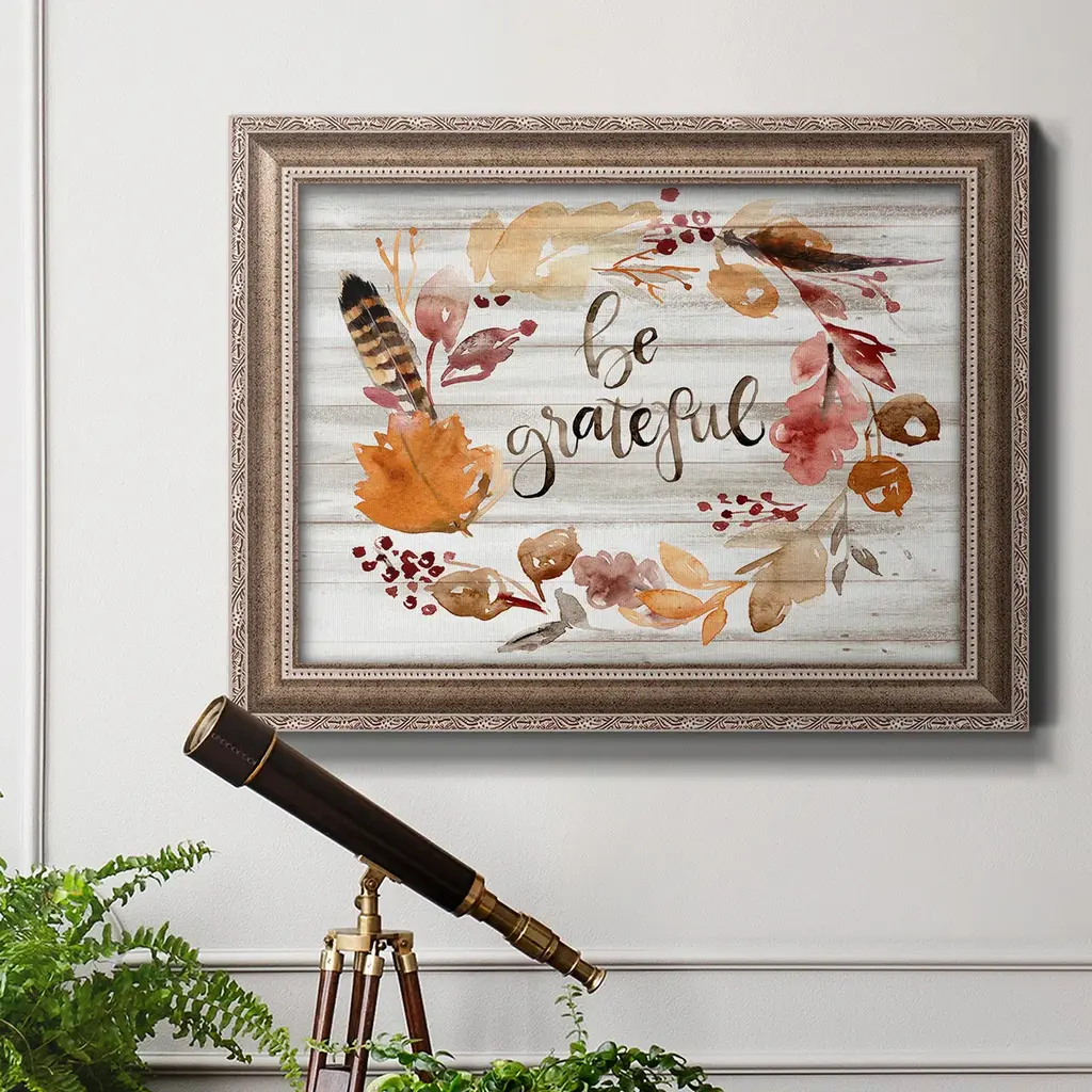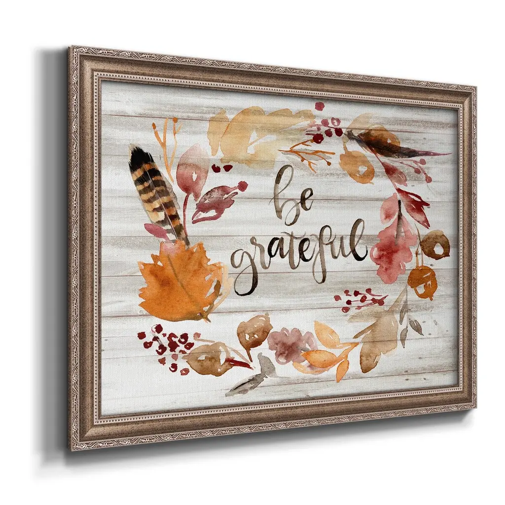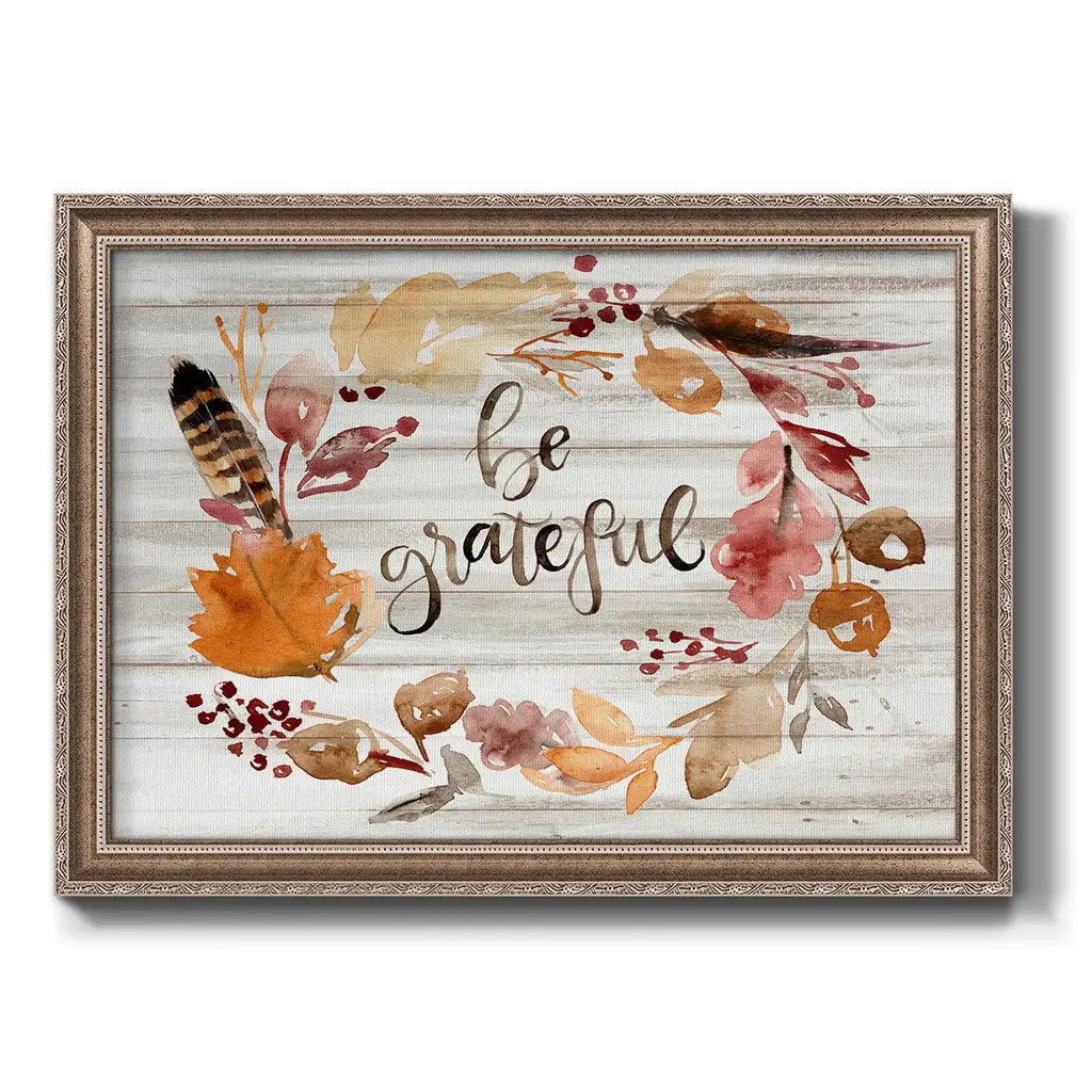 Grateful Thanksgiving I Premium Framed Canvas- Ready to Hang A Premium Framed Canvas created to last. Framed in distressed wood and available in an array of sizes and colors Featuring a beveled a solid wood stretcher bar, each piece comes ready to hand 3 SIZES AVAILABLE 16''X20'' - Overall Size 18'X27'' - Overall Size 24''x36'' - Overall Size Each piece is made to order. Each piece comes with hanging hardware. Made in the USA Ready to Hang Giclee Paper Print Acrylic Glass Beveled Matt Board