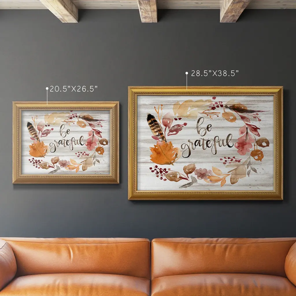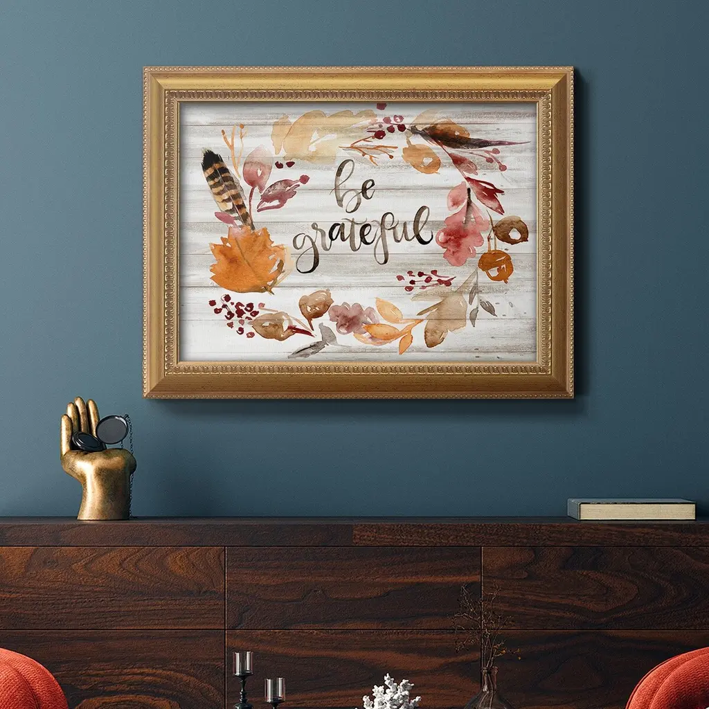 Grateful Thanksgiving I Premium Framed Canvas- Ready to Hang A Premium Framed Canvas created to last. Framed in distressed wood and available in an array of sizes and colors Featuring a beveled a solid wood stretcher bar, each piece comes ready to hand 3 SIZES AVAILABLE 16''X20'' - Overall Size 18'X27'' - Overall Size 24''x36'' - Overall Size Each piece is made to order. Each piece comes with hanging hardware. Made in the USA Ready to Hang Giclee Paper Print Acrylic Glass Beveled Matt Board