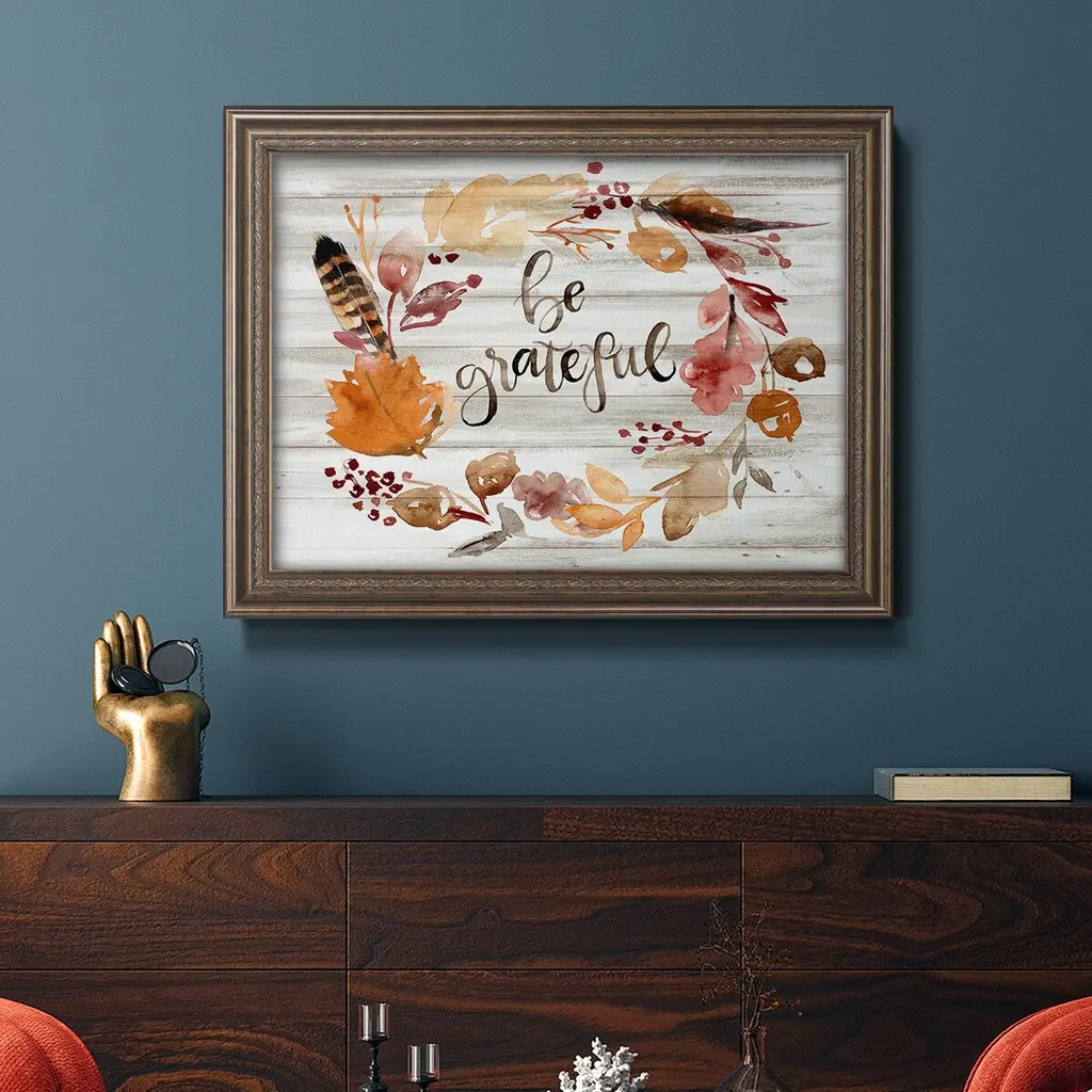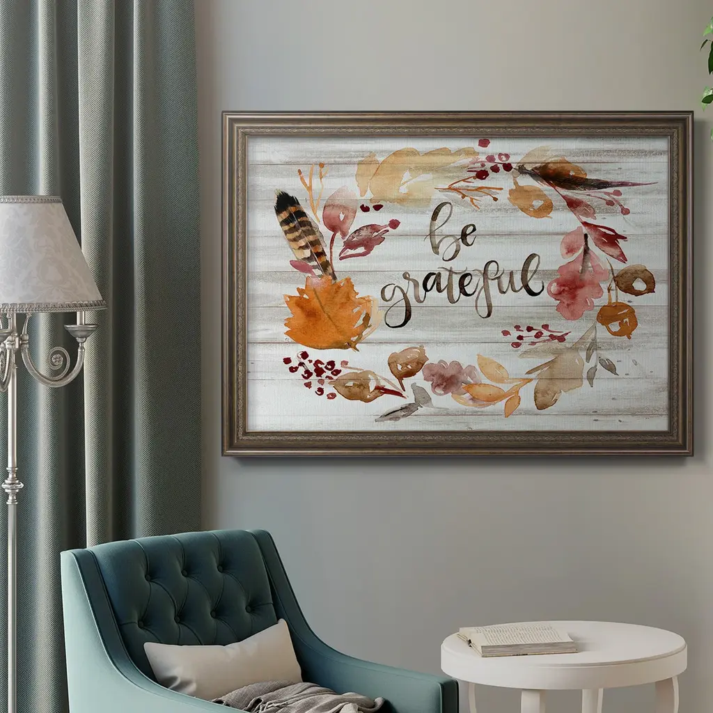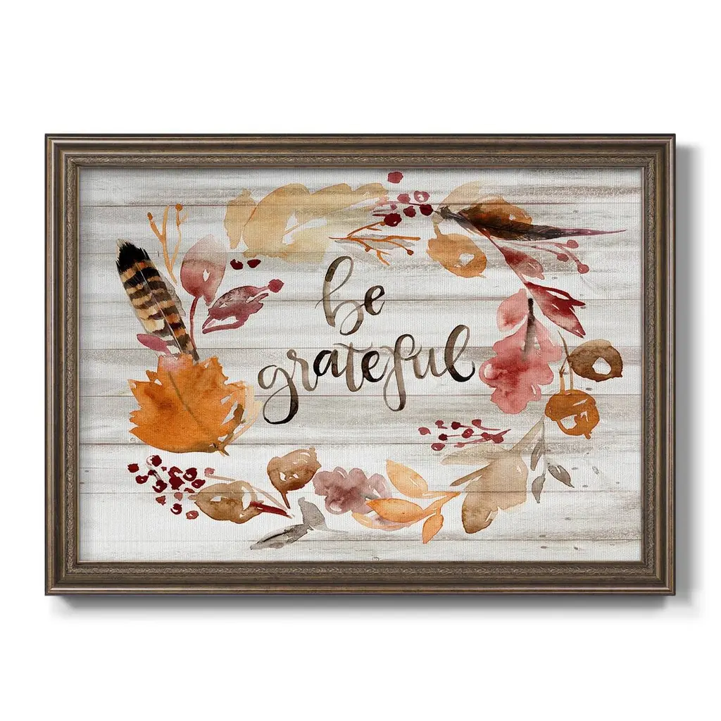 Grateful Thanksgiving I Premium Framed Canvas- Ready to Hang A Premium Framed Canvas created to last. Framed in distressed wood and available in an array of sizes and colors Featuring a beveled a solid wood stretcher bar, each piece comes ready to hand 3 SIZES AVAILABLE 16''X20'' - Overall Size 18'X27'' - Overall Size 24''x36'' - Overall Size Each piece is made to order. Each piece comes with hanging hardware. Made in the USA Ready to Hang Giclee Paper Print Acrylic Glass Beveled Matt Board