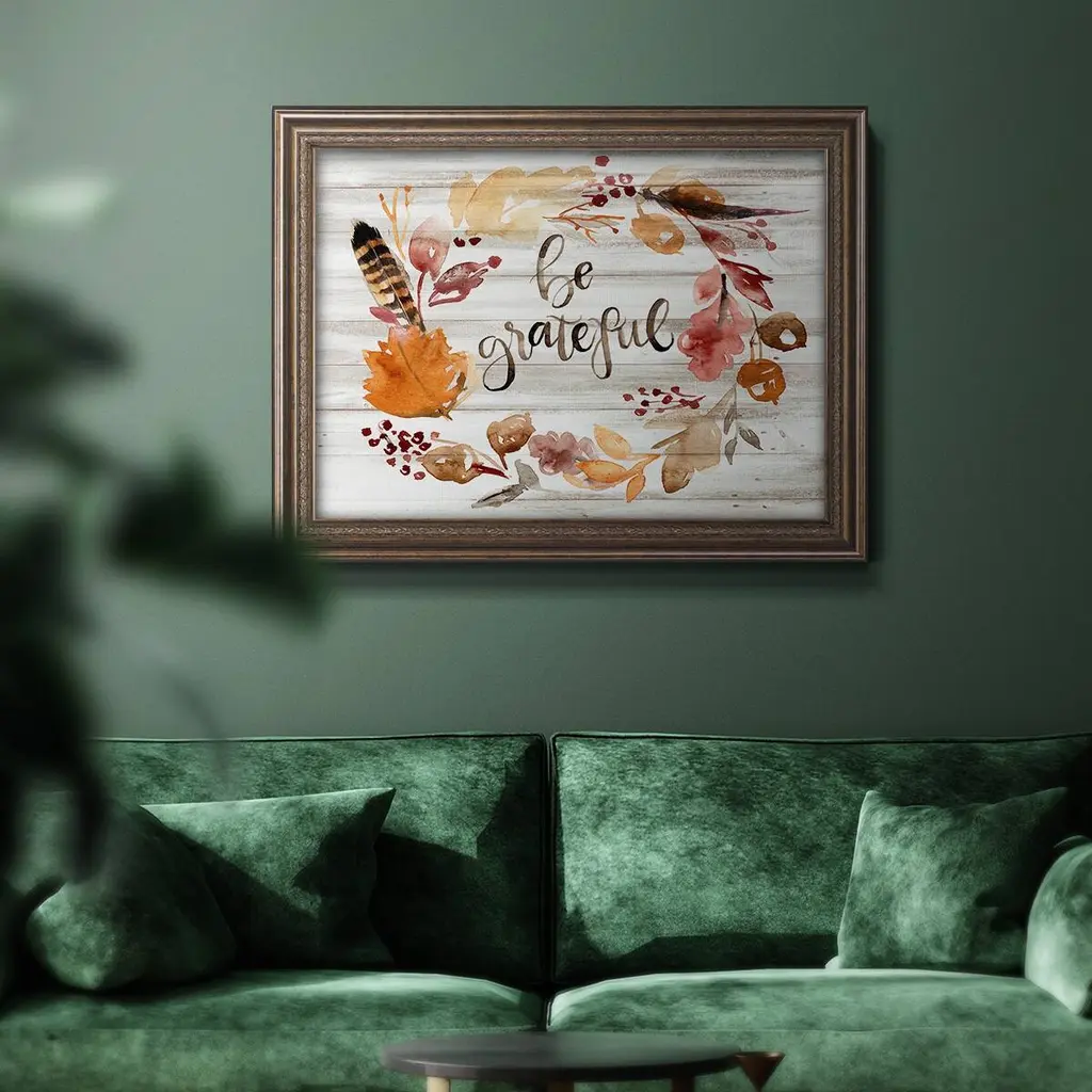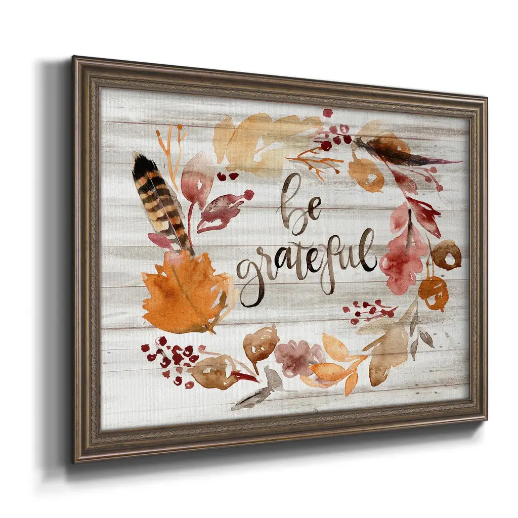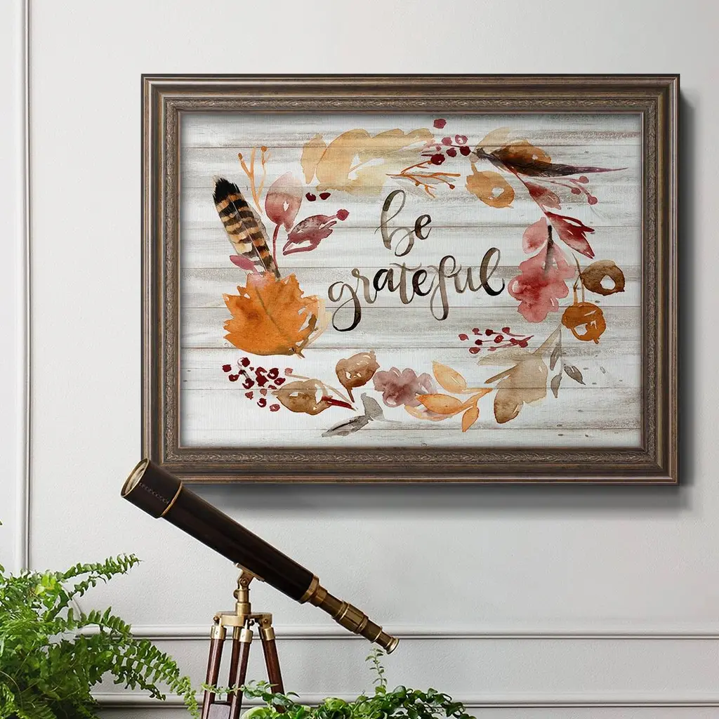 Grateful Thanksgiving I Premium Framed Canvas- Ready to Hang A Premium Framed Canvas created to last. Framed in distressed wood and available in an array of sizes and colors Featuring a beveled a solid wood stretcher bar, each piece comes ready to hand 3 SIZES AVAILABLE 16''X20'' - Overall Size 18'X27'' - Overall Size 24''x36'' - Overall Size Each piece is made to order. Each piece comes with hanging hardware. Made in the USA Ready to Hang Giclee Paper Print Acrylic Glass Beveled Matt Board