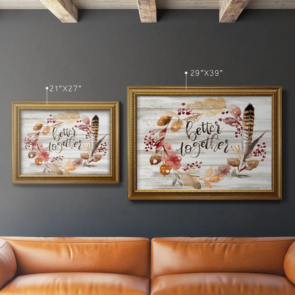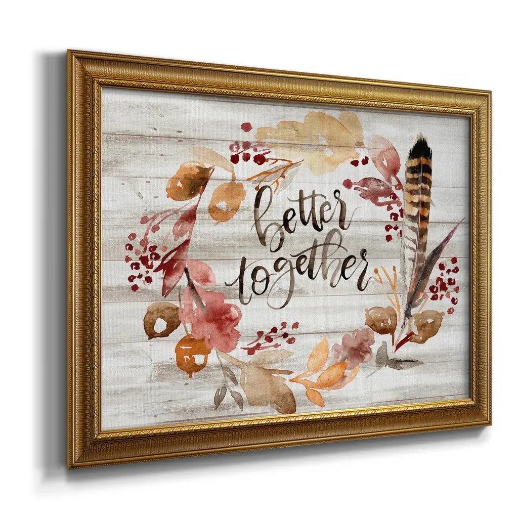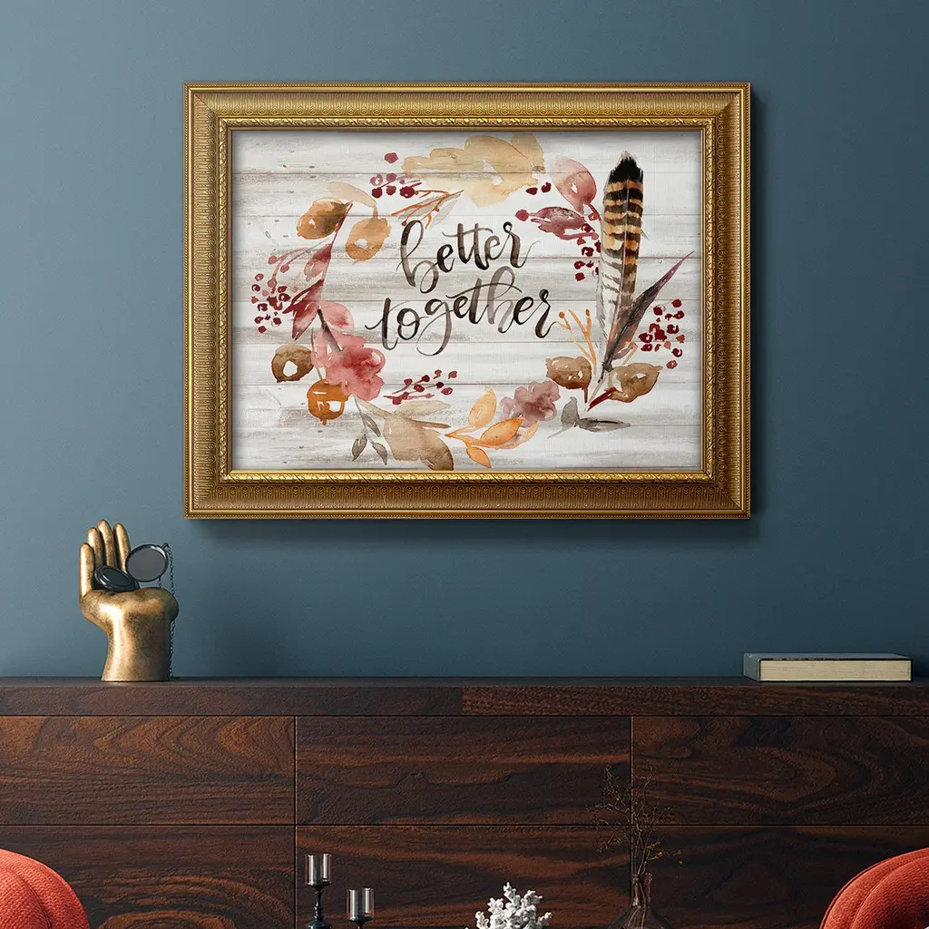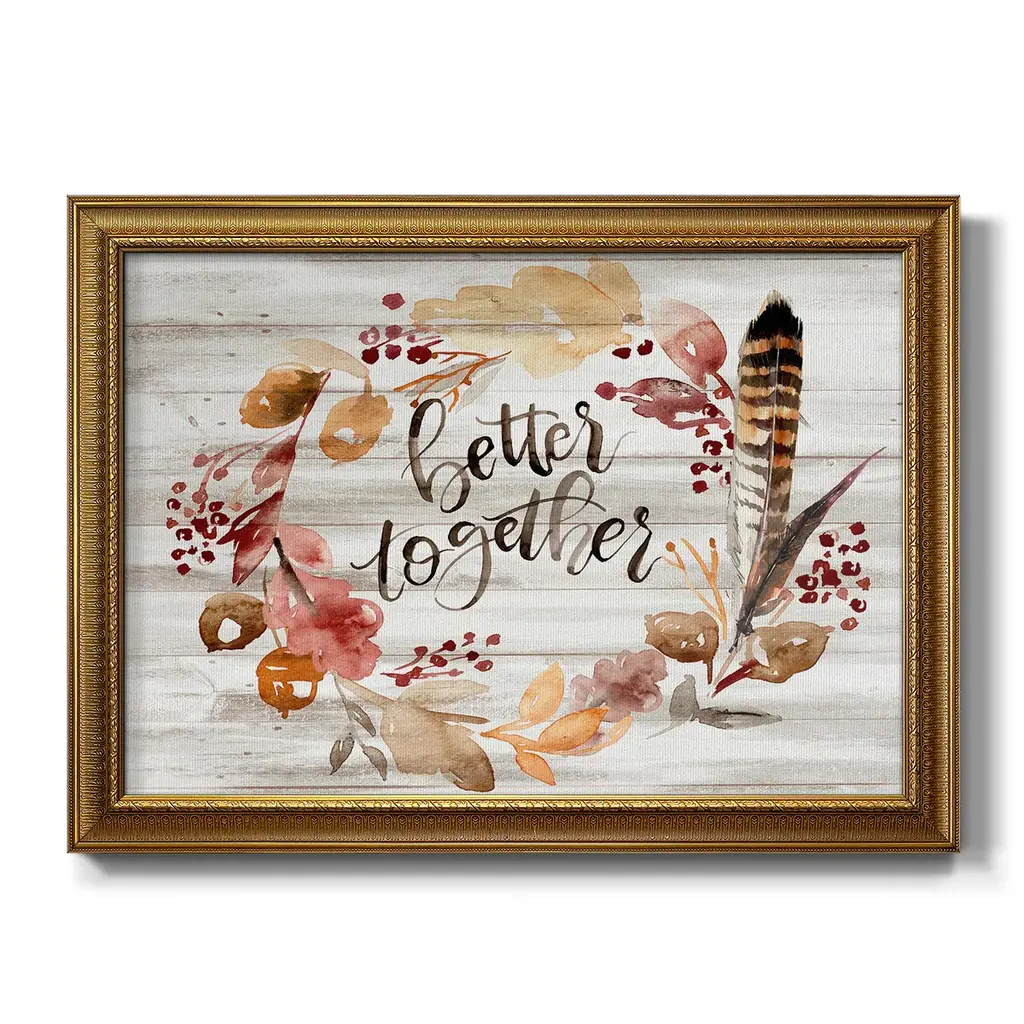 Grateful Thanksgiving III Premium Framed Canvas- Ready to Hang A Premium Framed Canvas created to last. Framed in distressed wood and available in an array of sizes and colors Featuring a beveled a solid wood stretcher bar, each piece comes ready to hand 3 SIZES AVAILABLE 16''X20'' - Overall Size 18'X27'' - Overall Size 24''x36'' - Overall Size Each piece is made to order. Each piece comes with hanging hardware. Made in the USA Ready to Hang Giclee Paper Print Acrylic Glass Beveled Matt Board