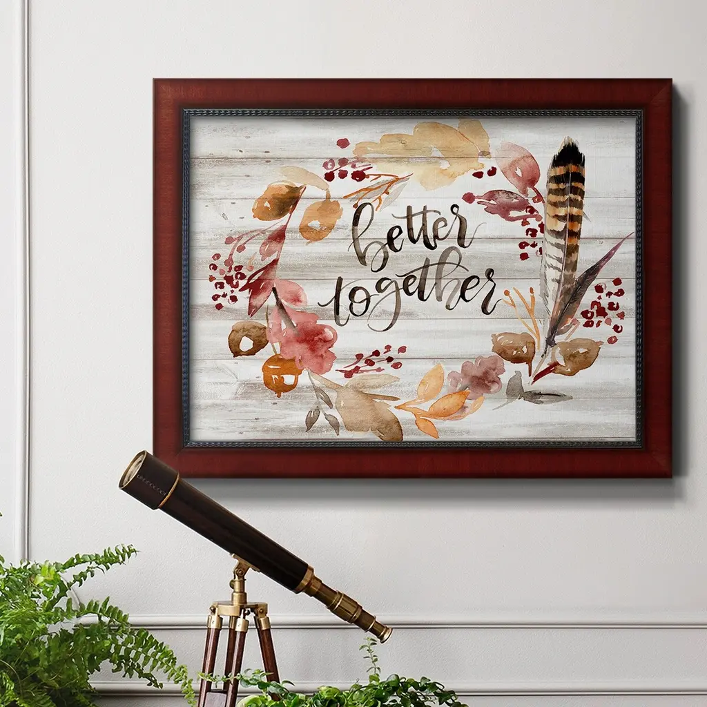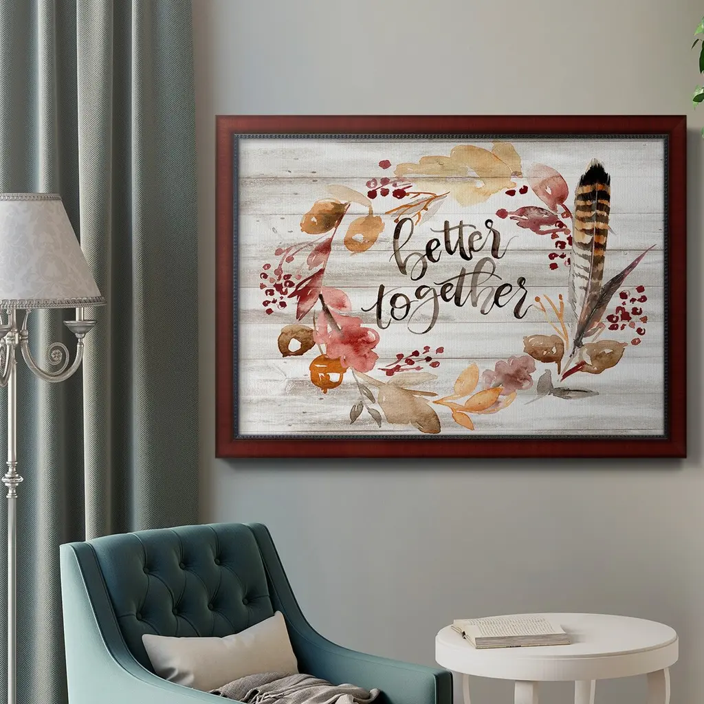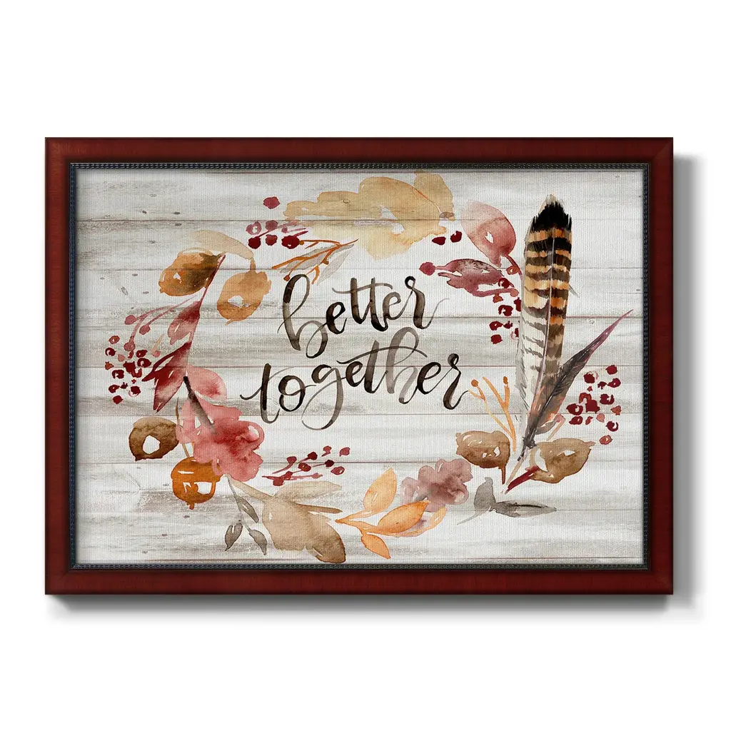 Grateful Thanksgiving III Premium Framed Canvas- Ready to Hang A Premium Framed Canvas created to last. Framed in distressed wood and available in an array of sizes and colors Featuring a beveled a solid wood stretcher bar, each piece comes ready to hand 3 SIZES AVAILABLE 16''X20'' - Overall Size 18'X27'' - Overall Size 24''x36'' - Overall Size Each piece is made to order. Each piece comes with hanging hardware. Made in the USA Ready to Hang Giclee Paper Print Acrylic Glass Beveled Matt Board