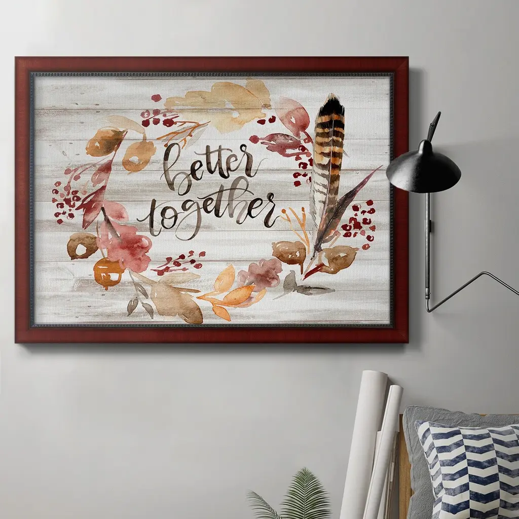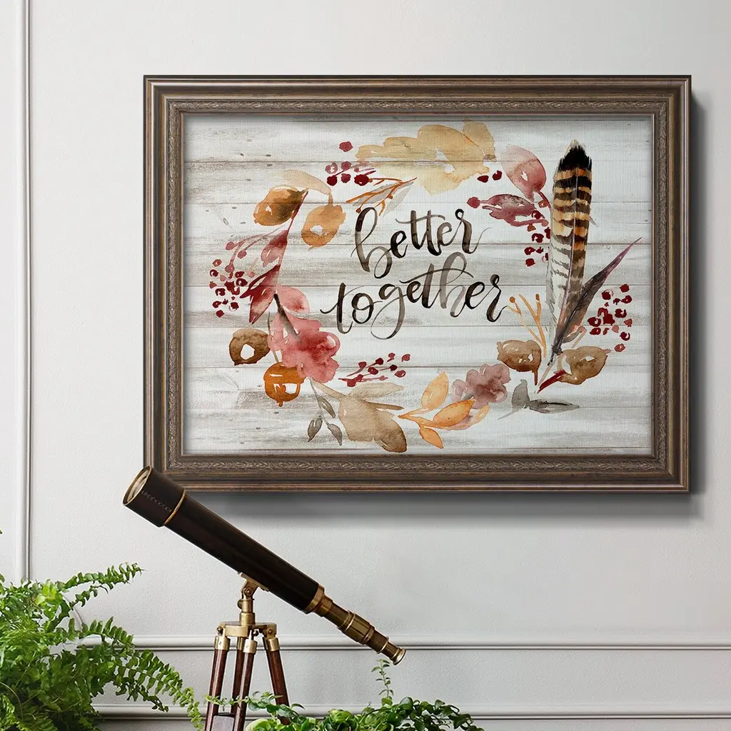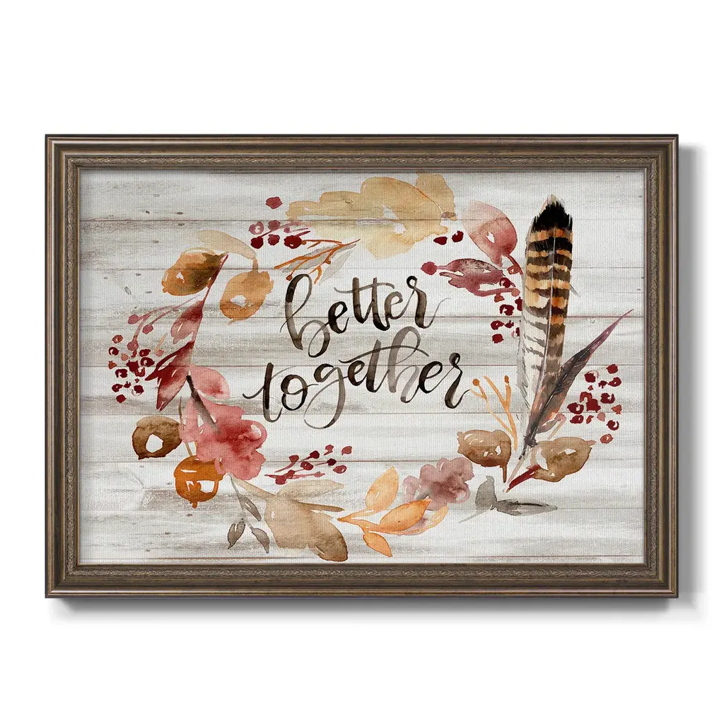 Grateful Thanksgiving III Premium Framed Canvas- Ready to Hang A Premium Framed Canvas created to last. Framed in distressed wood and available in an array of sizes and colors Featuring a beveled a solid wood stretcher bar, each piece comes ready to hand 3 SIZES AVAILABLE 16''X20'' - Overall Size 18'X27'' - Overall Size 24''x36'' - Overall Size Each piece is made to order. Each piece comes with hanging hardware. Made in the USA Ready to Hang Giclee Paper Print Acrylic Glass Beveled Matt Board