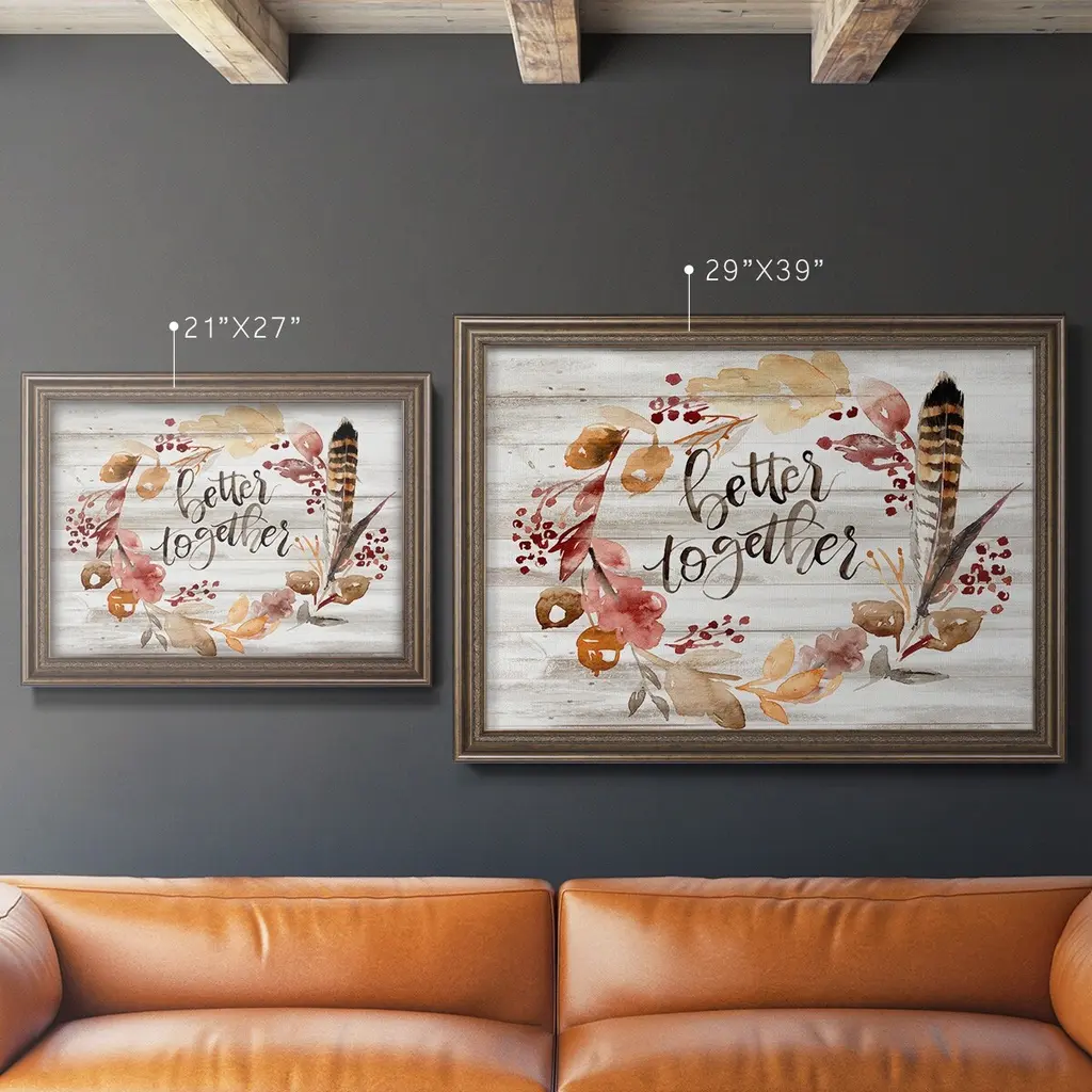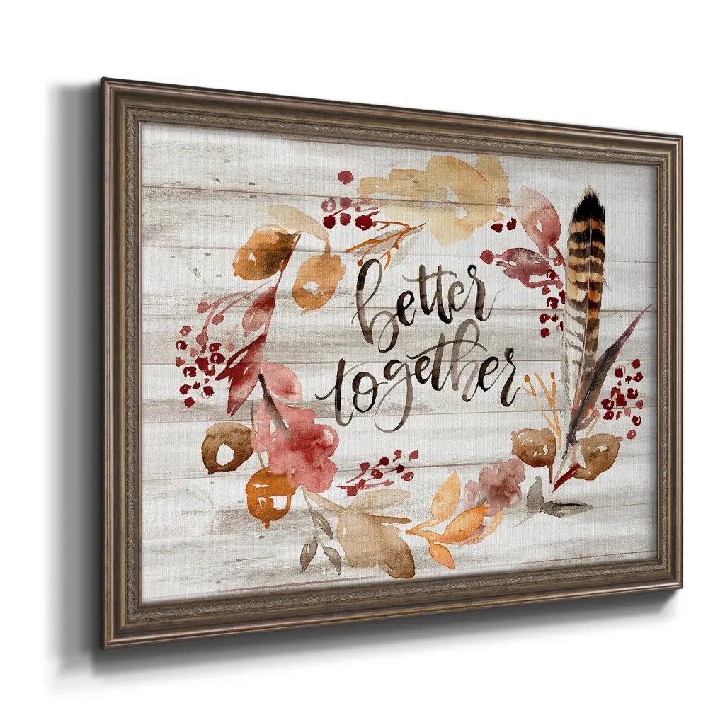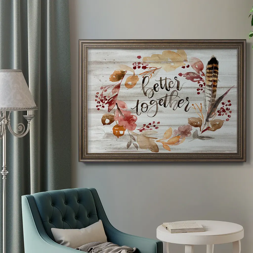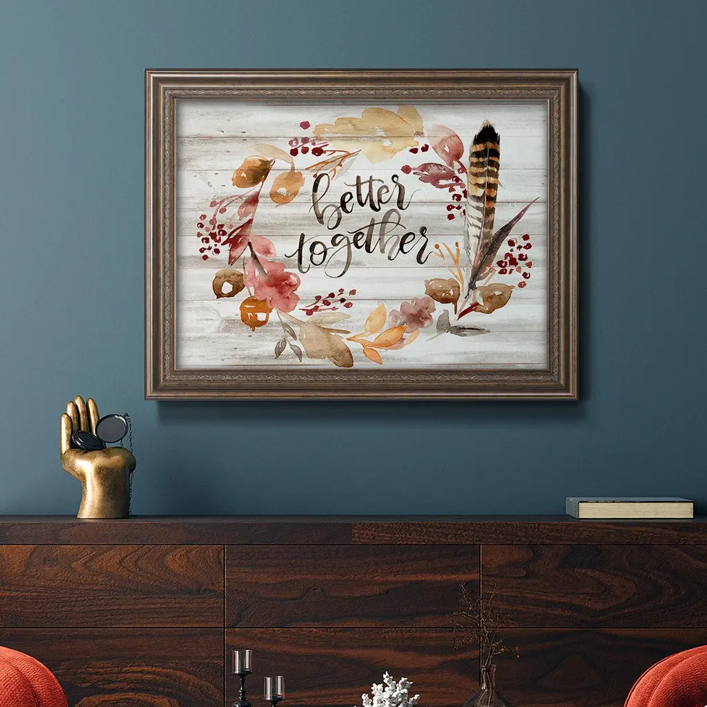 Grateful Thanksgiving III Premium Framed Canvas- Ready to Hang A Premium Framed Canvas created to last. Framed in distressed wood and available in an array of sizes and colors Featuring a beveled a solid wood stretcher bar, each piece comes ready to hand 3 SIZES AVAILABLE 16''X20'' - Overall Size 18'X27'' - Overall Size 24''x36'' - Overall Size Each piece is made to order. Each piece comes with hanging hardware. Made in the USA Ready to Hang Giclee Paper Print Acrylic Glass Beveled Matt Board
