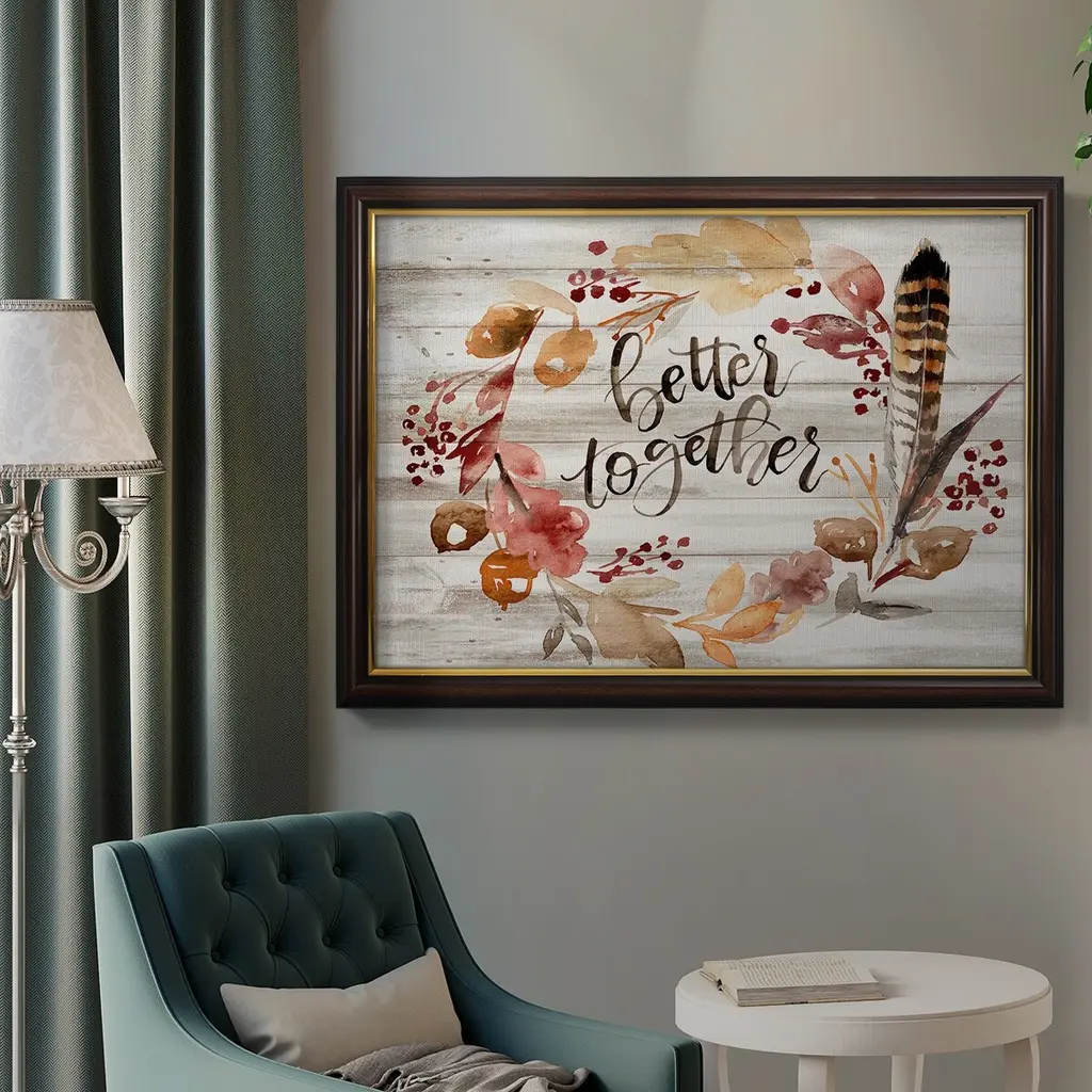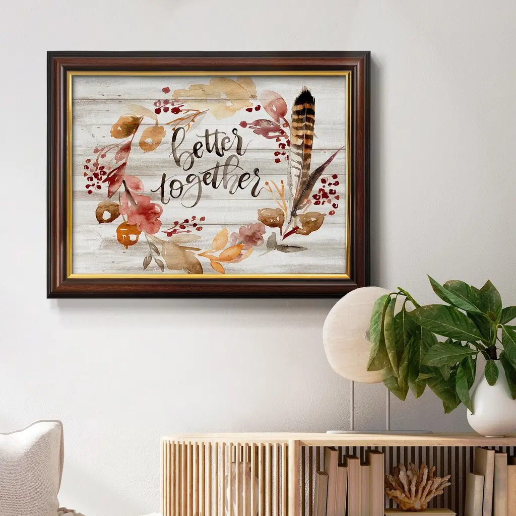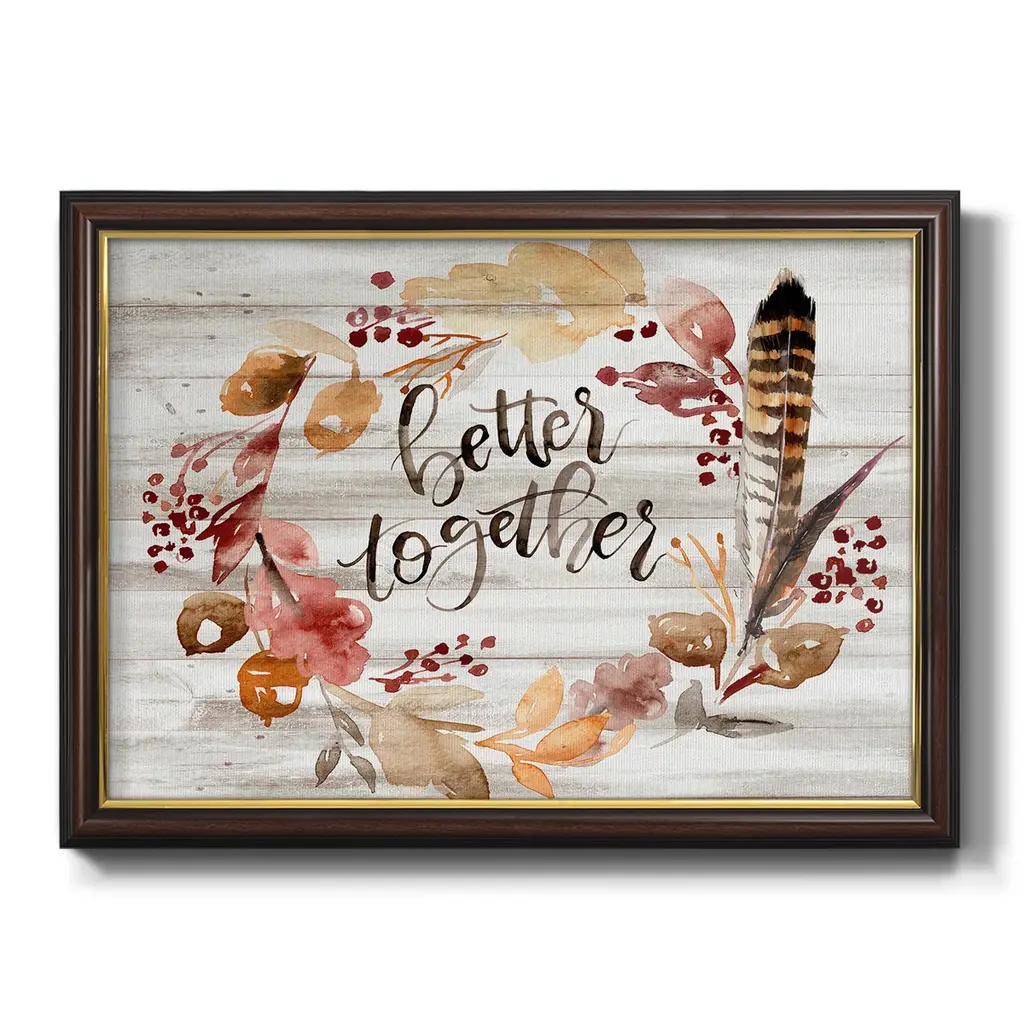 Grateful Thanksgiving III Premium Framed Canvas- Ready to Hang A Premium Framed Canvas created to last. Framed in distressed wood and available in an array of sizes and colors Featuring a beveled a solid wood stretcher bar, each piece comes ready to hand 3 SIZES AVAILABLE 16''X20'' - Overall Size 18'X27'' - Overall Size 24''x36'' - Overall Size Each piece is made to order. Each piece comes with hanging hardware. Made in the USA Ready to Hang Giclee Paper Print Acrylic Glass Beveled Matt Board