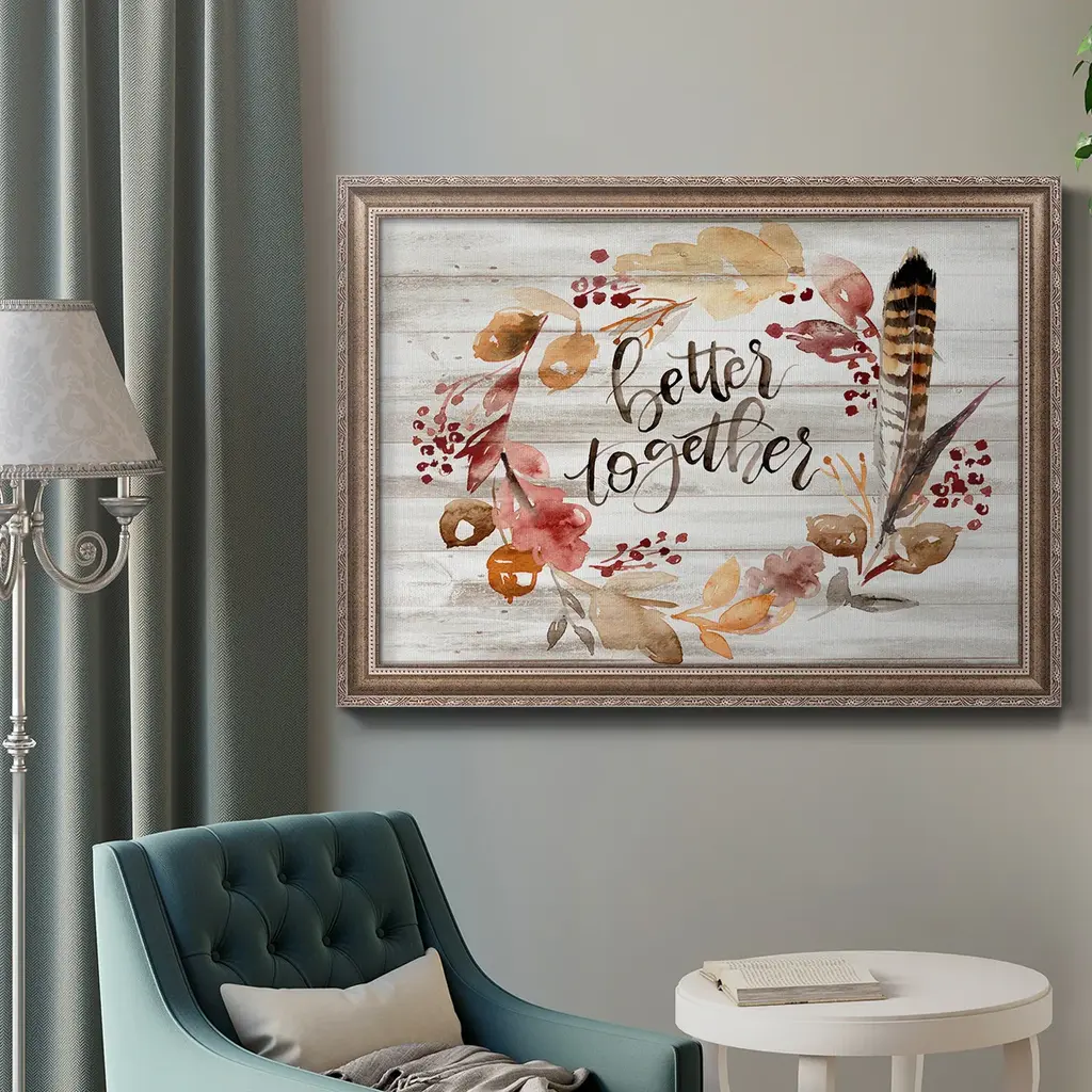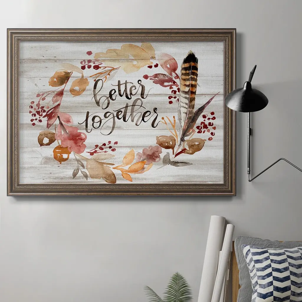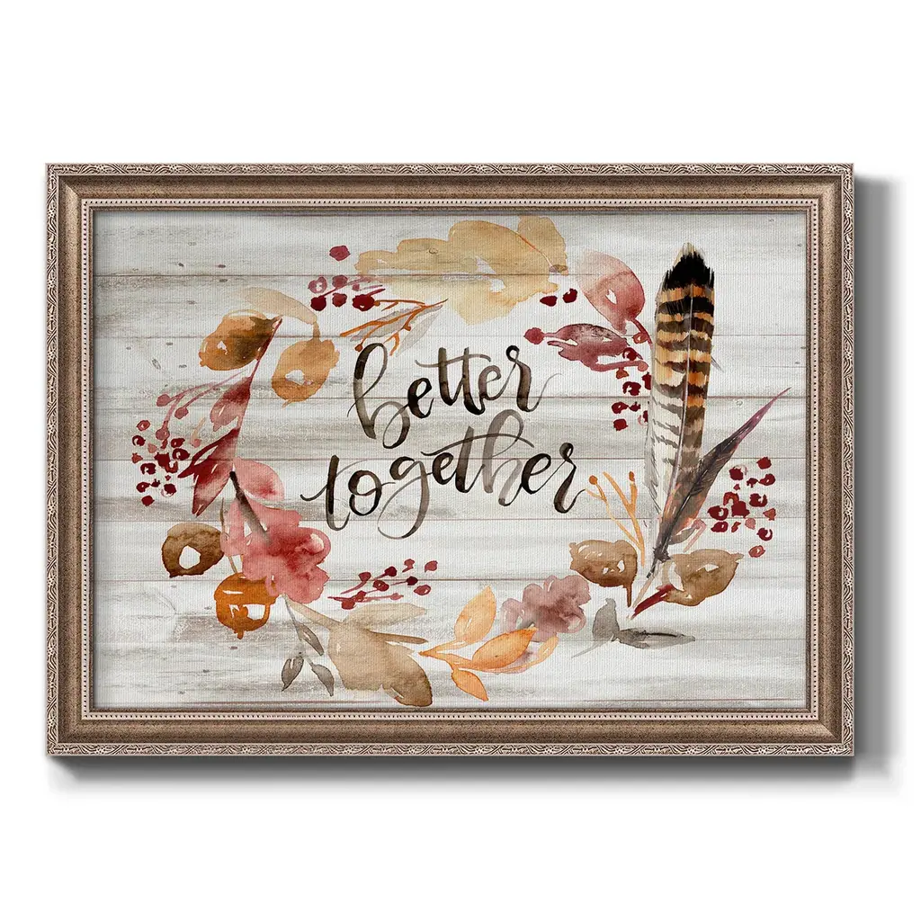 Grateful Thanksgiving III Premium Framed Canvas- Ready to Hang A Premium Framed Canvas created to last. Framed in distressed wood and available in an array of sizes and colors Featuring a beveled a solid wood stretcher bar, each piece comes ready to hand 3 SIZES AVAILABLE 16''X20'' - Overall Size 18'X27'' - Overall Size 24''x36'' - Overall Size Each piece is made to order. Each piece comes with hanging hardware. Made in the USA Ready to Hang Giclee Paper Print Acrylic Glass Beveled Matt Board
