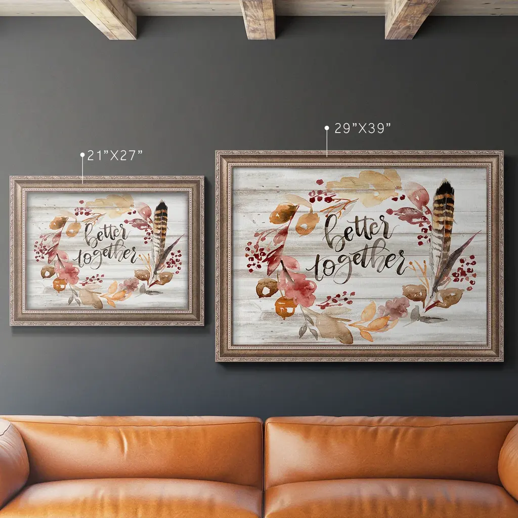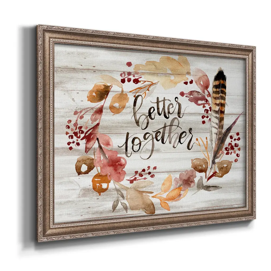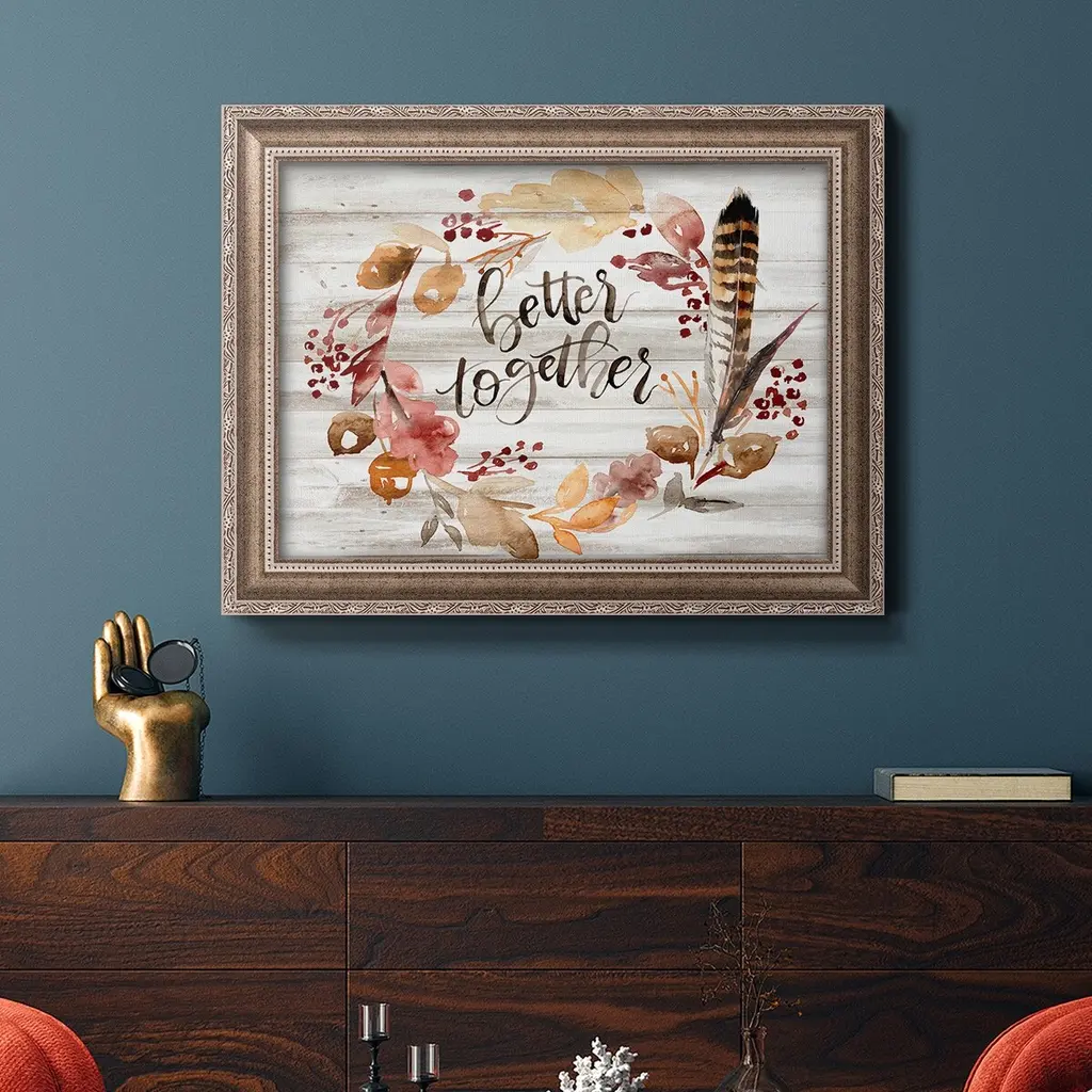 Grateful Thanksgiving III Premium Framed Canvas- Ready to Hang A Premium Framed Canvas created to last. Framed in distressed wood and available in an array of sizes and colors Featuring a beveled a solid wood stretcher bar, each piece comes ready to hand 3 SIZES AVAILABLE 16''X20'' - Overall Size 18'X27'' - Overall Size 24''x36'' - Overall Size Each piece is made to order. Each piece comes with hanging hardware. Made in the USA Ready to Hang Giclee Paper Print Acrylic Glass Beveled Matt Board