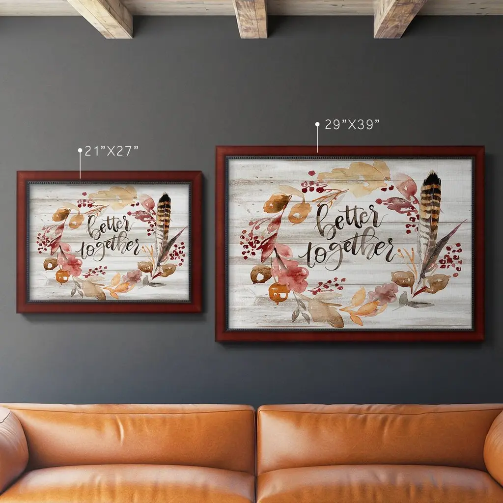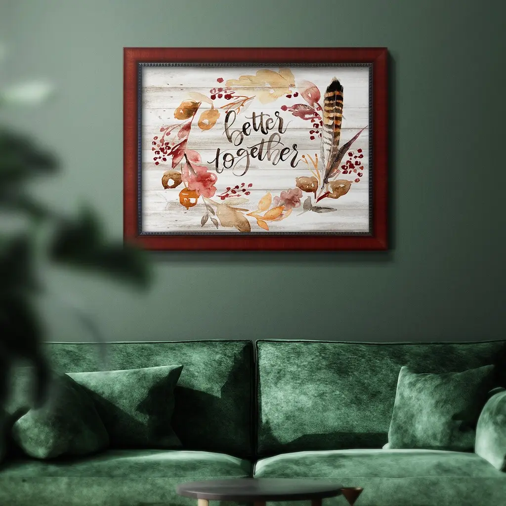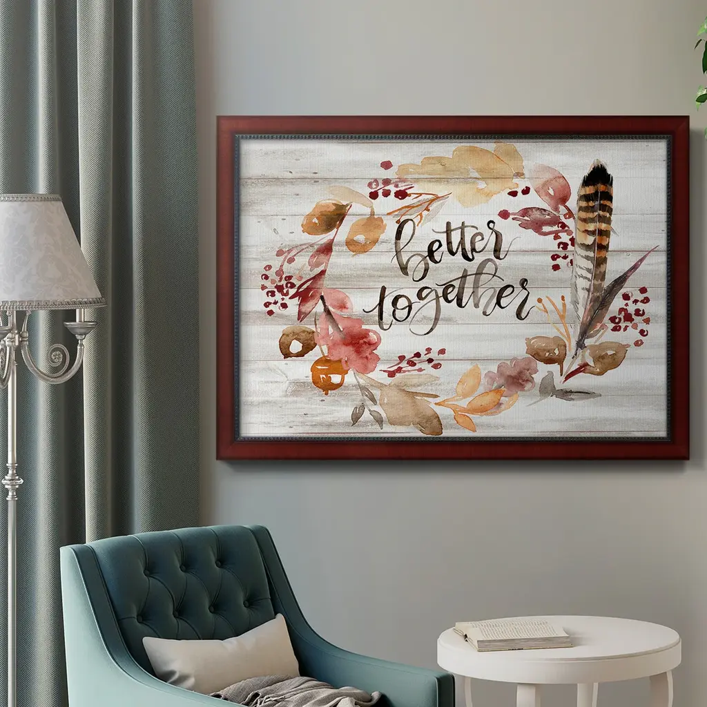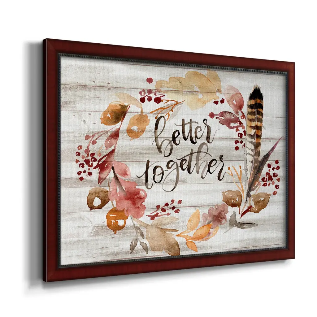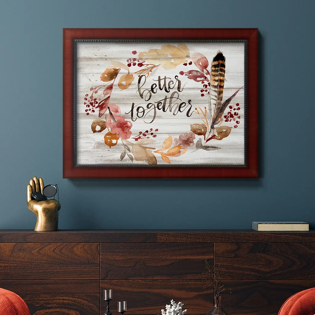 Grateful Thanksgiving III Premium Framed Canvas- Ready to Hang A Premium Framed Canvas created to last. Framed in distressed wood and available in an array of sizes and colors Featuring a beveled a solid wood stretcher bar, each piece comes ready to hand 3 SIZES AVAILABLE 16''X20'' - Overall Size 18'X27'' - Overall Size 24''x36'' - Overall Size Each piece is made to order. Each piece comes with hanging hardware. Made in the USA Ready to Hang Giclee Paper Print Acrylic Glass Beveled Matt Board
