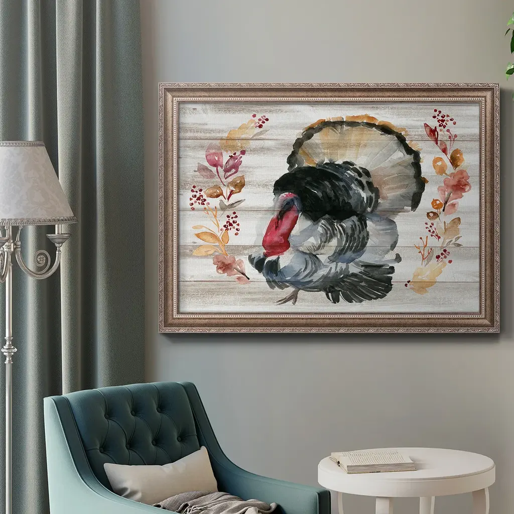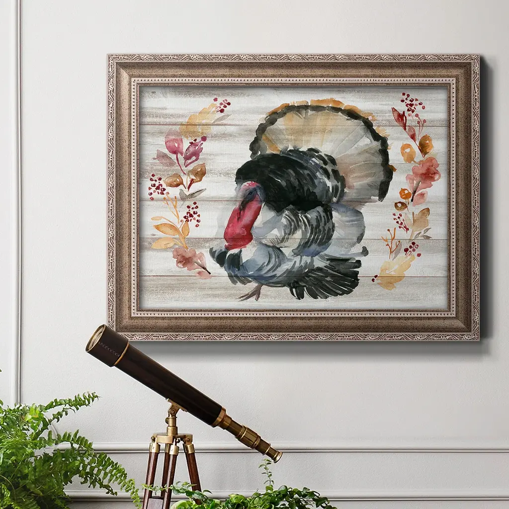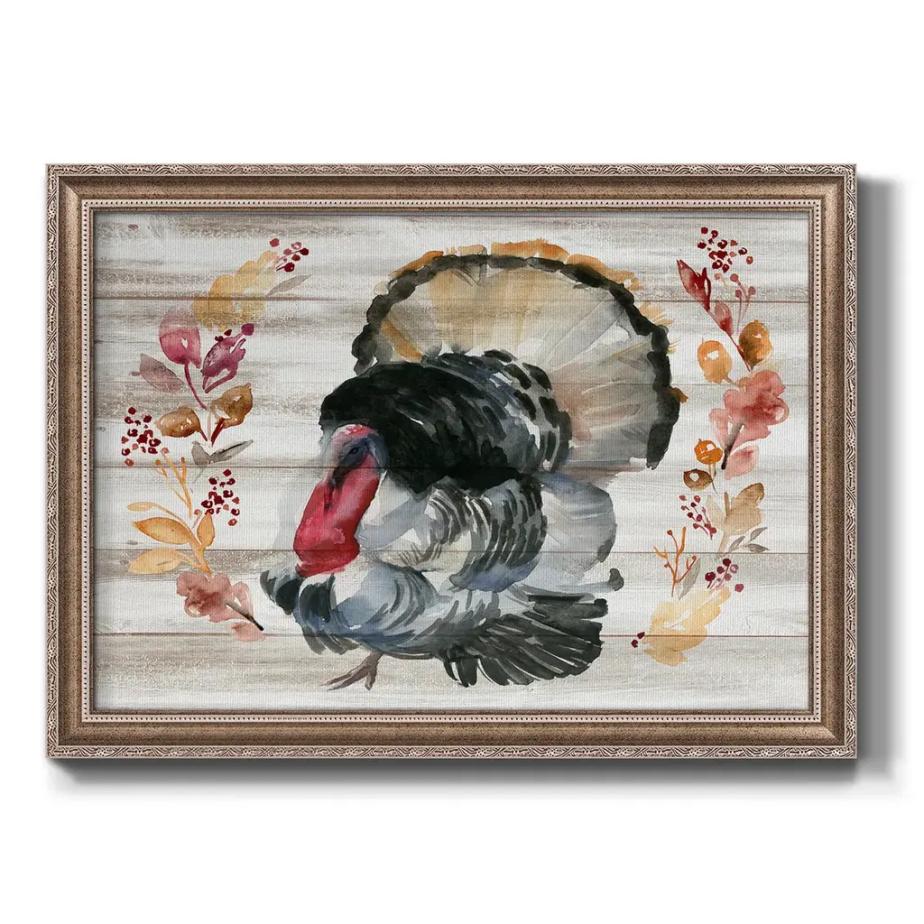 Grateful Thanksgiving IV Premium Framed Canvas- Ready to Hang A Premium Framed Canvas created to last. Framed in distressed wood and available in an array of sizes and colors Featuring a beveled a solid wood stretcher bar, each piece comes ready to hand 3 SIZES AVAILABLE 16''X20'' - Overall Size 18'X27'' - Overall Size 24''x36'' - Overall Size Each piece is made to order. Each piece comes with hanging hardware. Made in the USA Ready to Hang Giclee Paper Print Acrylic Glass Beveled Matt Board