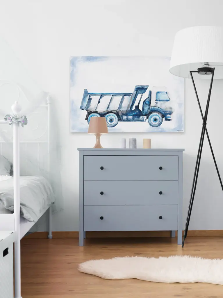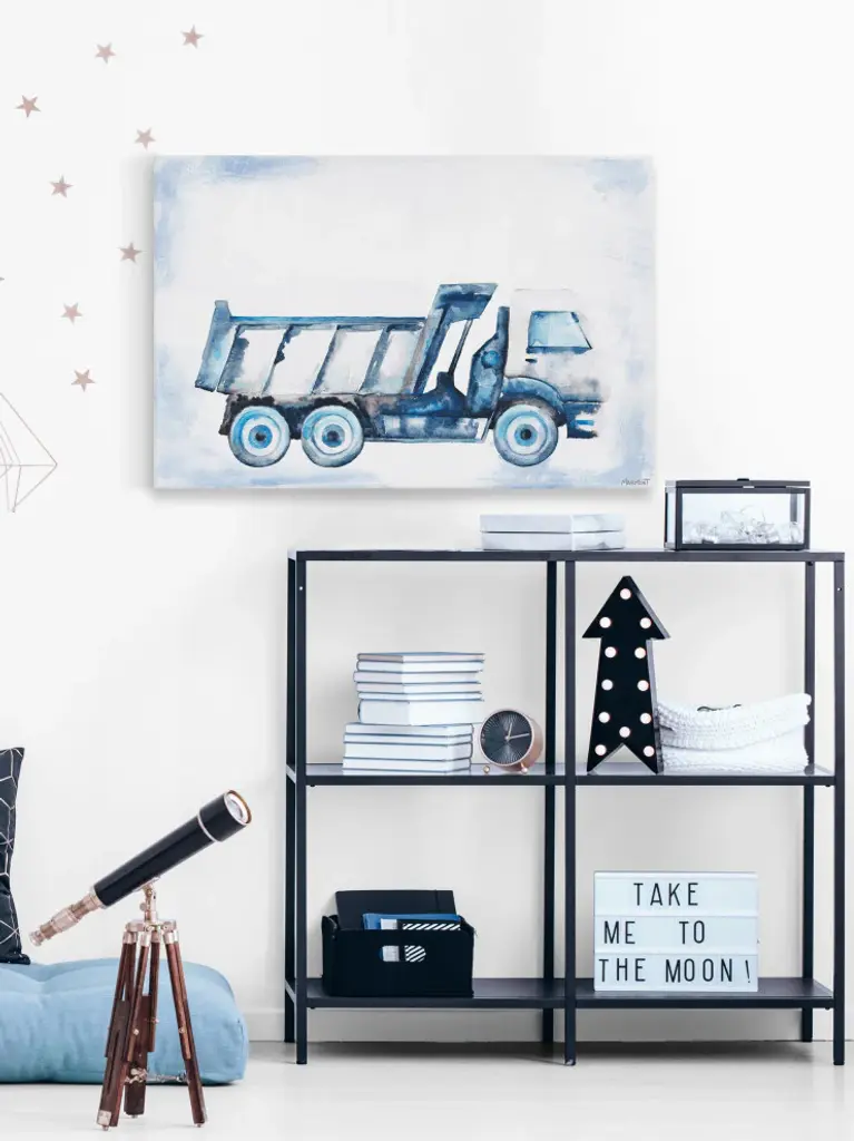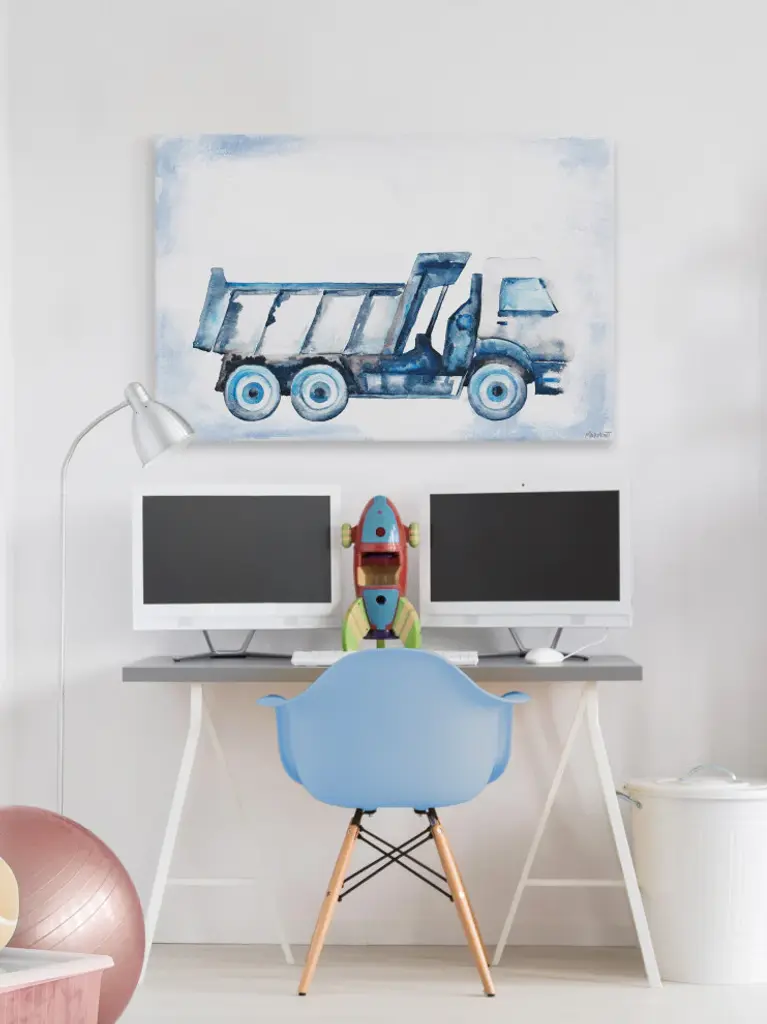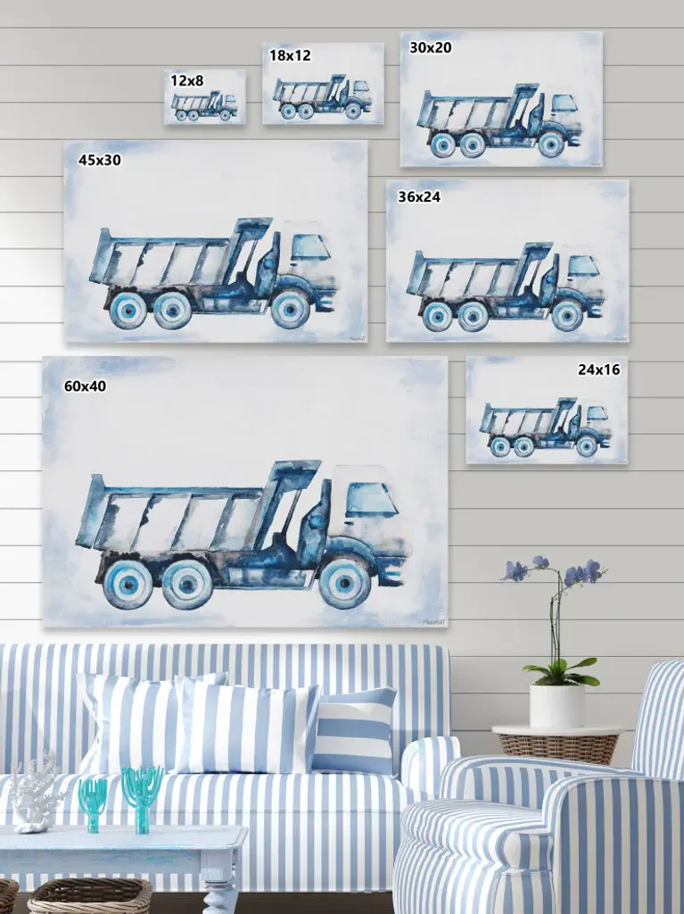 Bring an industrial feel to your space with this baby blue print of a dump truck set in an entirely blue and white color scheme. Proudly made in the USA, this piece is printed on canvas before it''s stretched over non-warping wooden bars for a gallery-wrapped look. With wall-mounting hooks included, this artful accent is ready to hang up as soon as it reaches your front door.- Durable art print on high quality canvas- Professionally hand stretched- Arrives ready to hang- Gallery wrapped in sustainable, non-warping wood- Includes a certificate of authenticity- Made in the USA