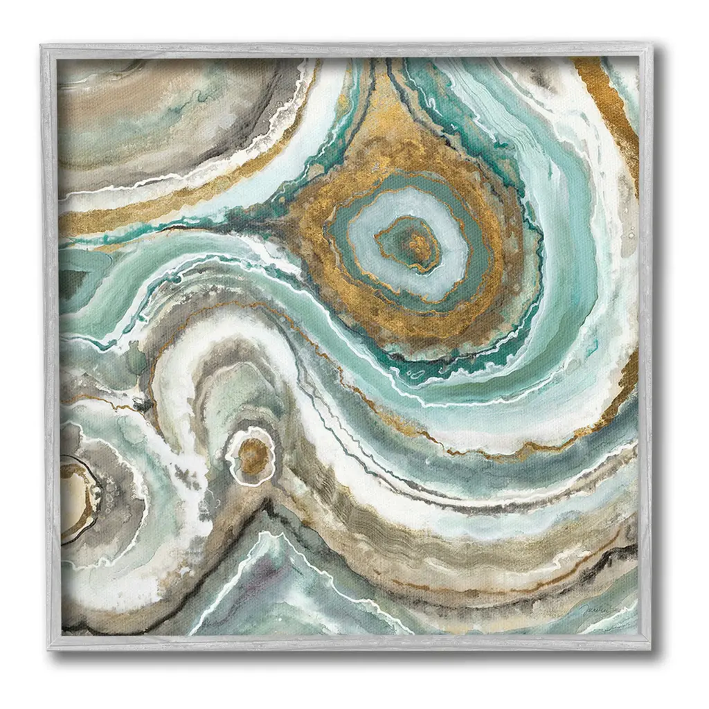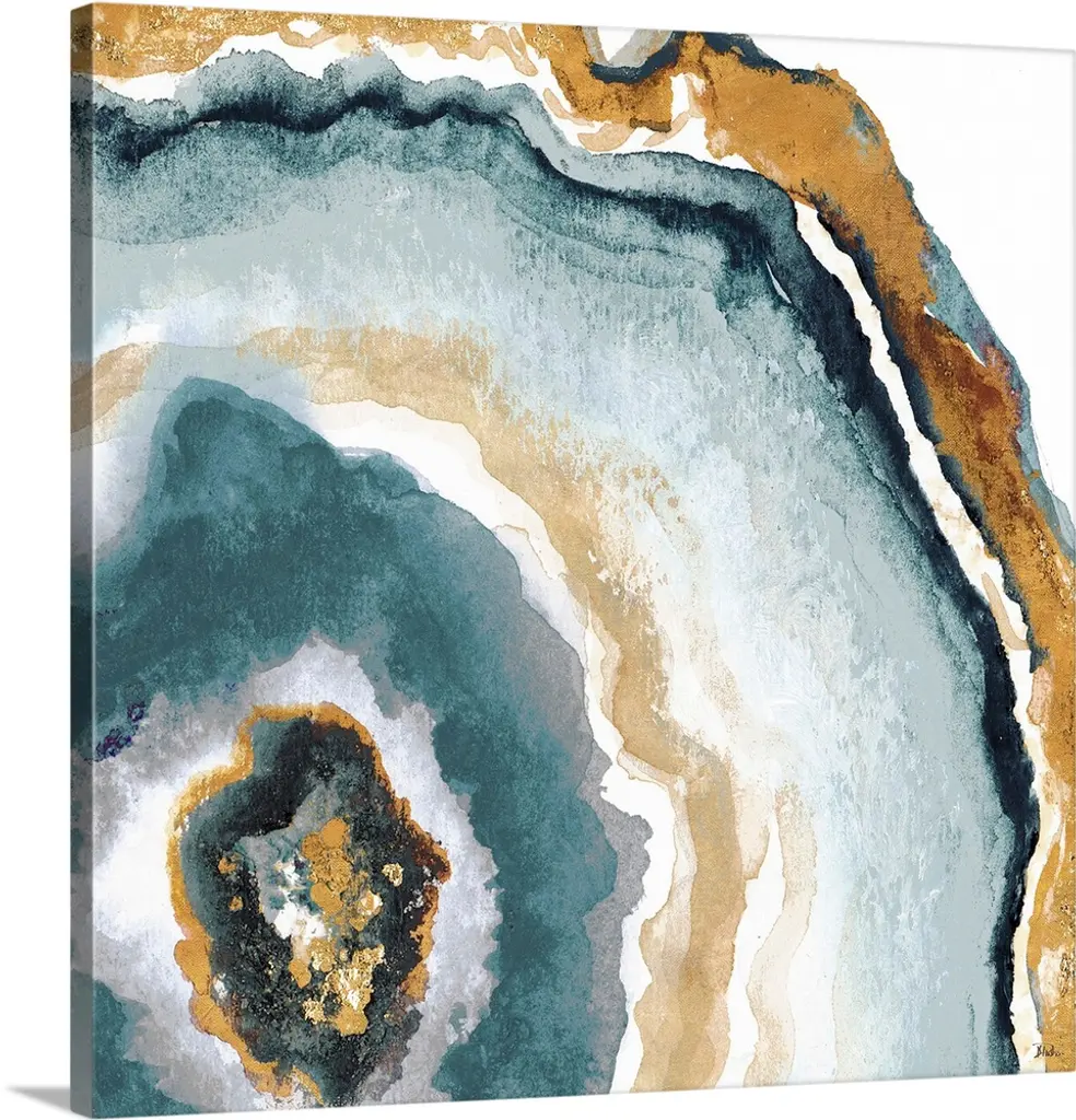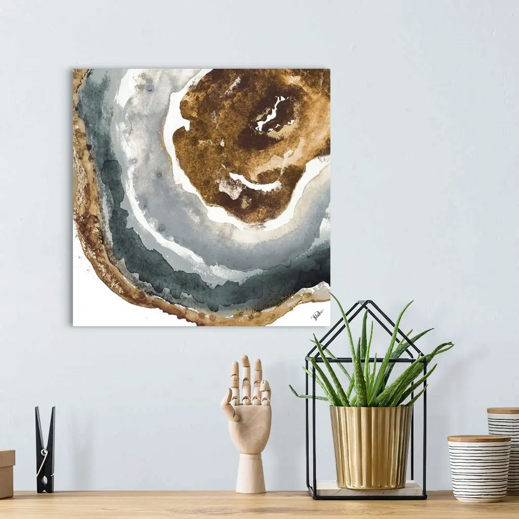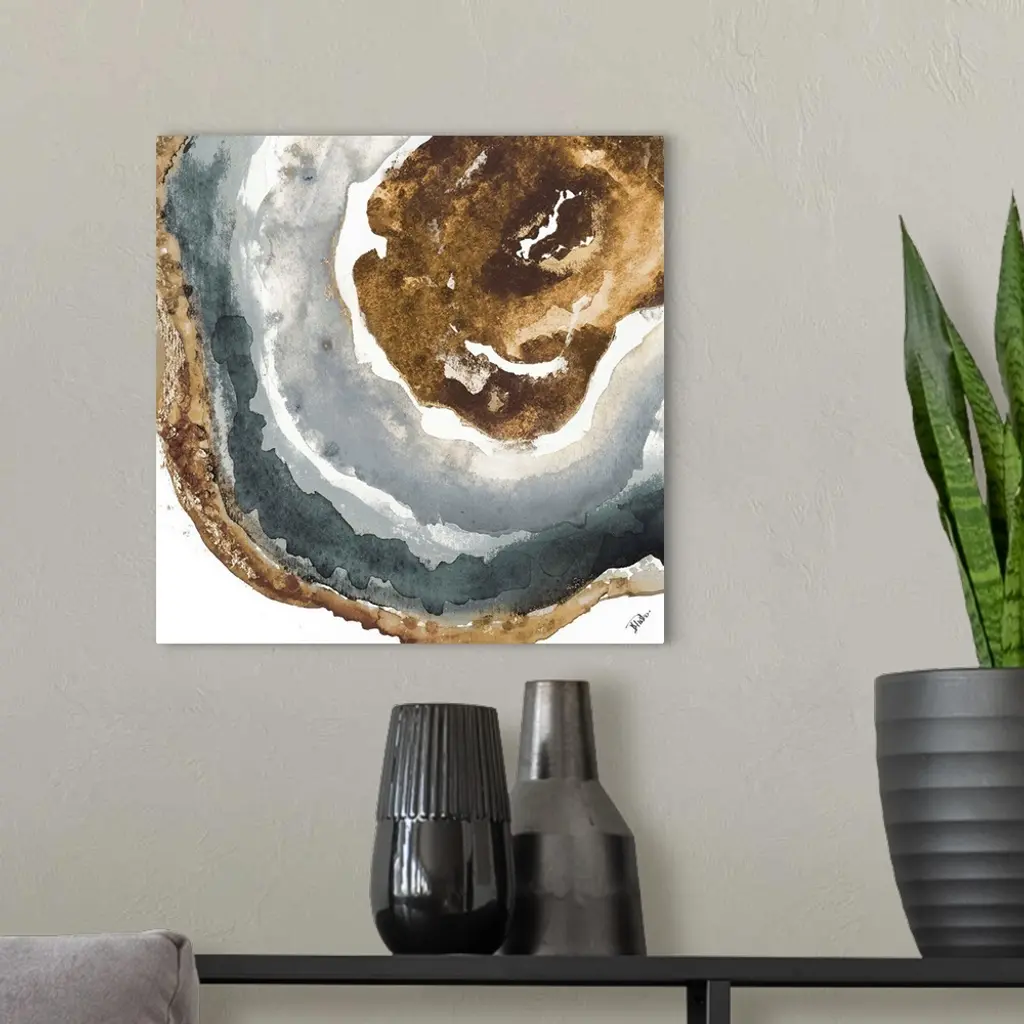 This contemporary artwork offers the intricacies of sliced agate completed in watercolors with gold accents.