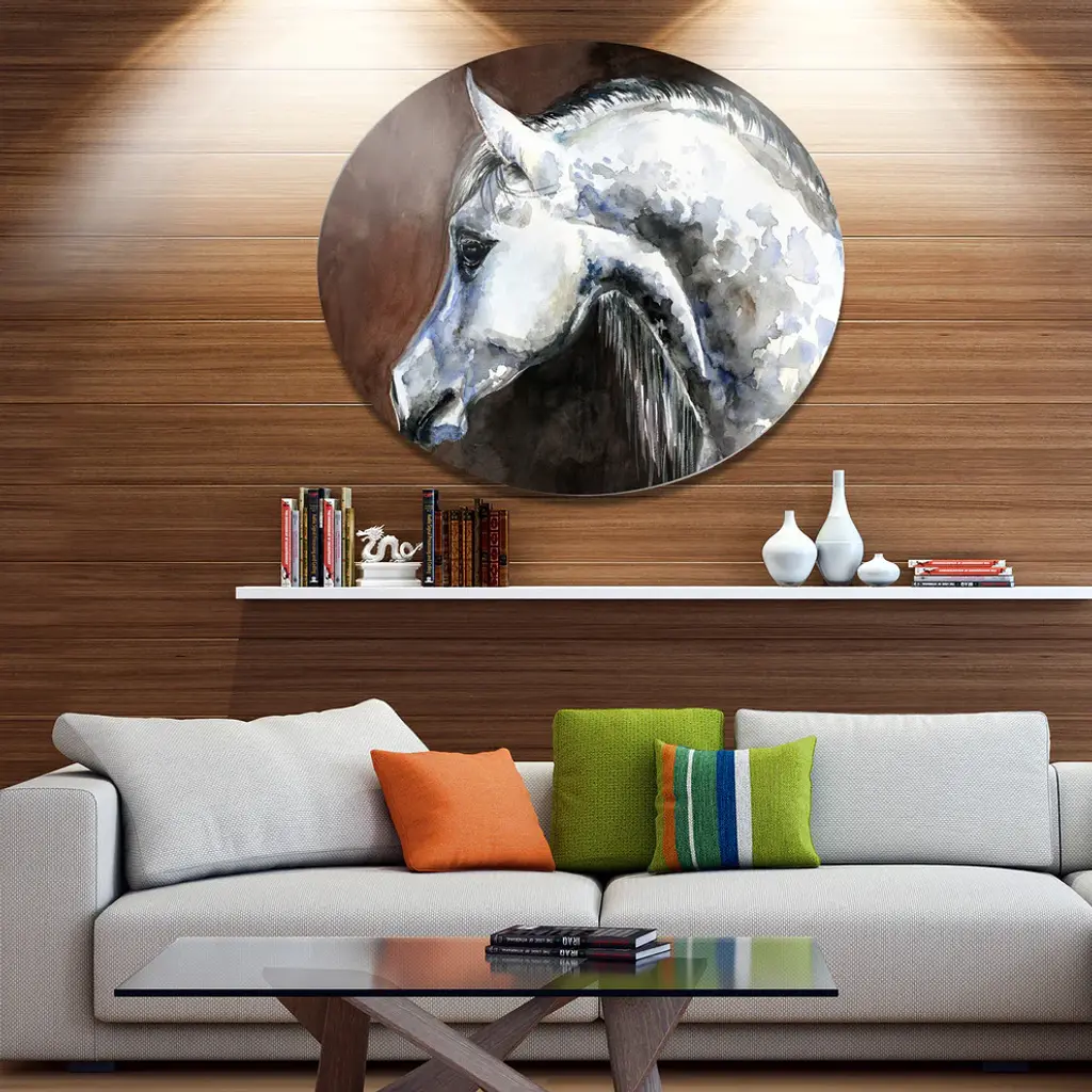 Bring Contemporary Abstraction to your home with this large Circle Metal wall art. This Gray Arabian Horse Watercolor Metal Artwork makes it the focal point of any room or office. - White Gloss Coating ensures colors are extra vibrant with light reflection.- Aluminum grade Sheet Metal with 1 inch mounting frame on the back giving the illusion that the artwork is floating on the wall..- Mounting Brackets are included along with instructions.- High Quality Digital images are created directly into a glossy aluminum panel producing a stunning and captivating print into the glossy finish of the metal.- Water, Fire and Scratch resistant HD Aluminum panels.- Looks better than any photo paper and guaranteed to last at least 20 years- Easy to clean with a microfiber cloth. Colors are far superior to regular Canvas Art. - Easy to Hang