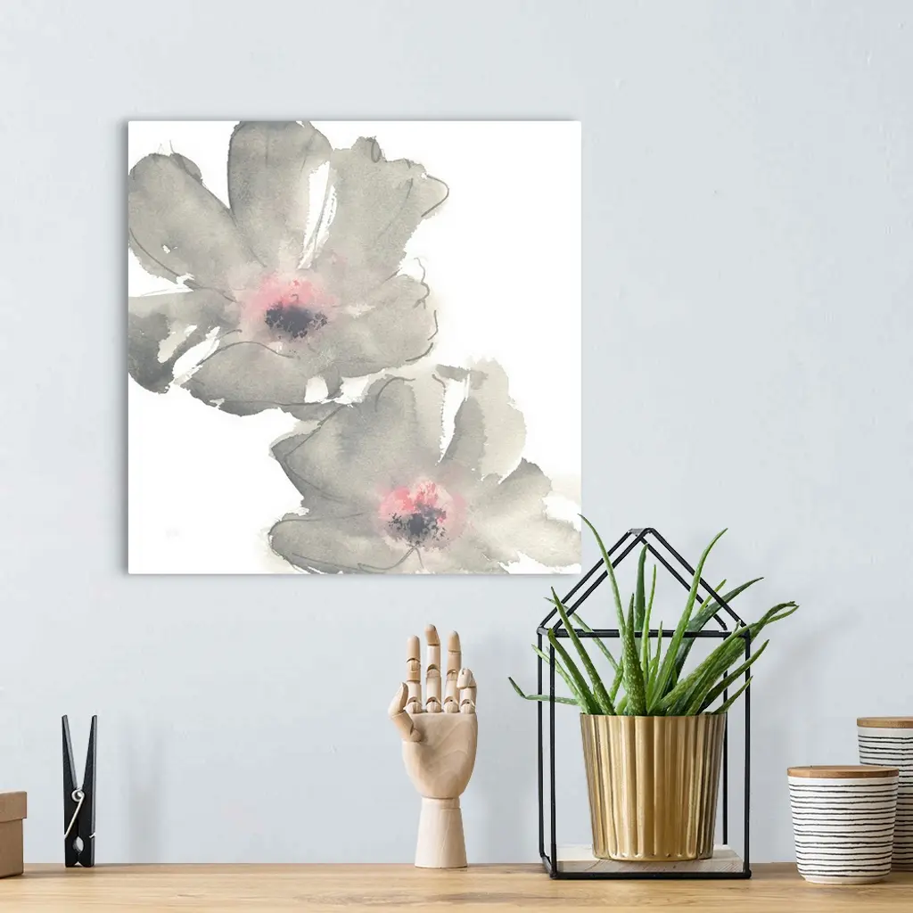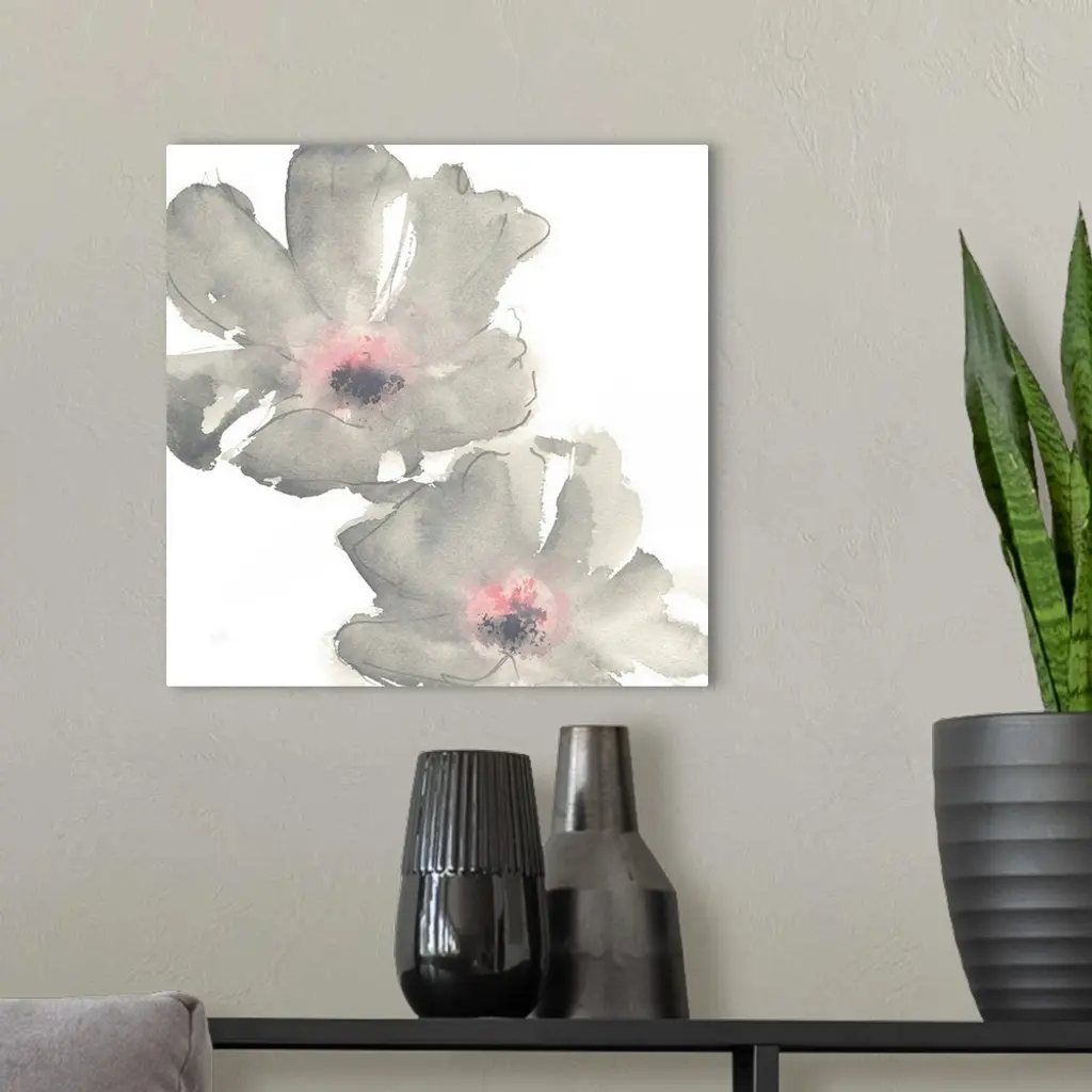 Decorative artwork of delicate flowers filled with pink and gray watercolor.
