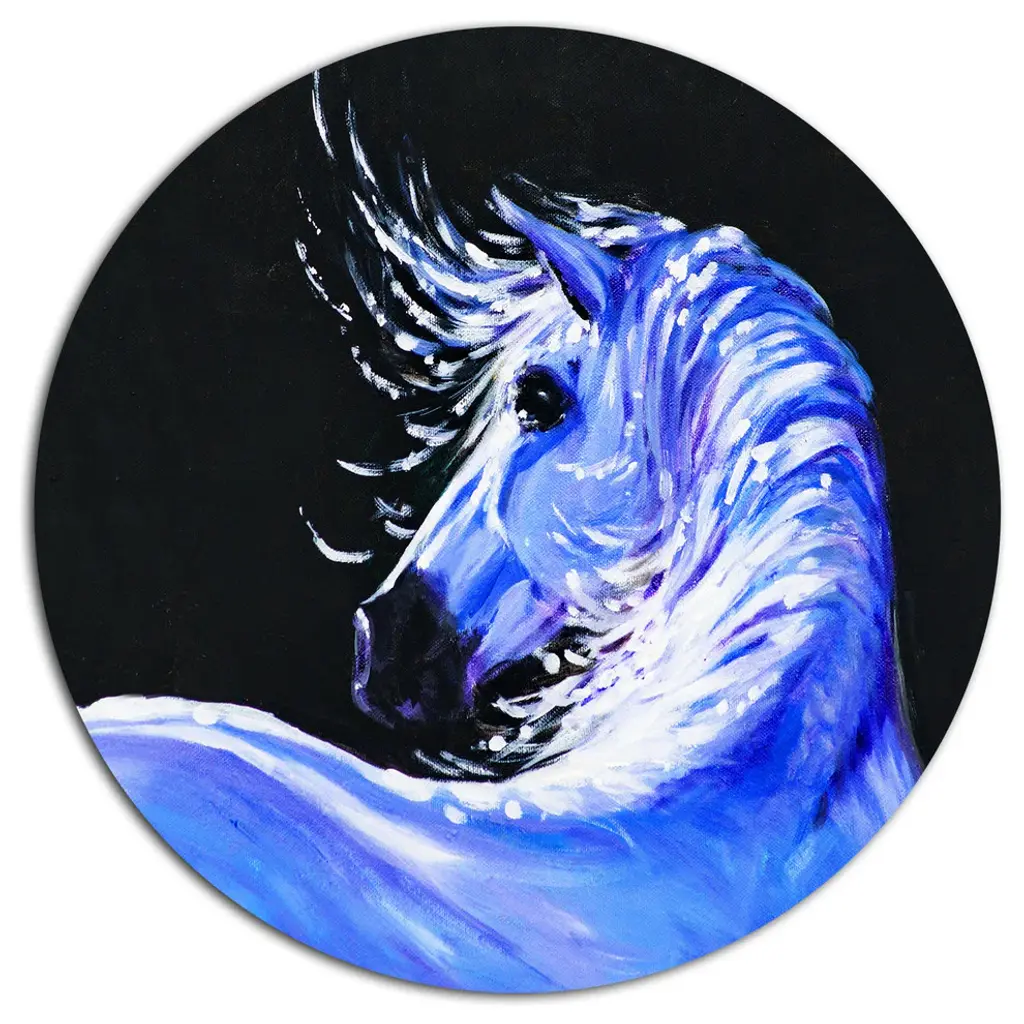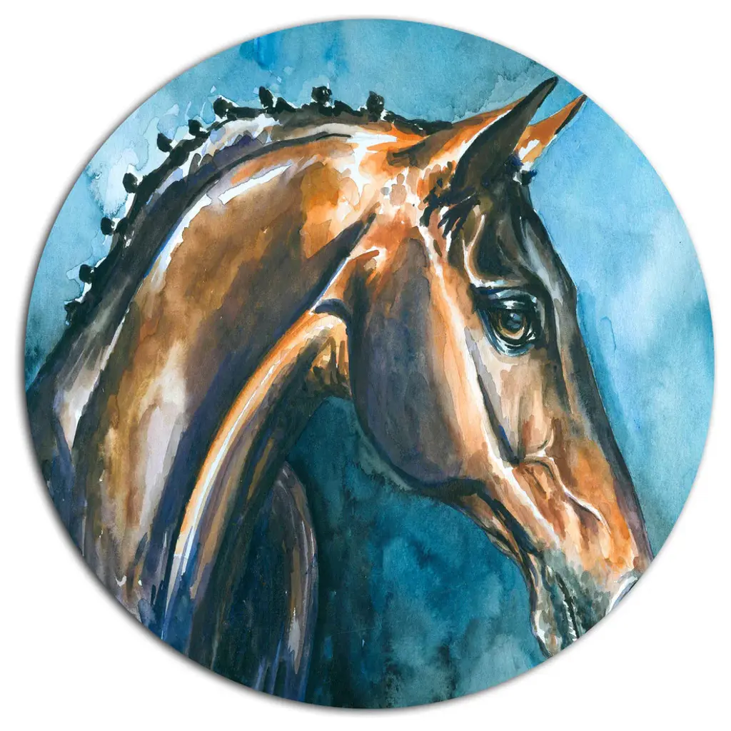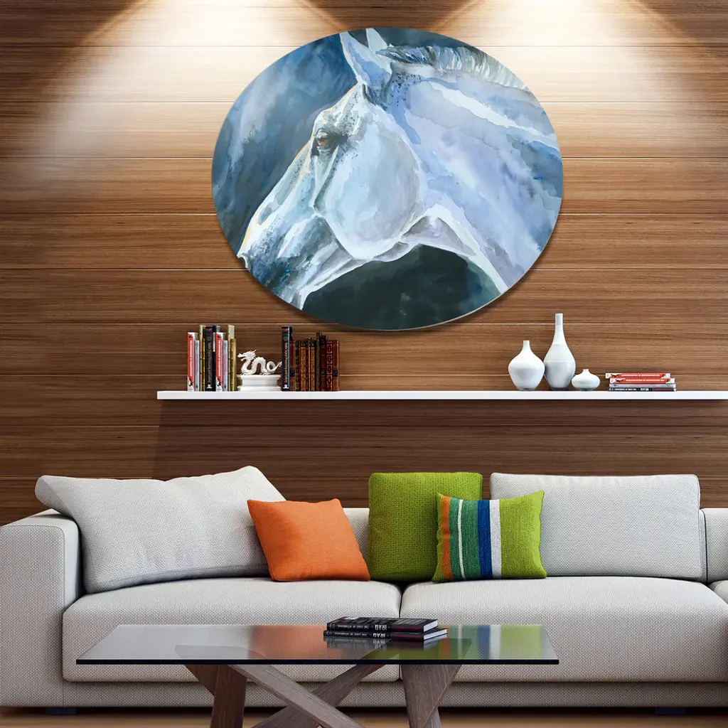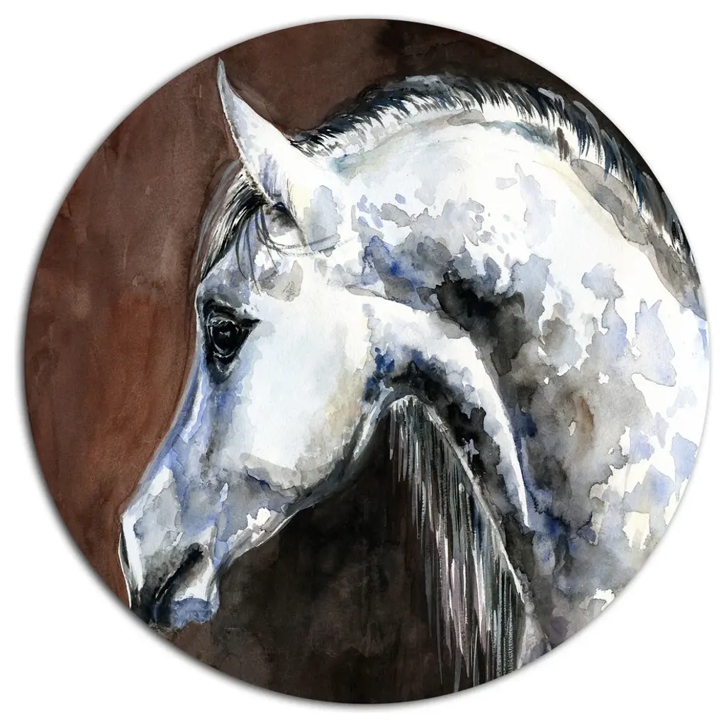 Bring Contemporary Abstraction to your home with this large Circle Metal wall art. This Gray Horse Watercolor Metal Artwork makes it the focal point of any room or office. - White Gloss Coating ensures colors are extra vibrant with light reflection.- Aluminum grade Sheet Metal with 1 inch mounting frame on the back giving the illusion that the artwork is floating on the wall..- Mounting Brackets are included along with instructions.- High Quality Digital images are created directly into a glossy aluminum panel producing a stunning and captivating print into the glossy finish of the metal.- Water, Fire and Scratch resistant HD Aluminum panels.- Looks better than any photo paper and guaranteed to last at least 20 years- Easy to clean with a microfiber cloth. Colors are far superior to regular Canvas Art. - Easy to Hang