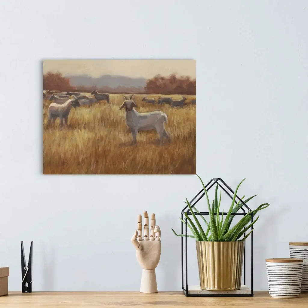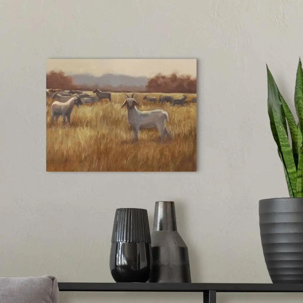 A contemporary horizontal painting of a group of goats in a field with one goat looking toward the viewer.