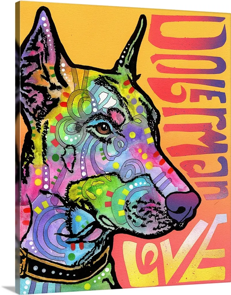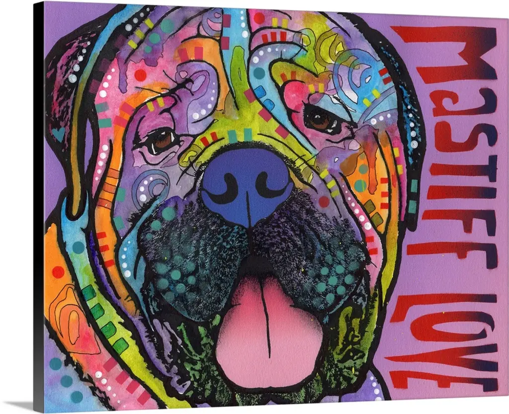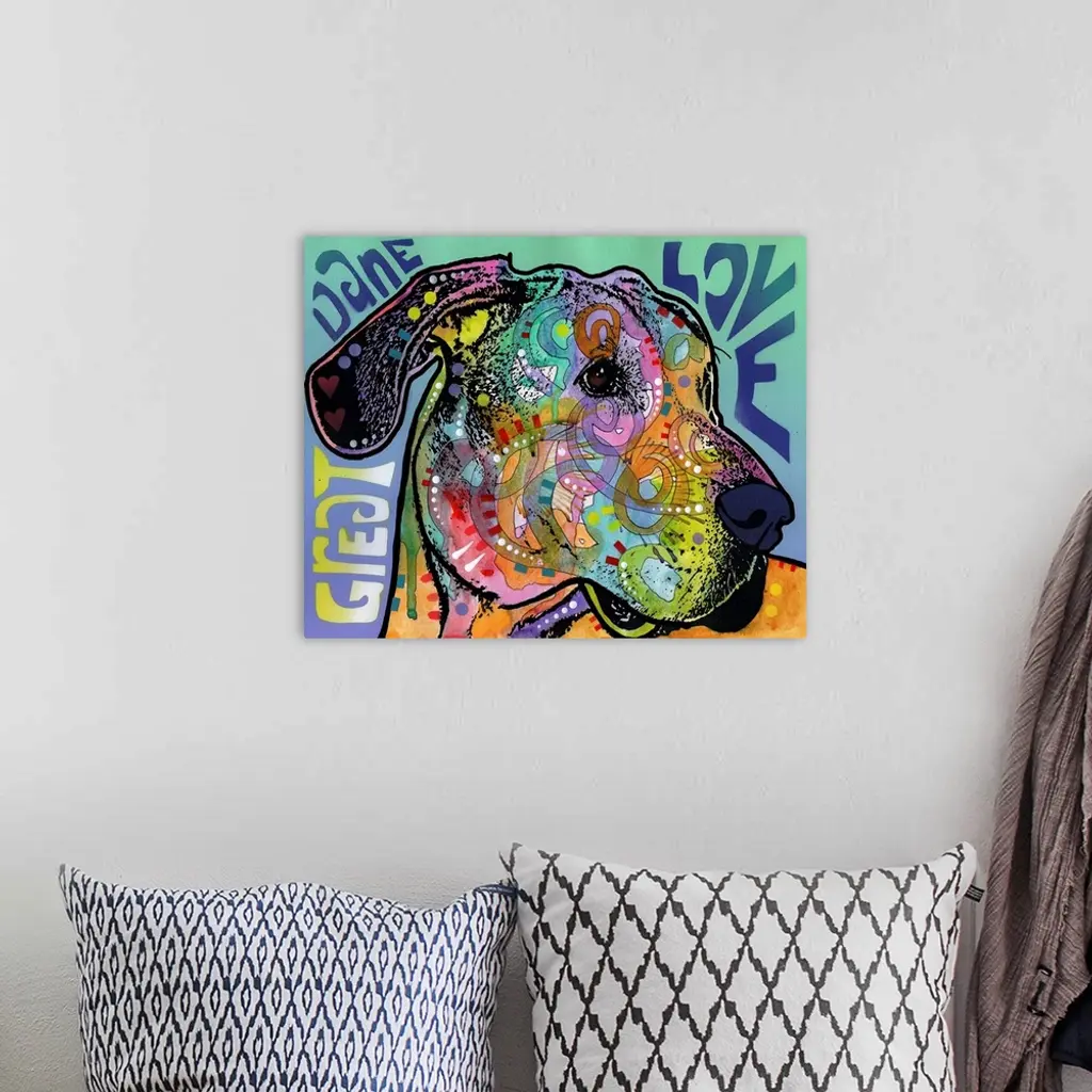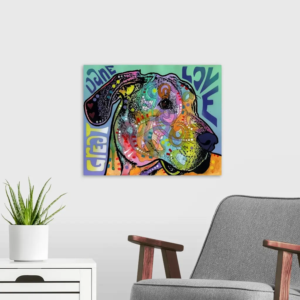 "Great Dane Love" written around a colorful painting of a Great Dane with abstract markings.