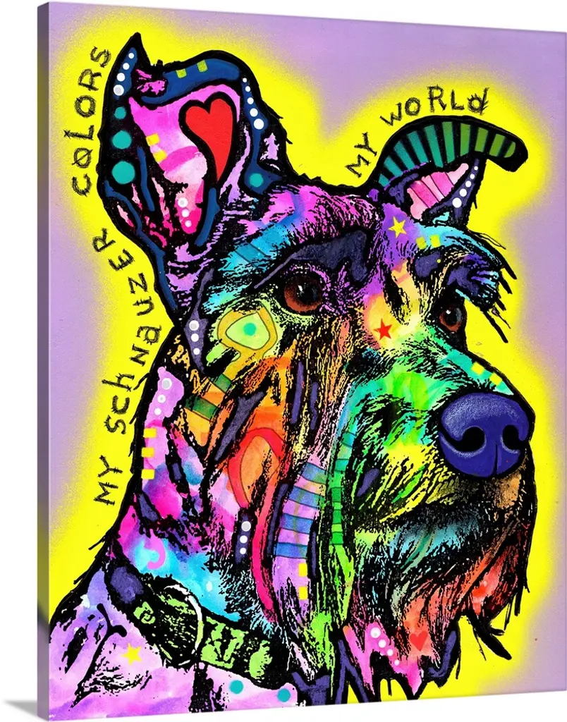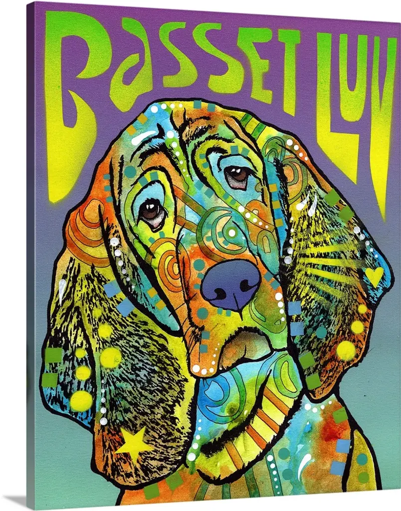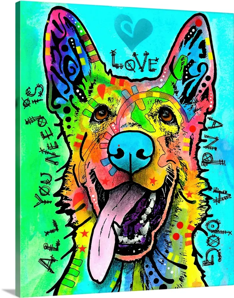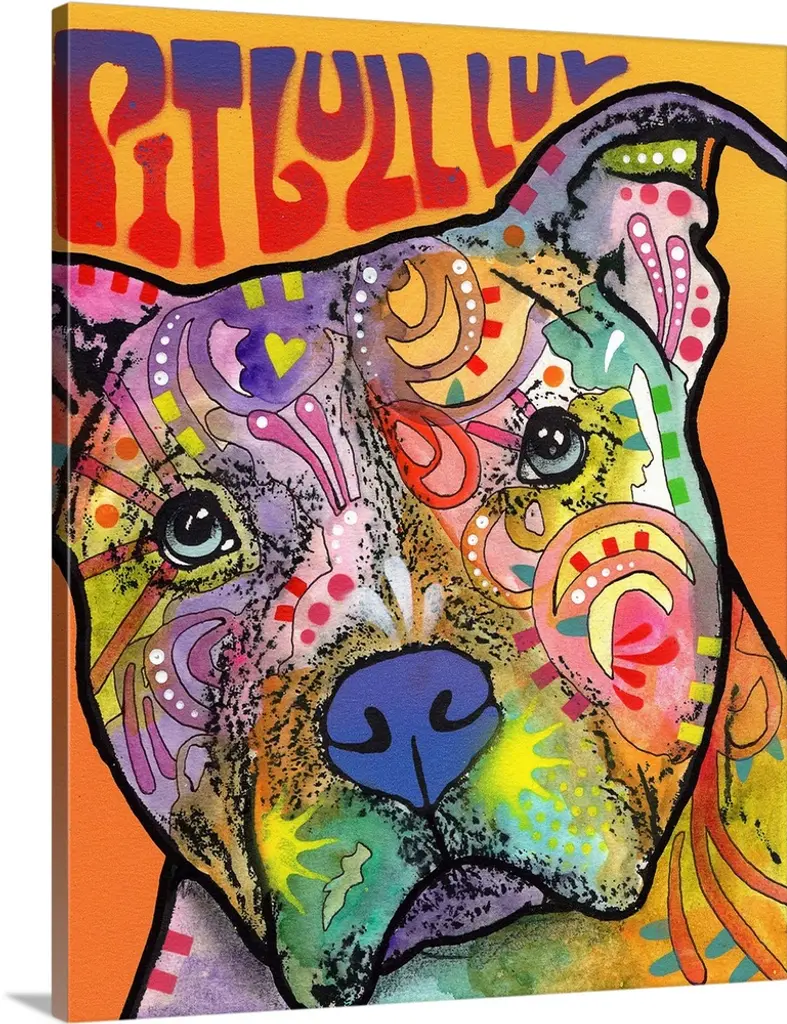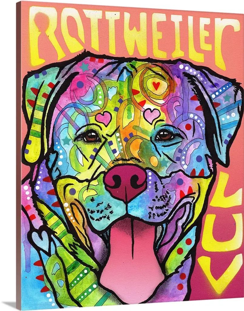 "Great Dane Love" written around a colorful painting of a Great Dane with abstract markings.