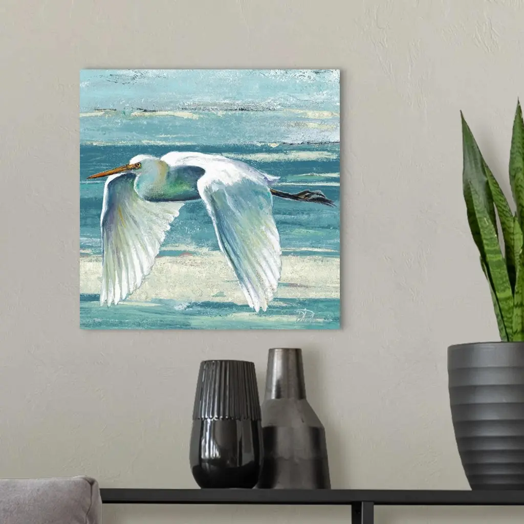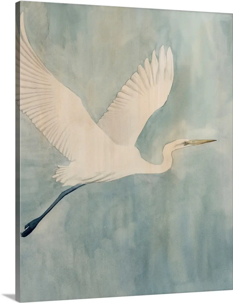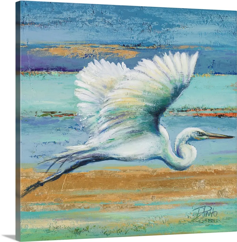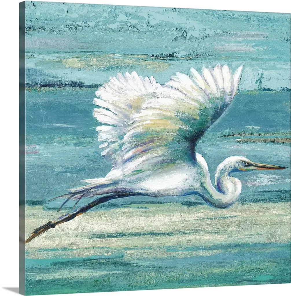 Contemporary painting of a white egret in flight against a blue abstract background.