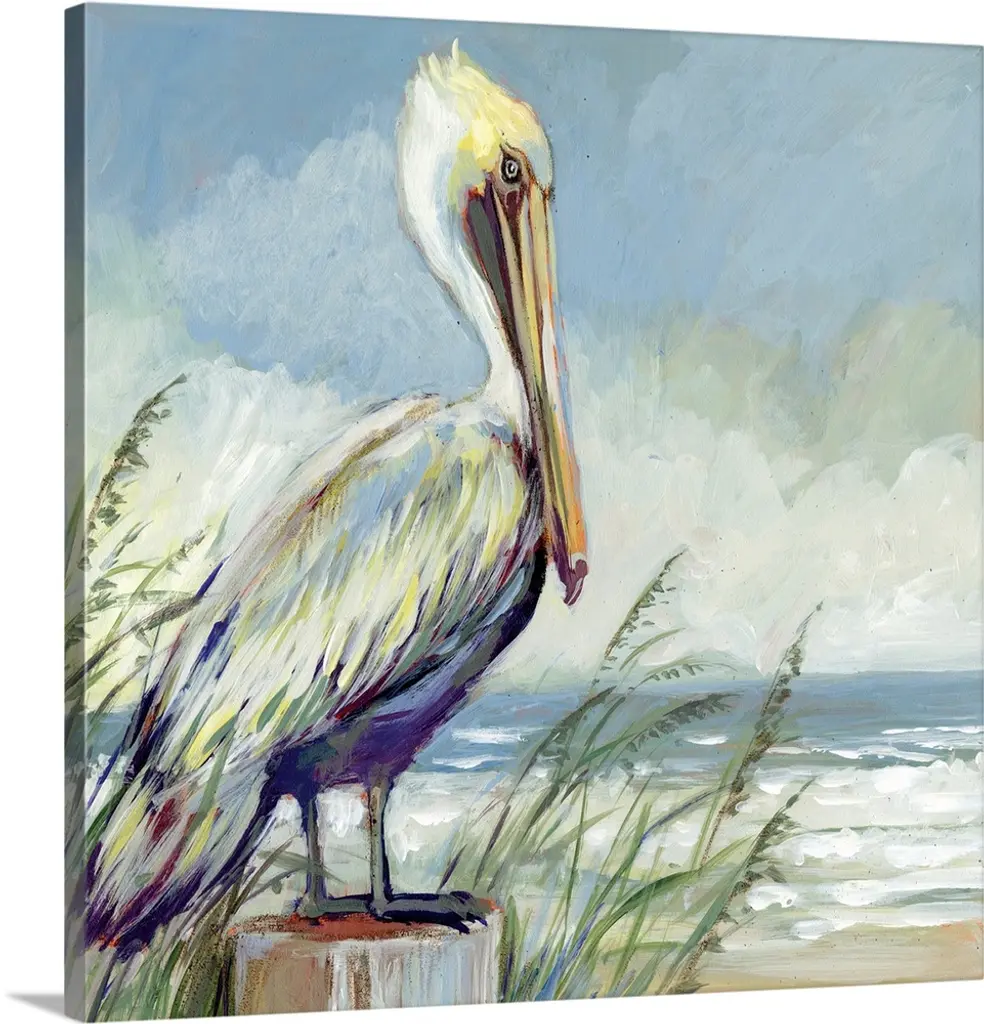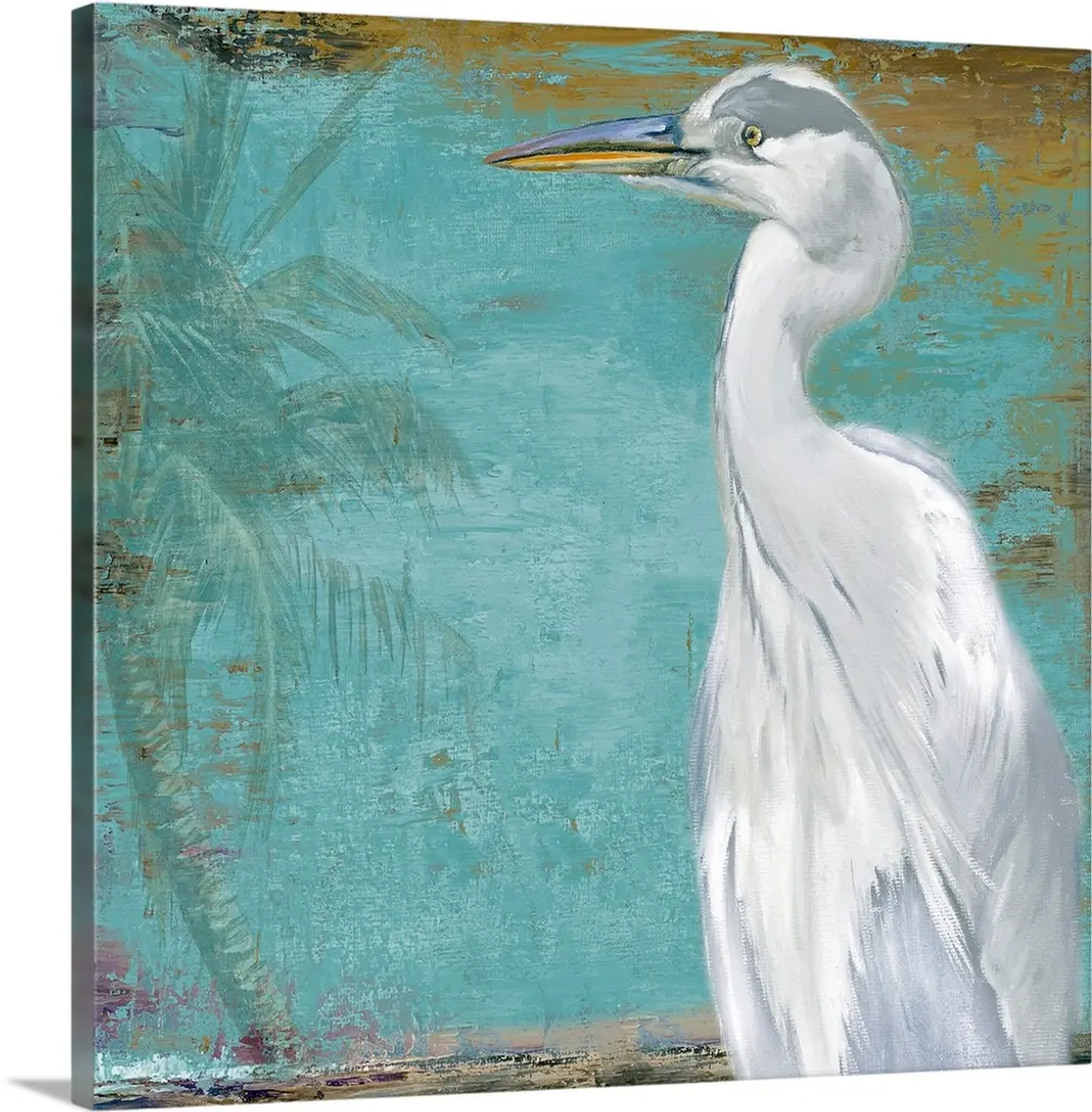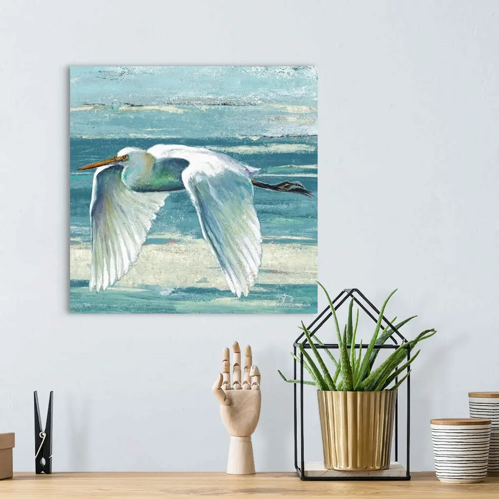Contemporary painting of a white egret in flight against a blue abstract background.