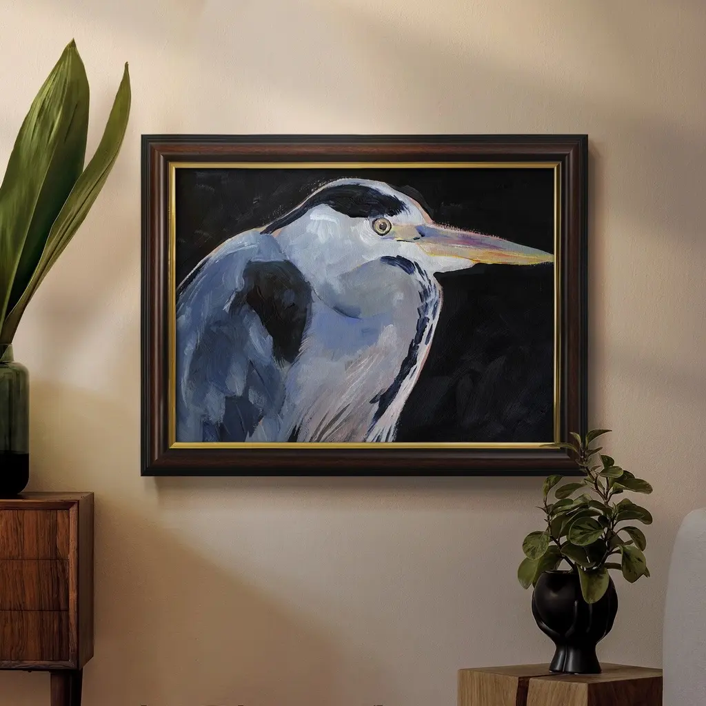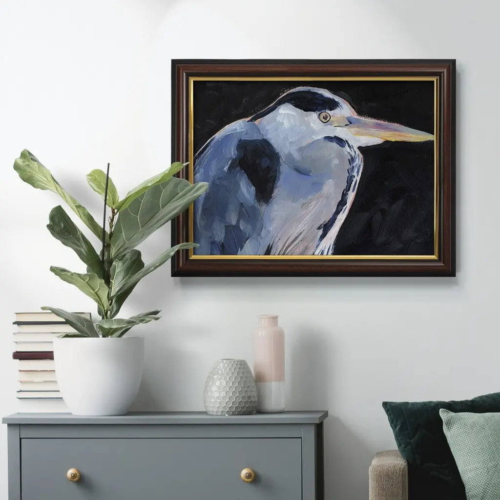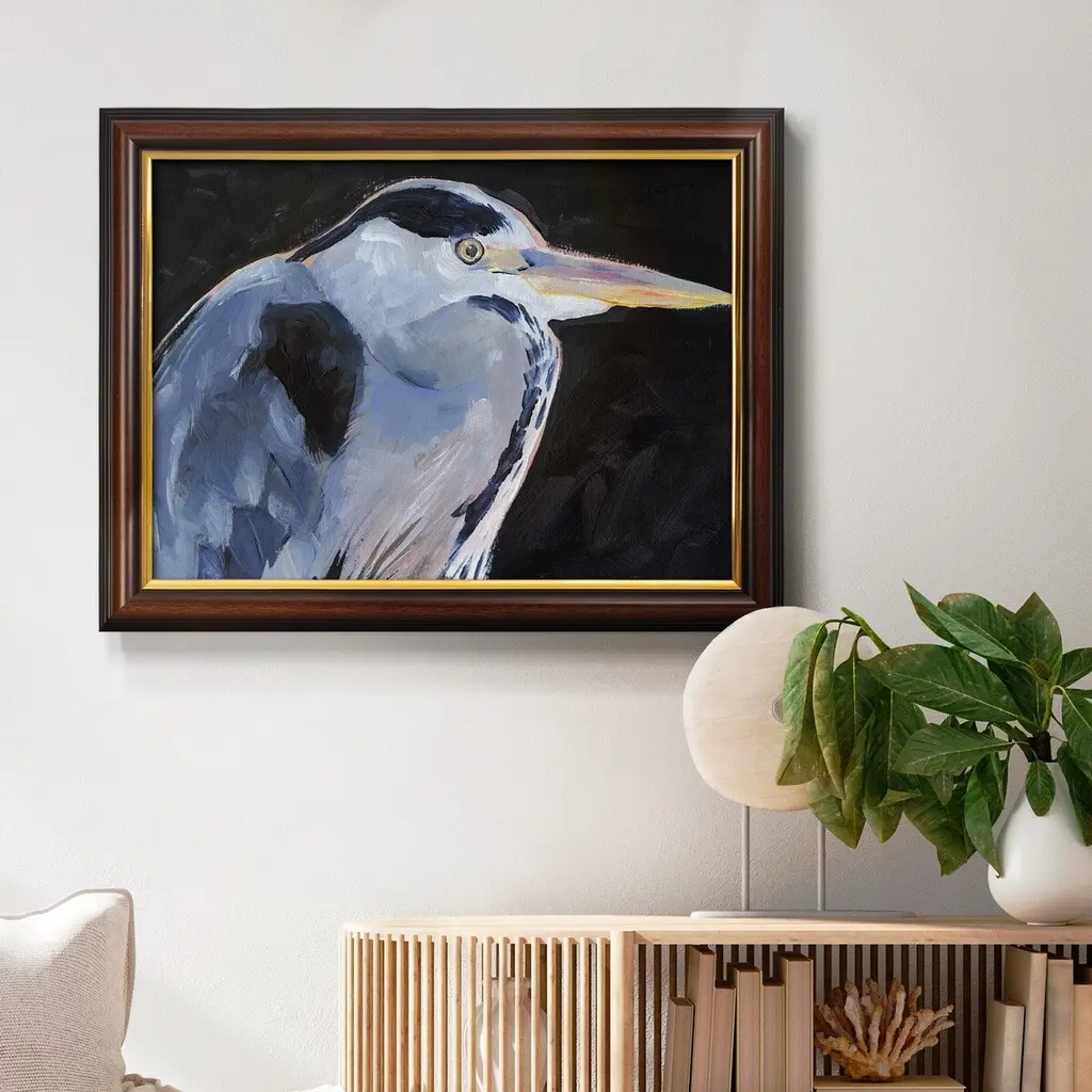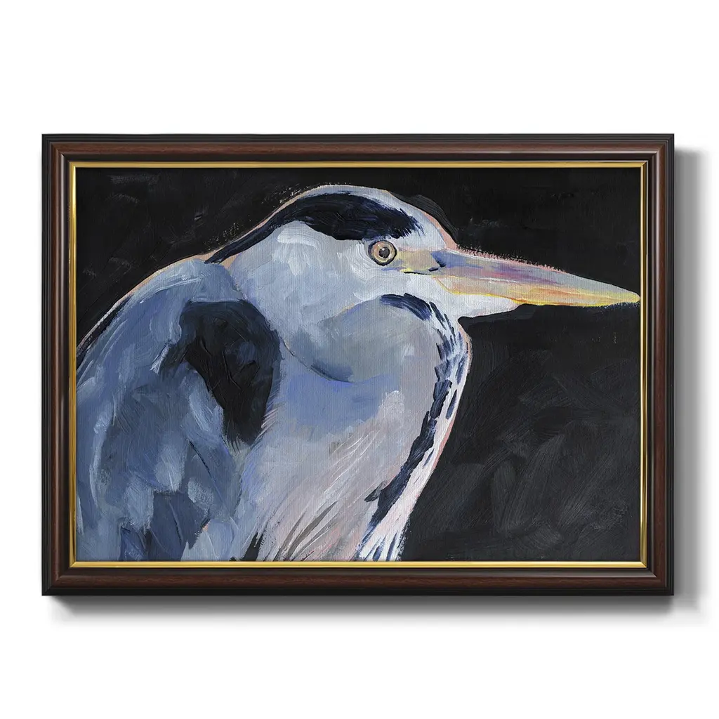 Great Heron I Premium Framed Canvas- Ready to Hang A Premium Framed Canvas created to last. Framed in distressed wood and available in an array of sizes and colors Featuring a beveled a solid wood stretcher bar, each piece comes ready to hand 3 SIZES AVAILABLE 16''X20'' - Overall Size 18'X27'' - Overall Size 24''x36'' - Overall Size Each piece is made to order. Each piece comes with hanging hardware. Made in the USA Ready to Hang Giclee Paper Print Acrylic Glass Beveled Matt Board