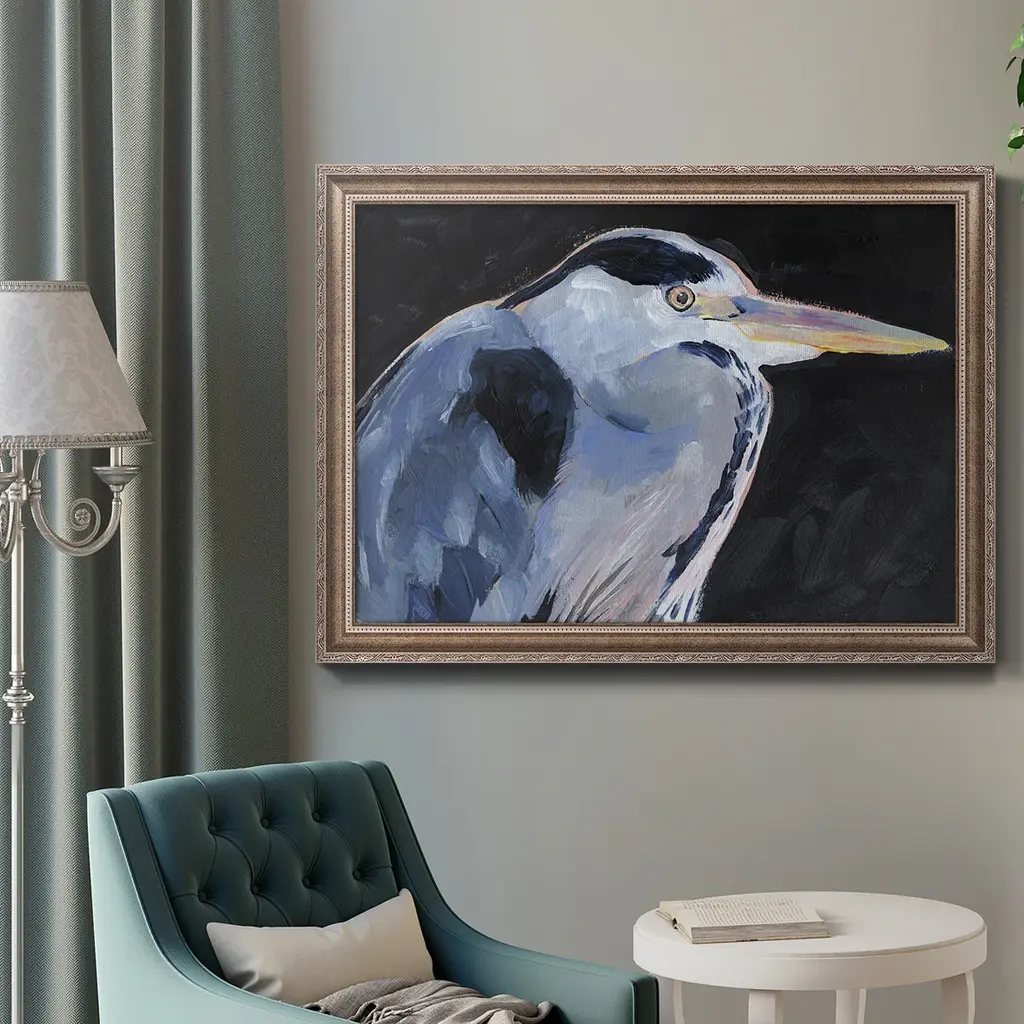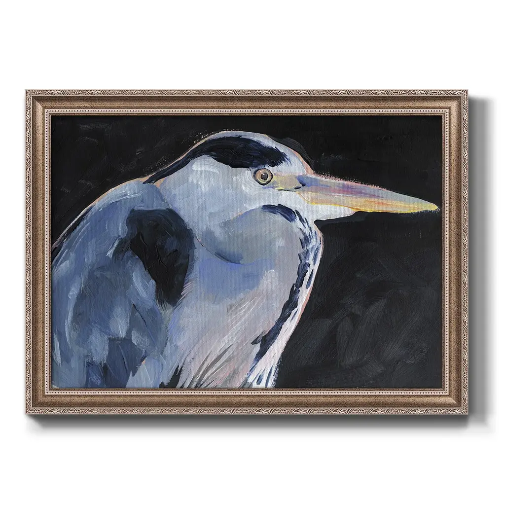 Great Heron I Premium Framed Canvas- Ready to Hang A Premium Framed Canvas created to last. Framed in distressed wood and available in an array of sizes and colors Featuring a beveled a solid wood stretcher bar, each piece comes ready to hand 3 SIZES AVAILABLE 16''X20'' - Overall Size 18'X27'' - Overall Size 24''x36'' - Overall Size Each piece is made to order. Each piece comes with hanging hardware. Made in the USA Ready to Hang Giclee Paper Print Acrylic Glass Beveled Matt Board