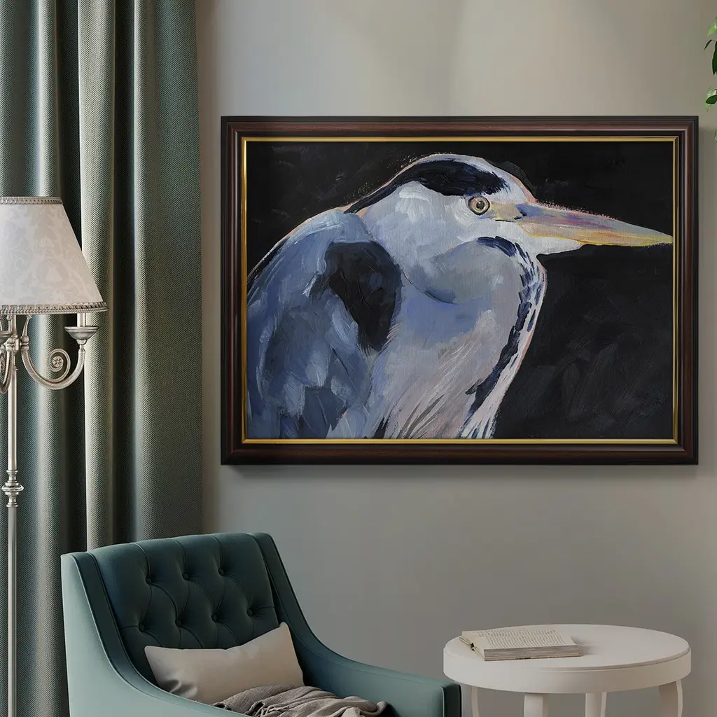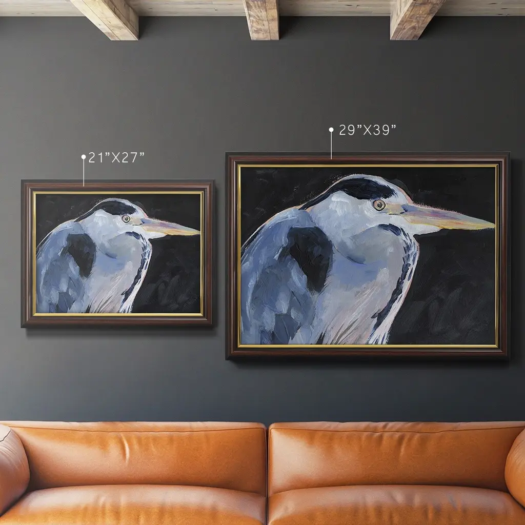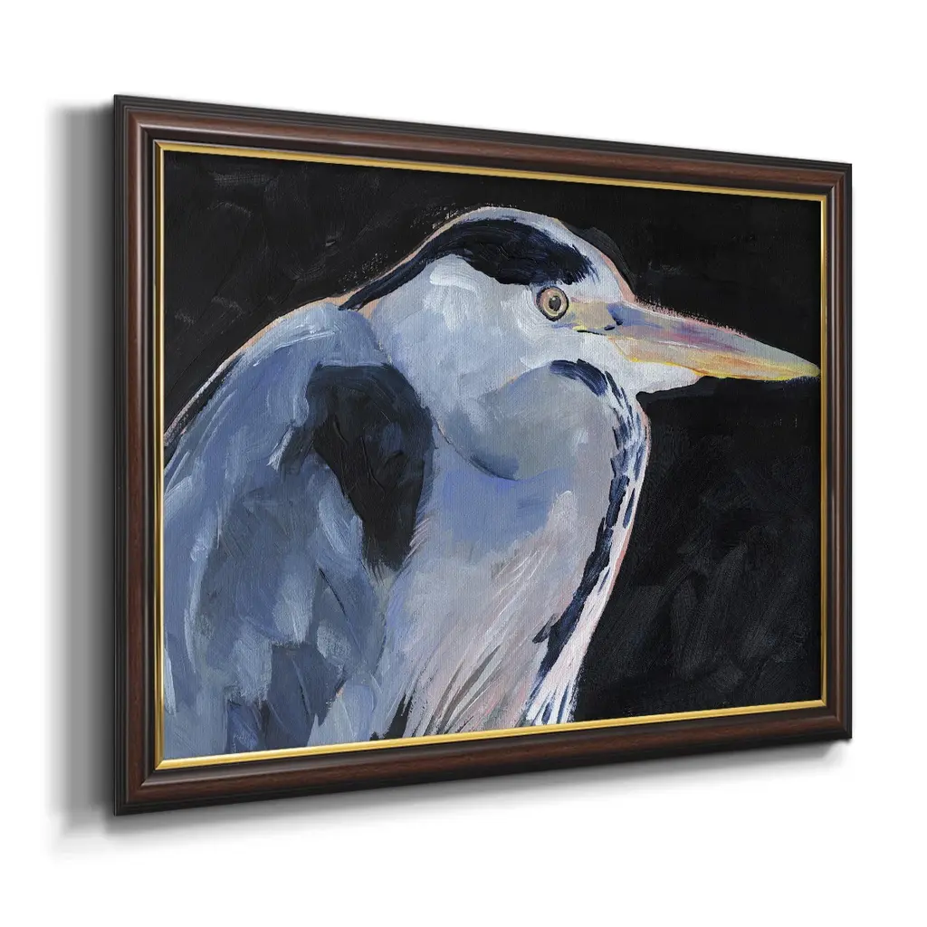 Great Heron I Premium Framed Canvas- Ready to Hang A Premium Framed Canvas created to last. Framed in distressed wood and available in an array of sizes and colors Featuring a beveled a solid wood stretcher bar, each piece comes ready to hand 3 SIZES AVAILABLE 16''X20'' - Overall Size 18'X27'' - Overall Size 24''x36'' - Overall Size Each piece is made to order. Each piece comes with hanging hardware. Made in the USA Ready to Hang Giclee Paper Print Acrylic Glass Beveled Matt Board