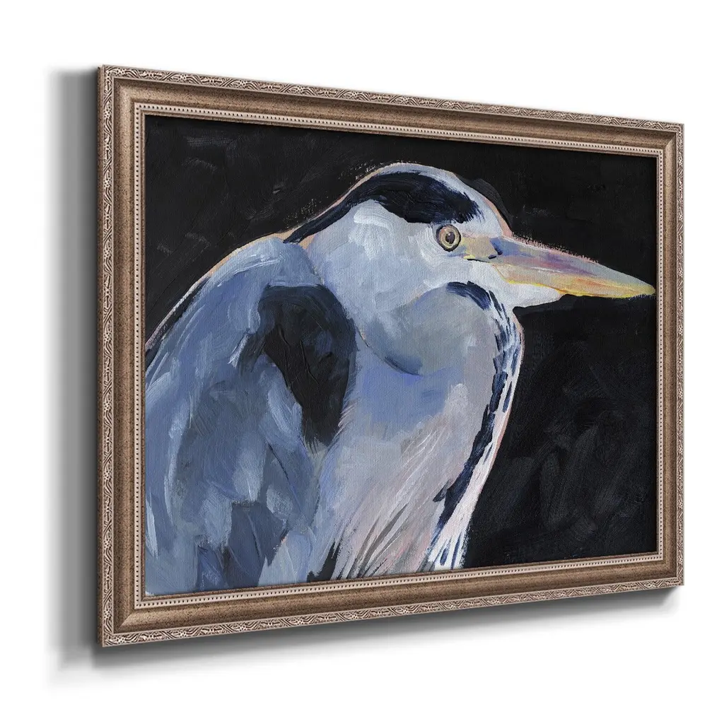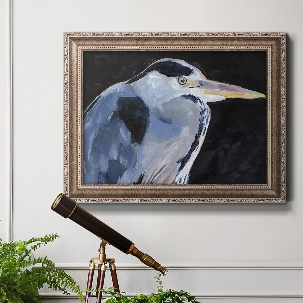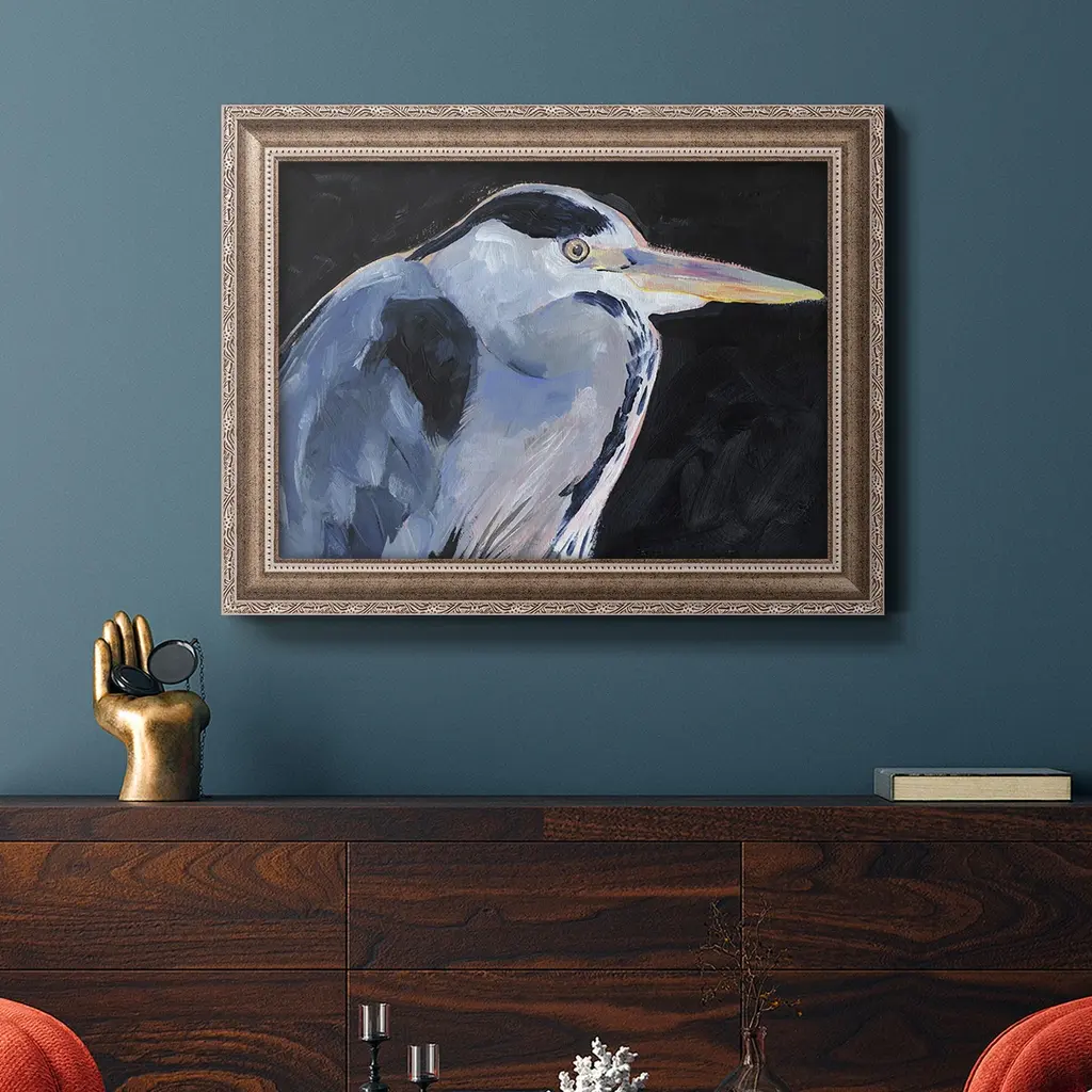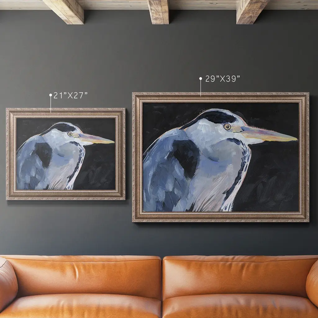 Great Heron I Premium Framed Canvas- Ready to Hang A Premium Framed Canvas created to last. Framed in distressed wood and available in an array of sizes and colors Featuring a beveled a solid wood stretcher bar, each piece comes ready to hand 3 SIZES AVAILABLE 16''X20'' - Overall Size 18'X27'' - Overall Size 24''x36'' - Overall Size Each piece is made to order. Each piece comes with hanging hardware. Made in the USA Ready to Hang Giclee Paper Print Acrylic Glass Beveled Matt Board