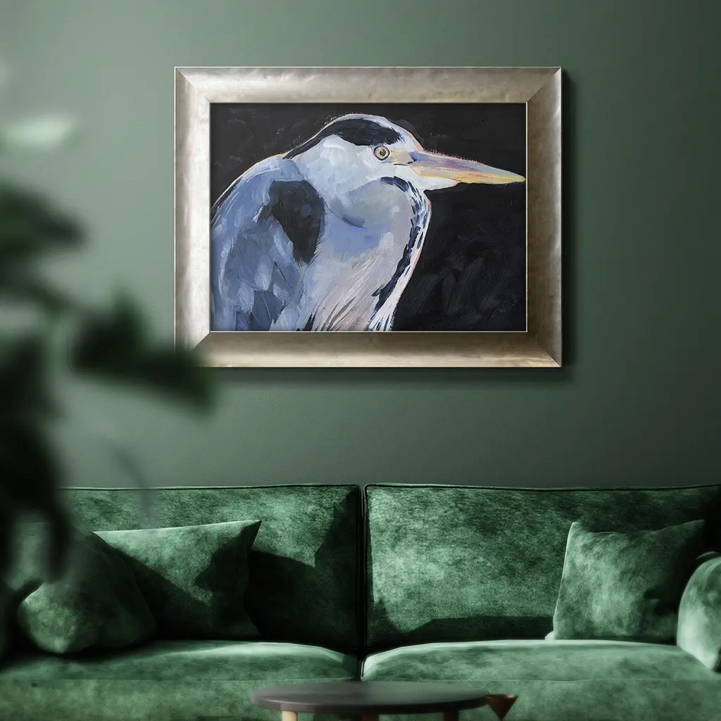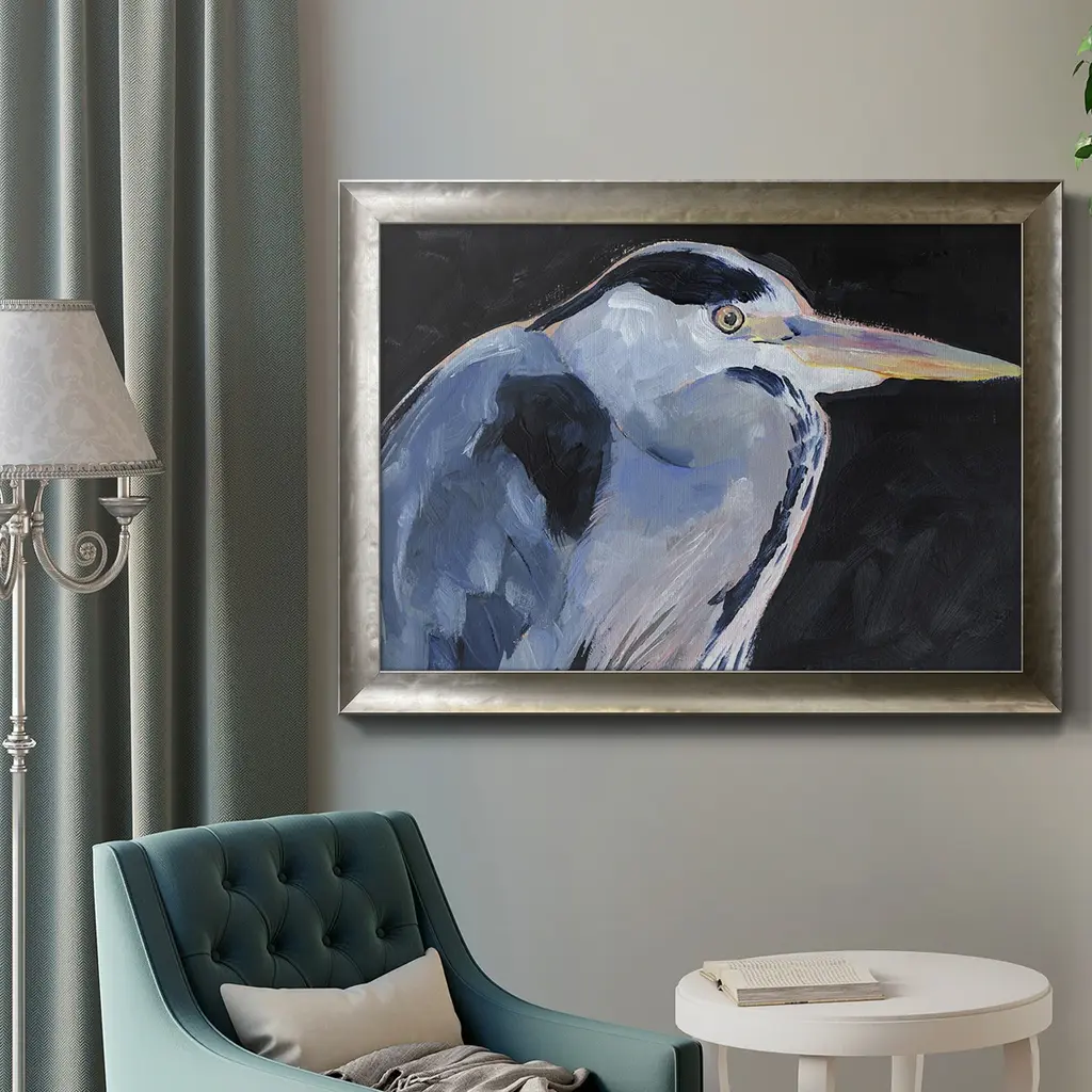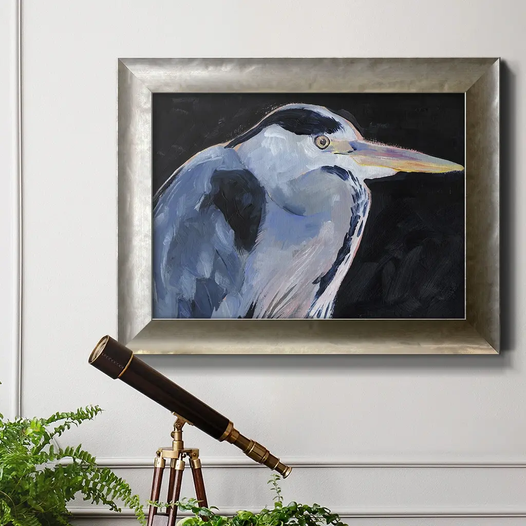 Great Heron I Premium Framed Canvas- Ready to Hang A Premium Framed Canvas created to last. Framed in distressed wood and available in an array of sizes and colors Featuring a beveled a solid wood stretcher bar, each piece comes ready to hand 3 SIZES AVAILABLE 16''X20'' - Overall Size 18'X27'' - Overall Size 24''x36'' - Overall Size Each piece is made to order. Each piece comes with hanging hardware. Made in the USA Ready to Hang Giclee Paper Print Acrylic Glass Beveled Matt Board