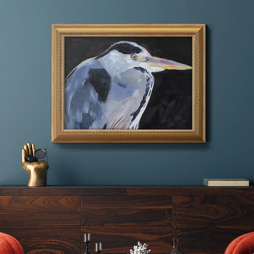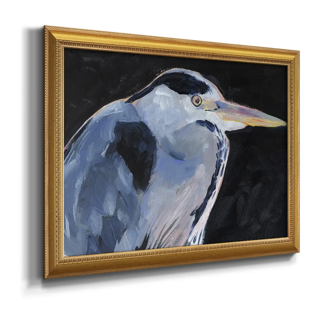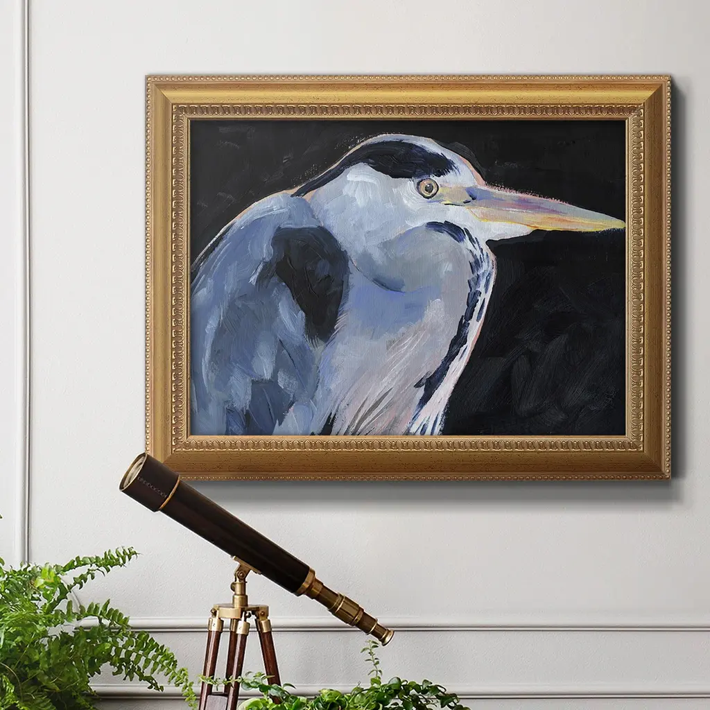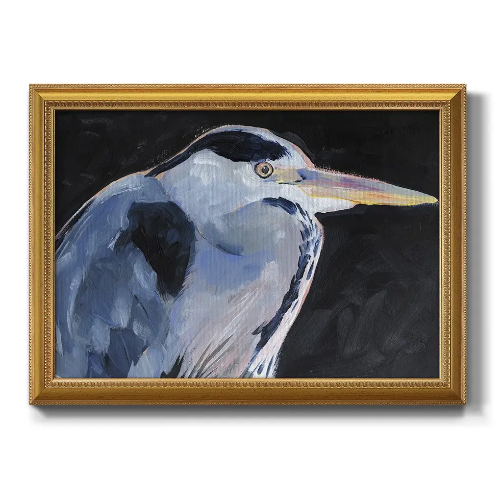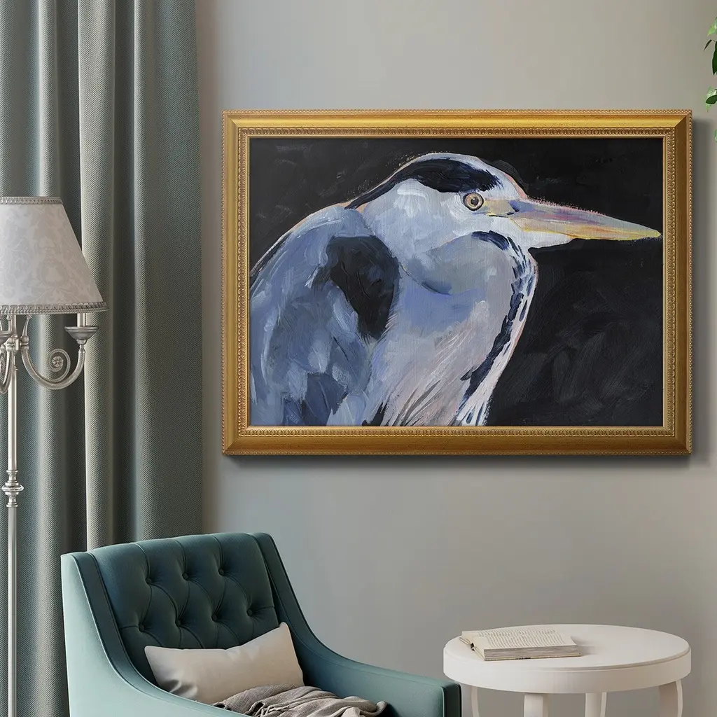Great Heron I Premium Framed Canvas- Ready to Hang A Premium Framed Canvas created to last. Framed in distressed wood and available in an array of sizes and colors Featuring a beveled a solid wood stretcher bar, each piece comes ready to hand 3 SIZES AVAILABLE 16''X20'' - Overall Size 18'X27'' - Overall Size 24''x36'' - Overall Size Each piece is made to order. Each piece comes with hanging hardware. Made in the USA Ready to Hang Giclee Paper Print Acrylic Glass Beveled Matt Board