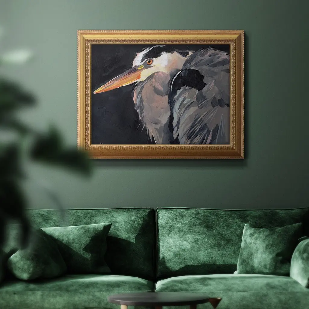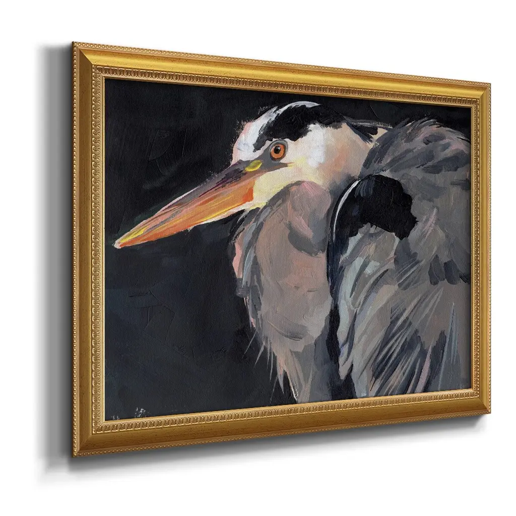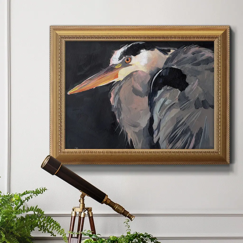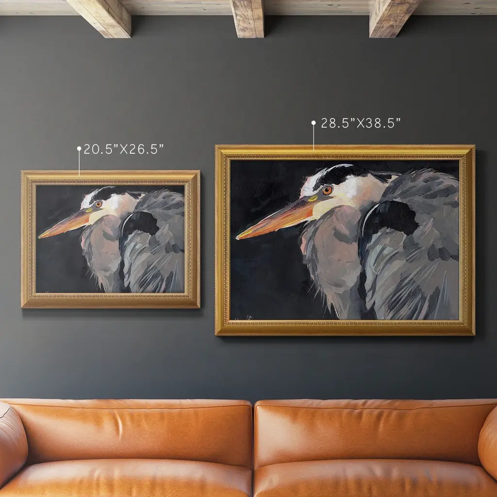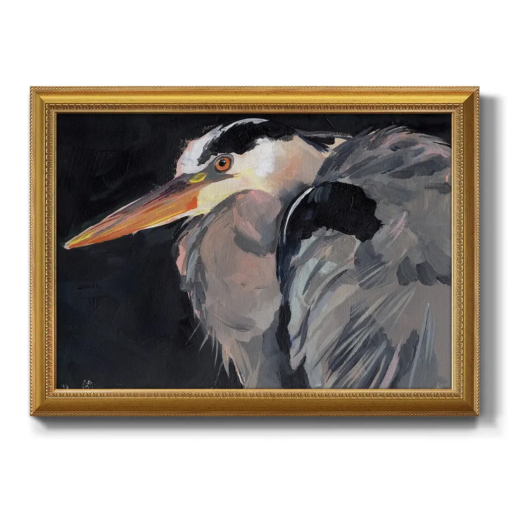 Great Heron II Premium Framed Canvas- Ready to Hang A Premium Framed Canvas created to last. Framed in distressed wood and available in an array of sizes and colors Featuring a beveled a solid wood stretcher bar, each piece comes ready to hand 3 SIZES AVAILABLE 16''X20'' - Overall Size 18'X27'' - Overall Size 24''x36'' - Overall Size Each piece is made to order. Each piece comes with hanging hardware. Made in the USA Ready to Hang Giclee Paper Print Acrylic Glass Beveled Matt Board