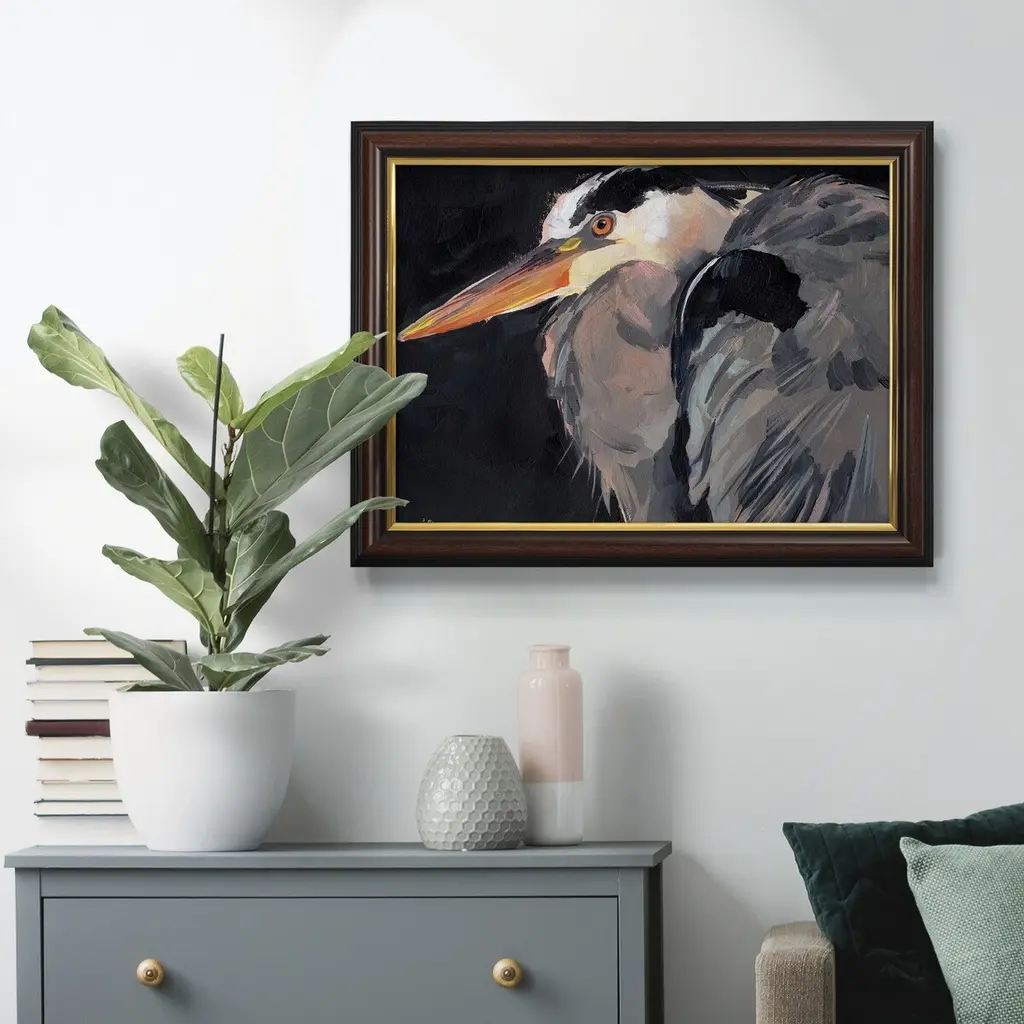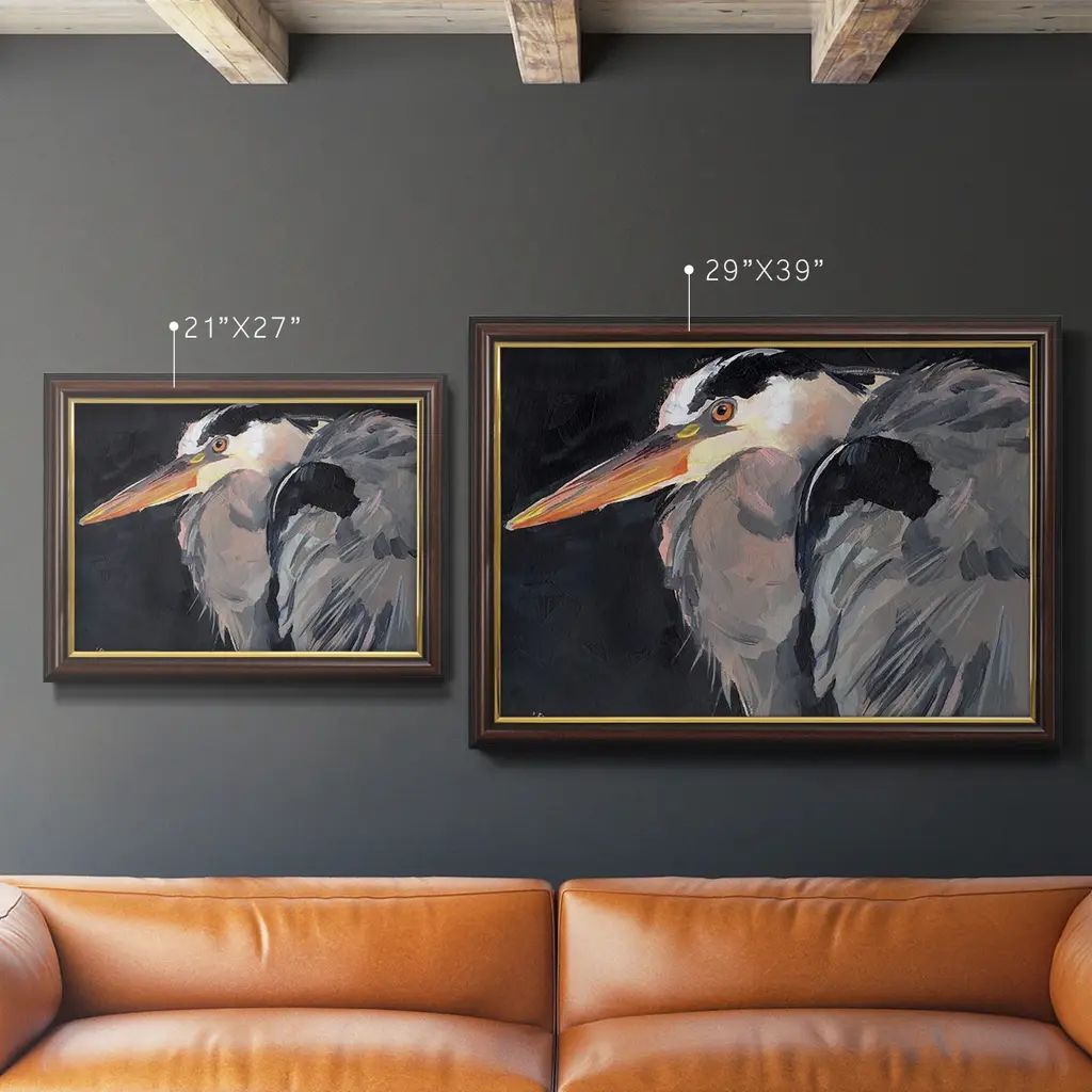 Great Heron II Premium Framed Canvas- Ready to Hang A Premium Framed Canvas created to last. Framed in distressed wood and available in an array of sizes and colors Featuring a beveled a solid wood stretcher bar, each piece comes ready to hand 3 SIZES AVAILABLE 16''X20'' - Overall Size 18'X27'' - Overall Size 24''x36'' - Overall Size Each piece is made to order. Each piece comes with hanging hardware. Made in the USA Ready to Hang Giclee Paper Print Acrylic Glass Beveled Matt Board