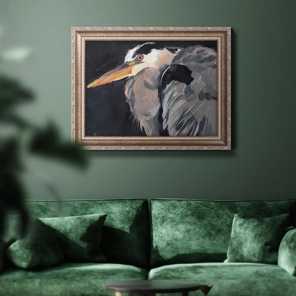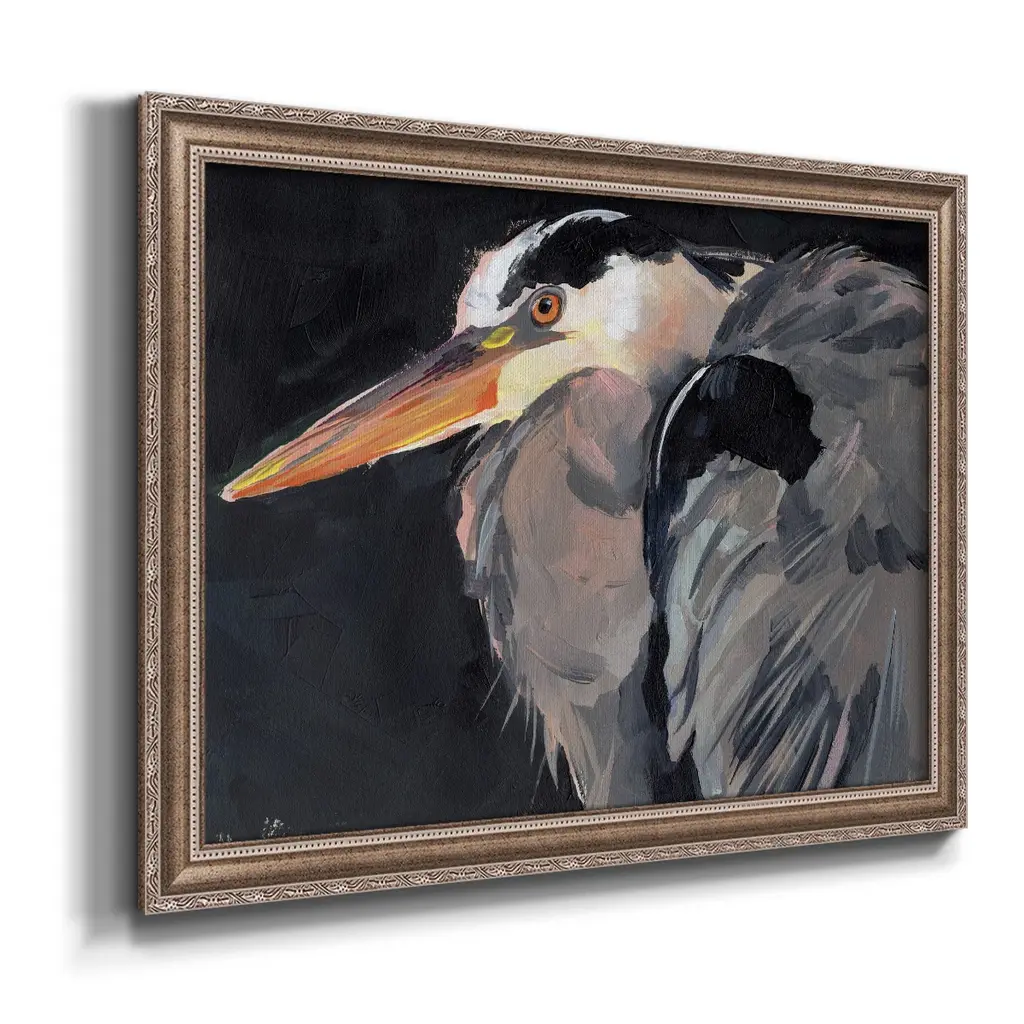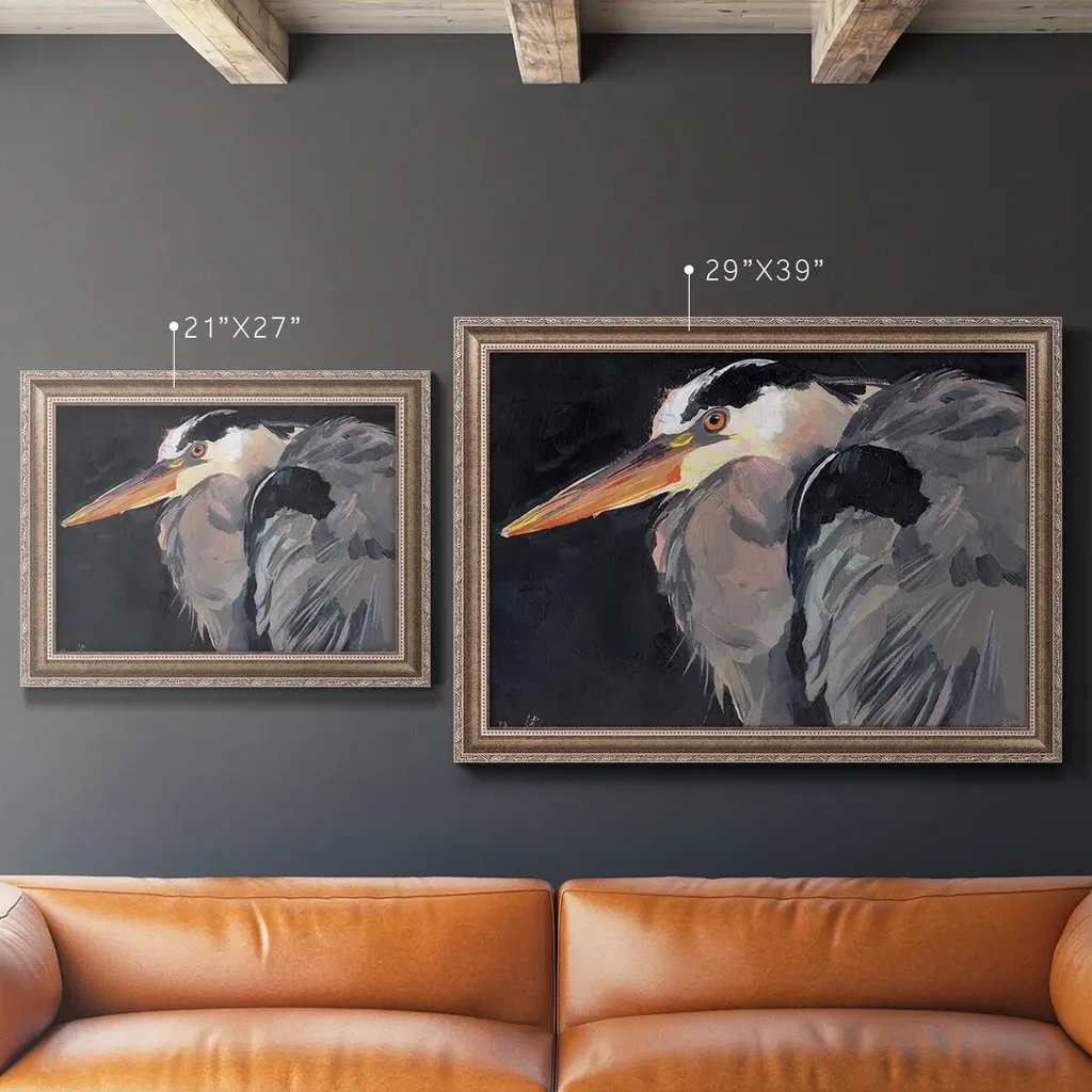 Great Heron II Premium Framed Canvas- Ready to Hang A Premium Framed Canvas created to last. Framed in distressed wood and available in an array of sizes and colors Featuring a beveled a solid wood stretcher bar, each piece comes ready to hand 3 SIZES AVAILABLE 16''X20'' - Overall Size 18'X27'' - Overall Size 24''x36'' - Overall Size Each piece is made to order. Each piece comes with hanging hardware. Made in the USA Ready to Hang Giclee Paper Print Acrylic Glass Beveled Matt Board