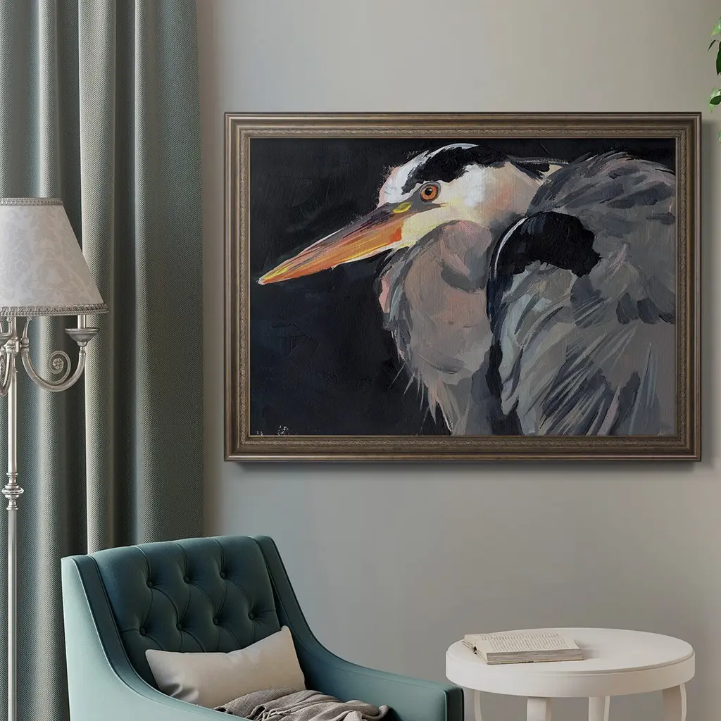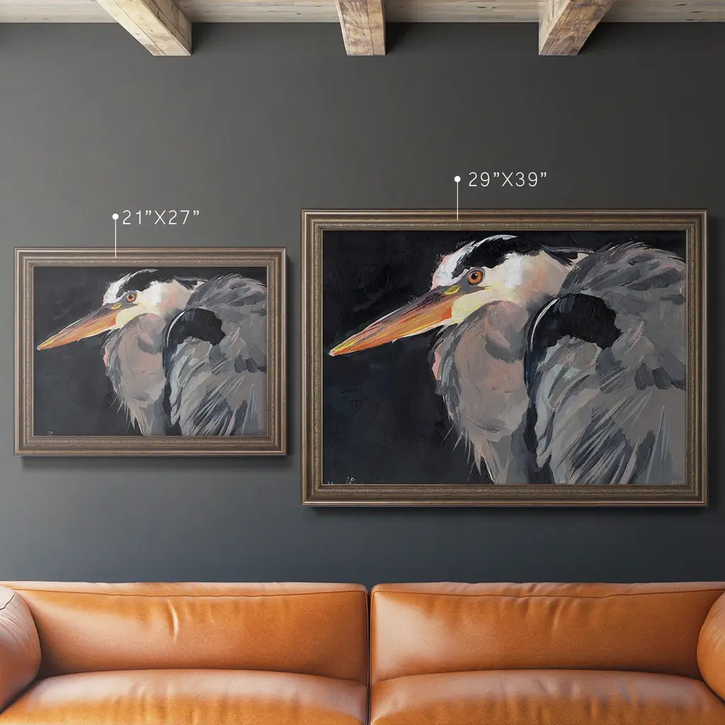 Great Heron II Premium Framed Canvas- Ready to Hang A Premium Framed Canvas created to last. Framed in distressed wood and available in an array of sizes and colors Featuring a beveled a solid wood stretcher bar, each piece comes ready to hand 3 SIZES AVAILABLE 16''X20'' - Overall Size 18'X27'' - Overall Size 24''x36'' - Overall Size Each piece is made to order. Each piece comes with hanging hardware. Made in the USA Ready to Hang Giclee Paper Print Acrylic Glass Beveled Matt Board