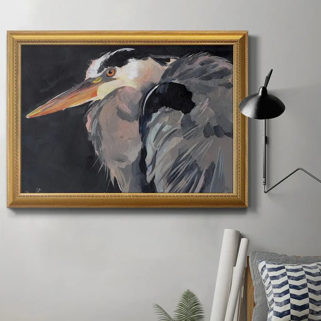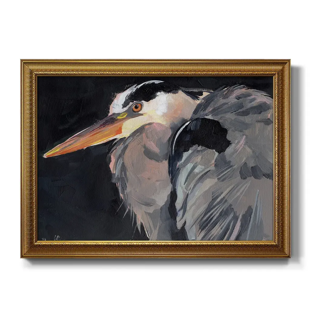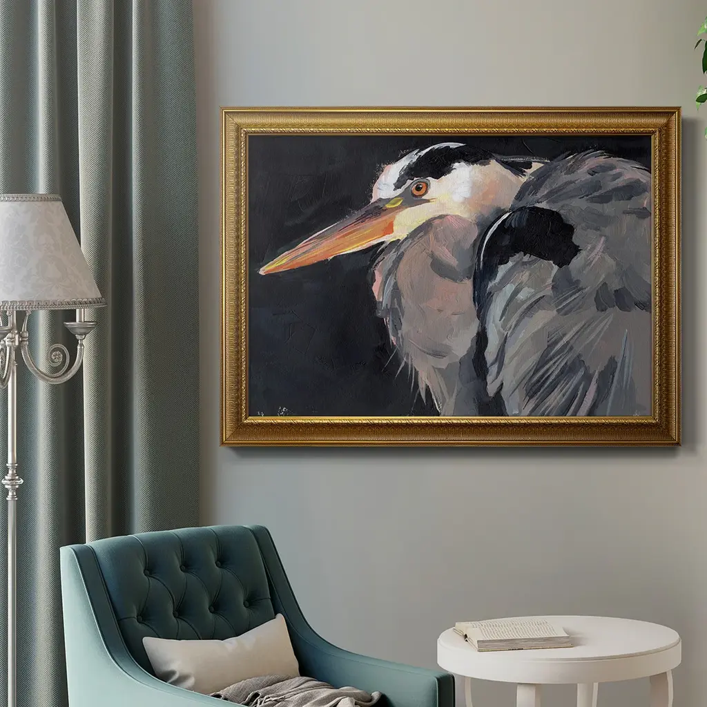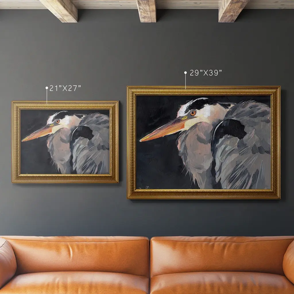 Great Heron II Premium Framed Canvas- Ready to Hang A Premium Framed Canvas created to last. Framed in distressed wood and available in an array of sizes and colors Featuring a beveled a solid wood stretcher bar, each piece comes ready to hand 3 SIZES AVAILABLE 16''X20'' - Overall Size 18'X27'' - Overall Size 24''x36'' - Overall Size Each piece is made to order. Each piece comes with hanging hardware. Made in the USA Ready to Hang Giclee Paper Print Acrylic Glass Beveled Matt Board