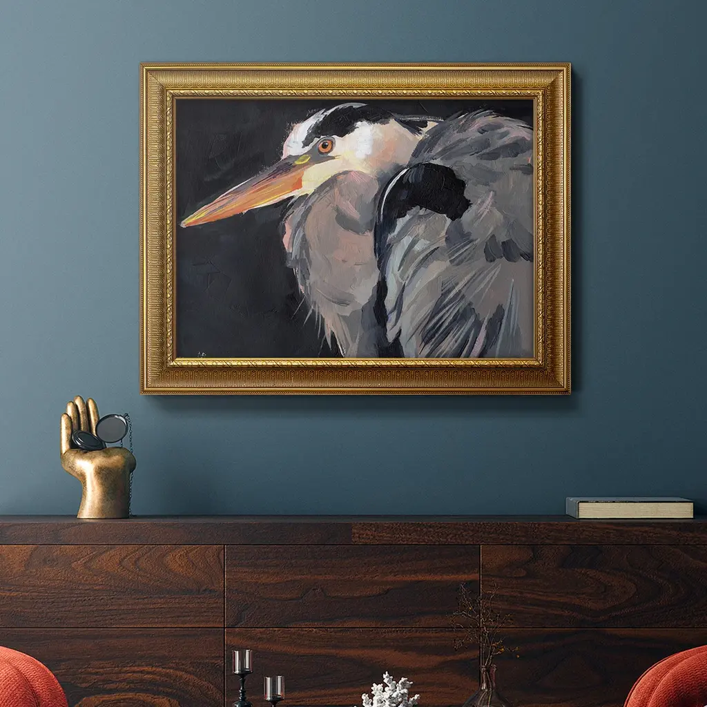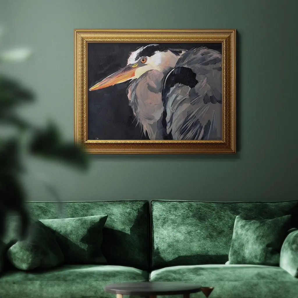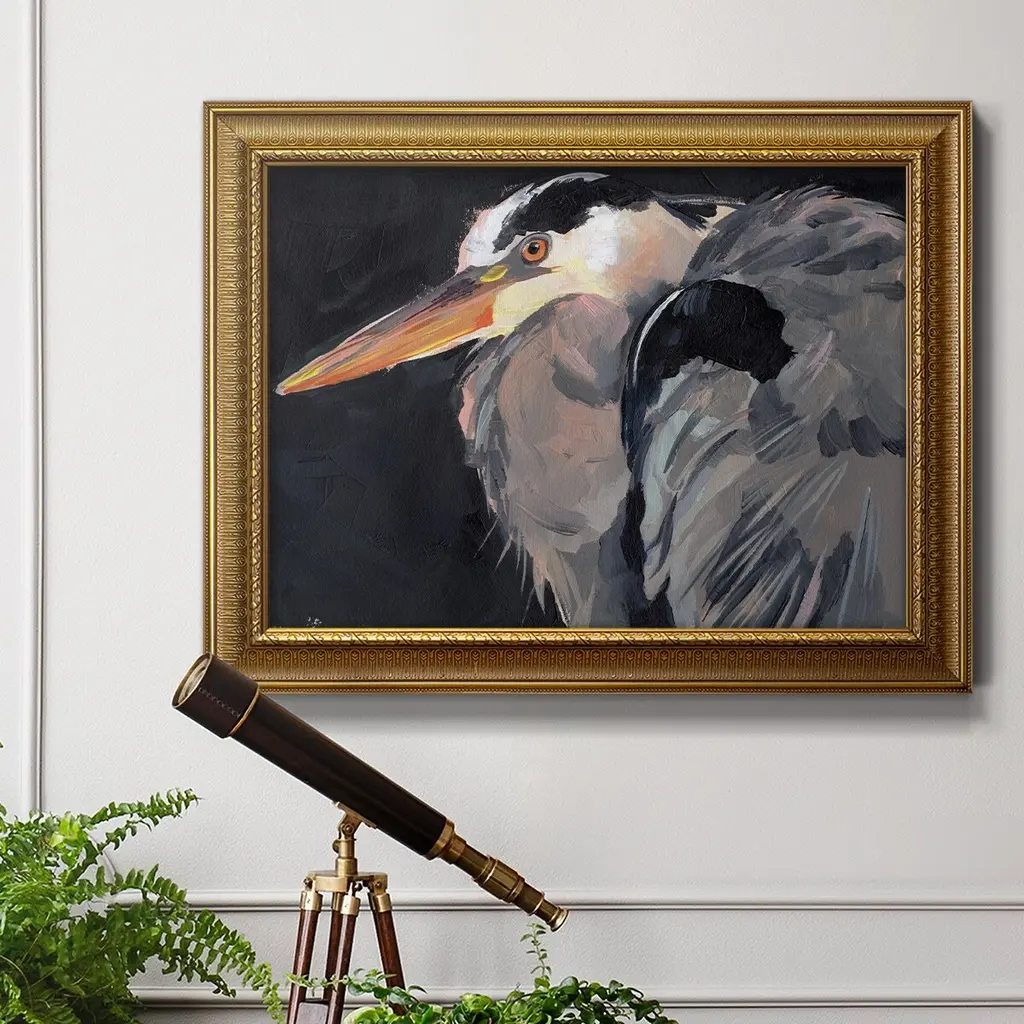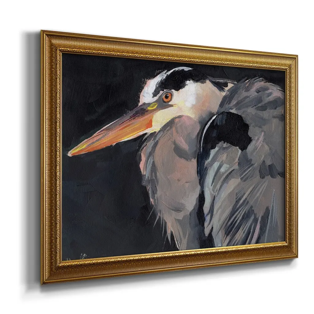 Great Heron II Premium Framed Canvas- Ready to Hang A Premium Framed Canvas created to last. Framed in distressed wood and available in an array of sizes and colors Featuring a beveled a solid wood stretcher bar, each piece comes ready to hand 3 SIZES AVAILABLE 16''X20'' - Overall Size 18'X27'' - Overall Size 24''x36'' - Overall Size Each piece is made to order. Each piece comes with hanging hardware. Made in the USA Ready to Hang Giclee Paper Print Acrylic Glass Beveled Matt Board