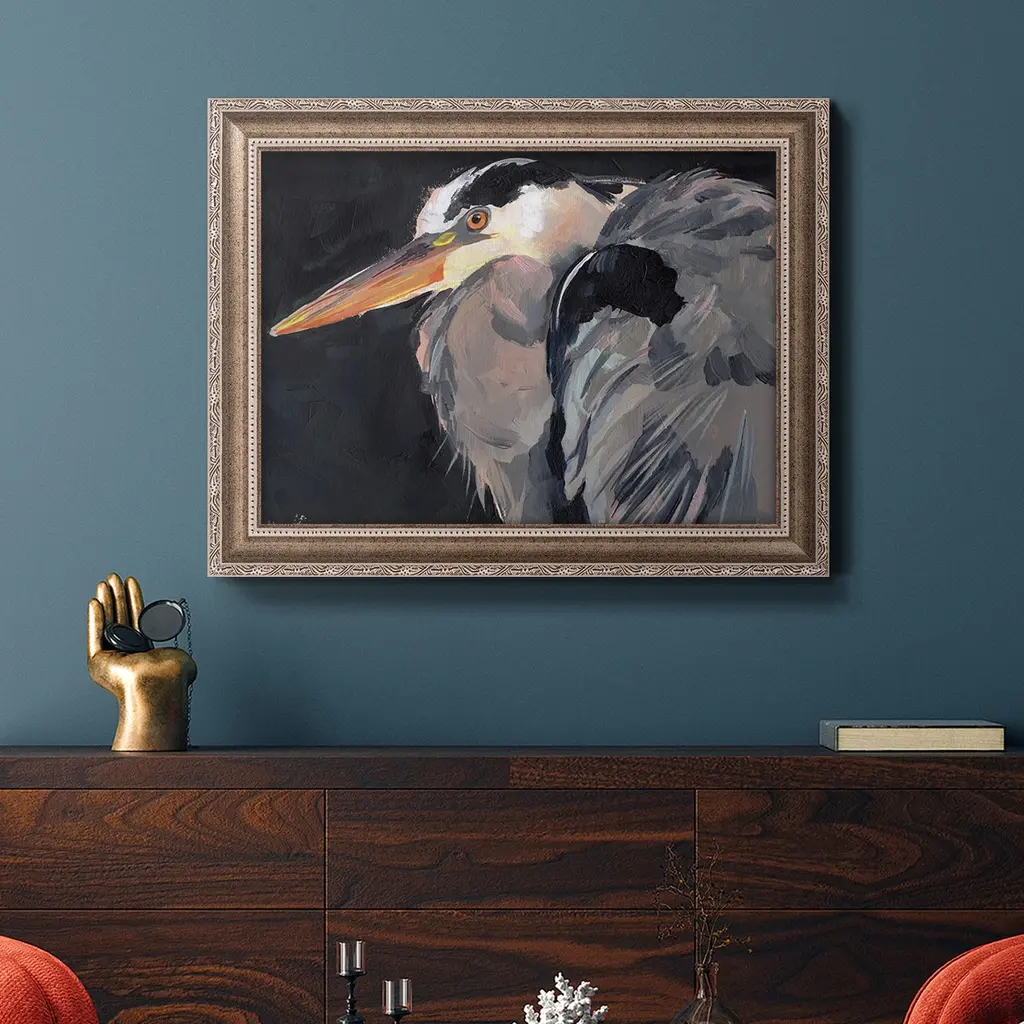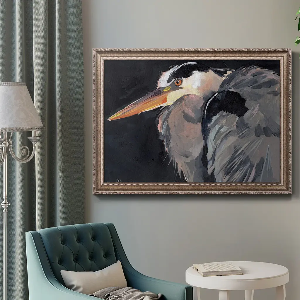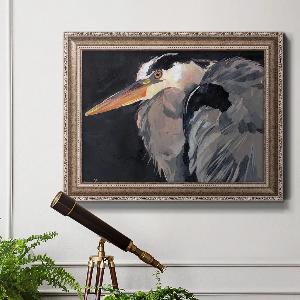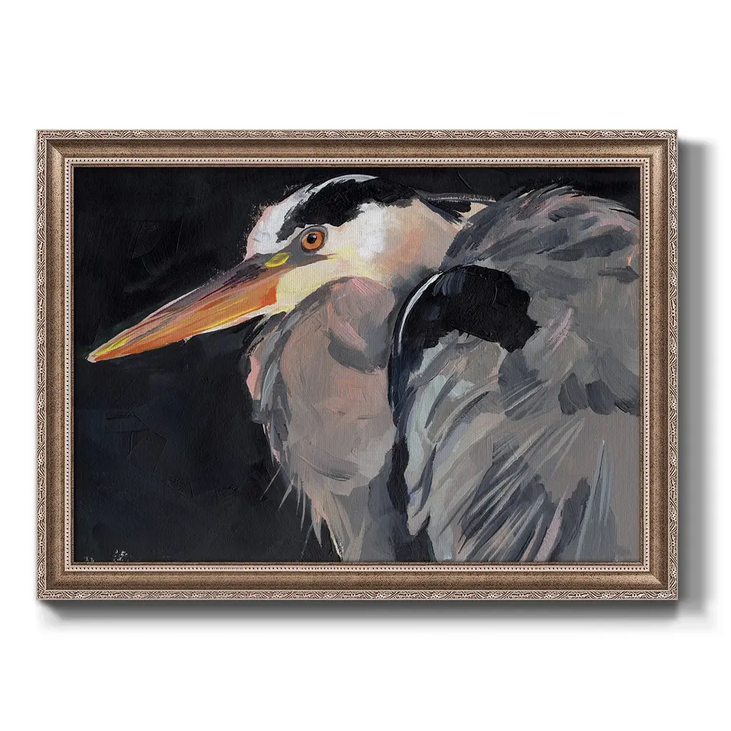 Great Heron II Premium Framed Canvas- Ready to Hang A Premium Framed Canvas created to last. Framed in distressed wood and available in an array of sizes and colors Featuring a beveled a solid wood stretcher bar, each piece comes ready to hand 3 SIZES AVAILABLE 16''X20'' - Overall Size 18'X27'' - Overall Size 24''x36'' - Overall Size Each piece is made to order. Each piece comes with hanging hardware. Made in the USA Ready to Hang Giclee Paper Print Acrylic Glass Beveled Matt Board