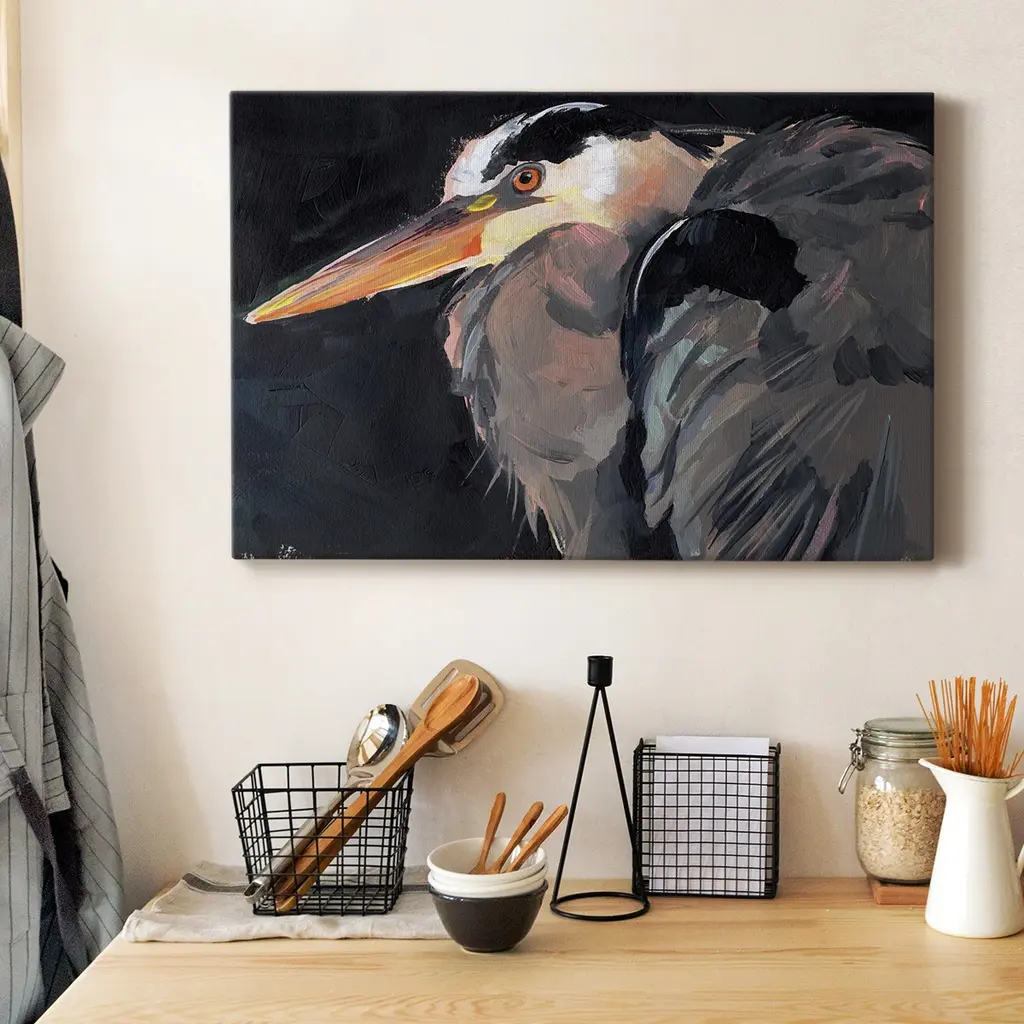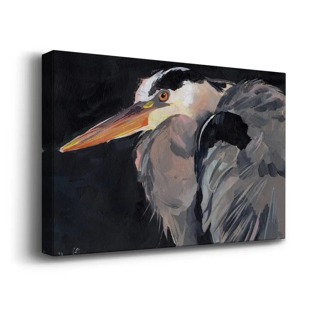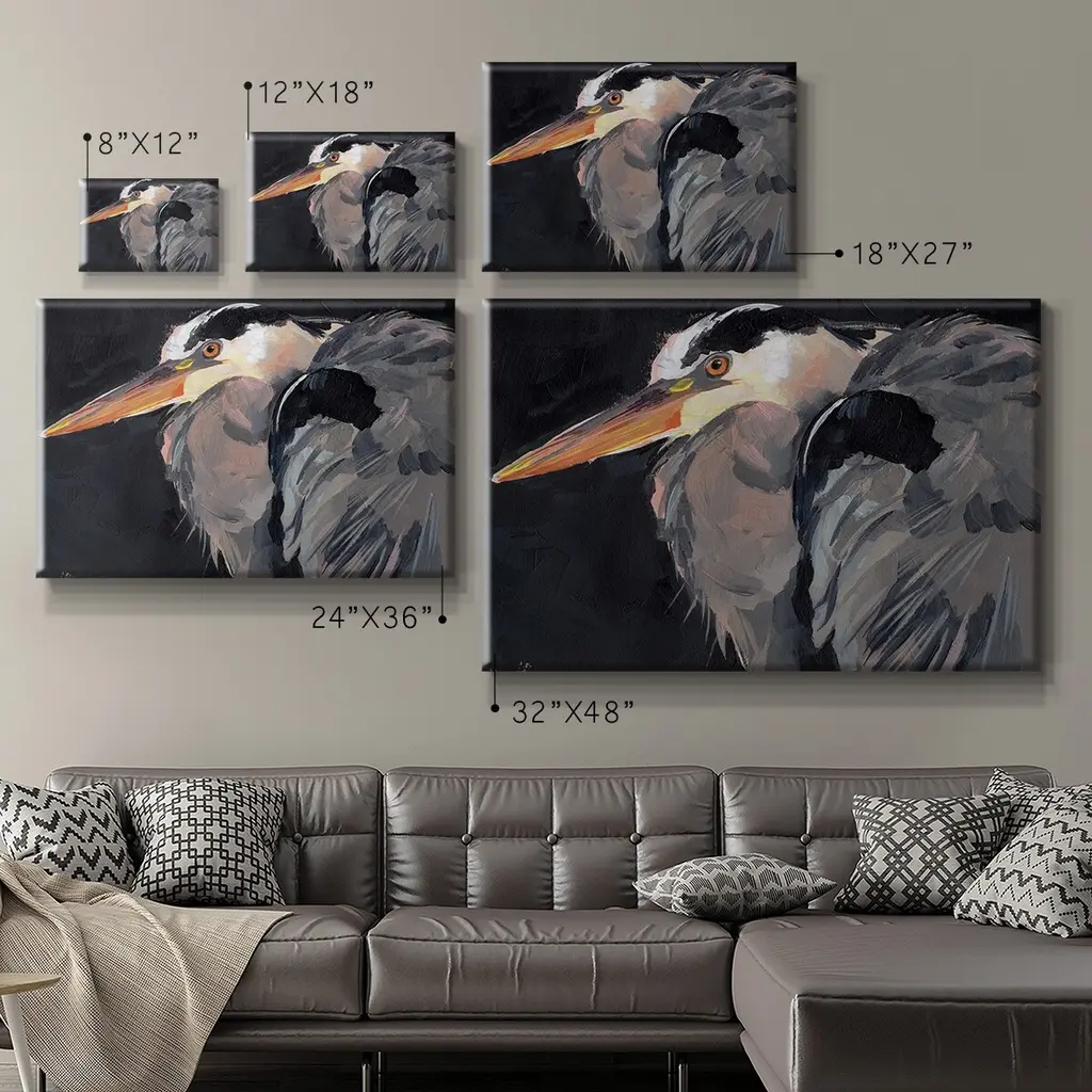 Great Heron II Premium Gallery Wrapped Canvas - Ready to Hang A premium hand stretched gallery wrapped canvas print created to last. Featuring a beveled a solid wood stretcher bar, each piece comes ready to hand 6 SIZES AVAILABLE 8''X12'' - Overall Size 12''X18'' - Overall Size 18''X27'' - Overall Size 24''x36'' - Overall Size 32''x48'' - Overall Size 40''x60'' - Overall Size Each piece is made to order. Built to Last Each piece comes ready to hang Solid wood stretcher Fade and Water resistant Made domestically